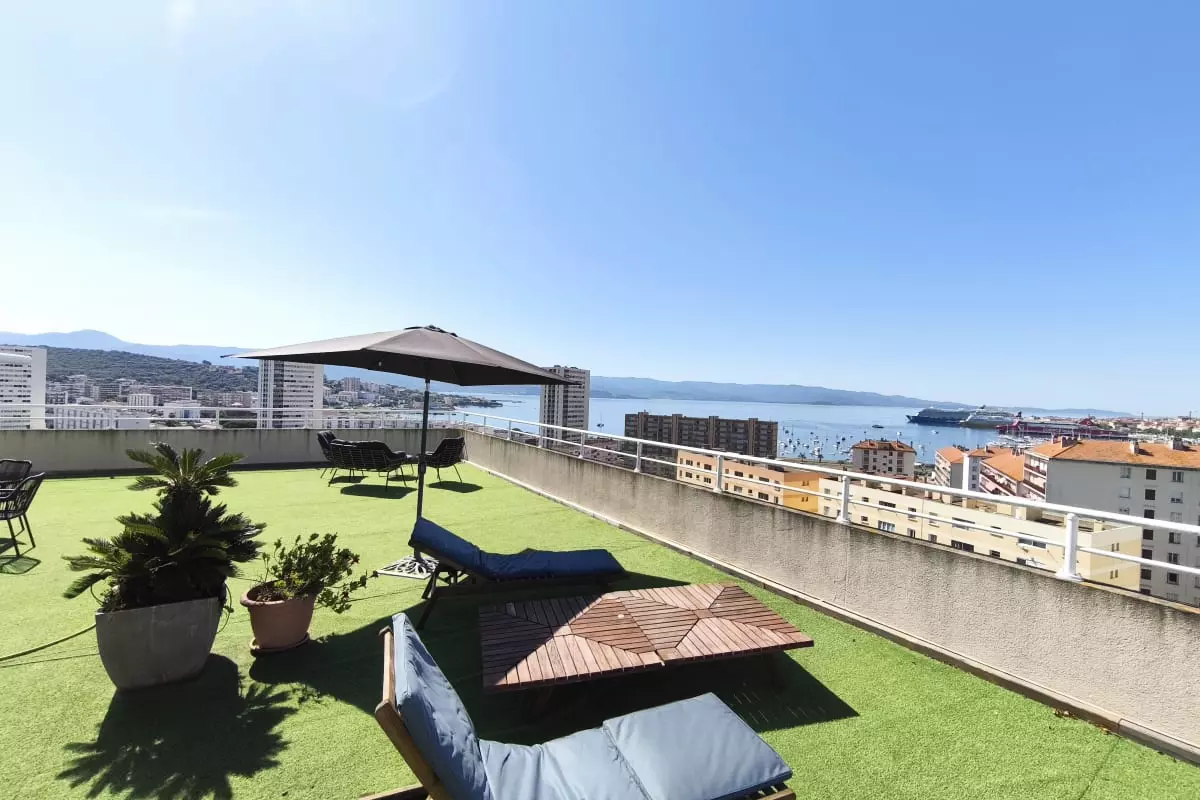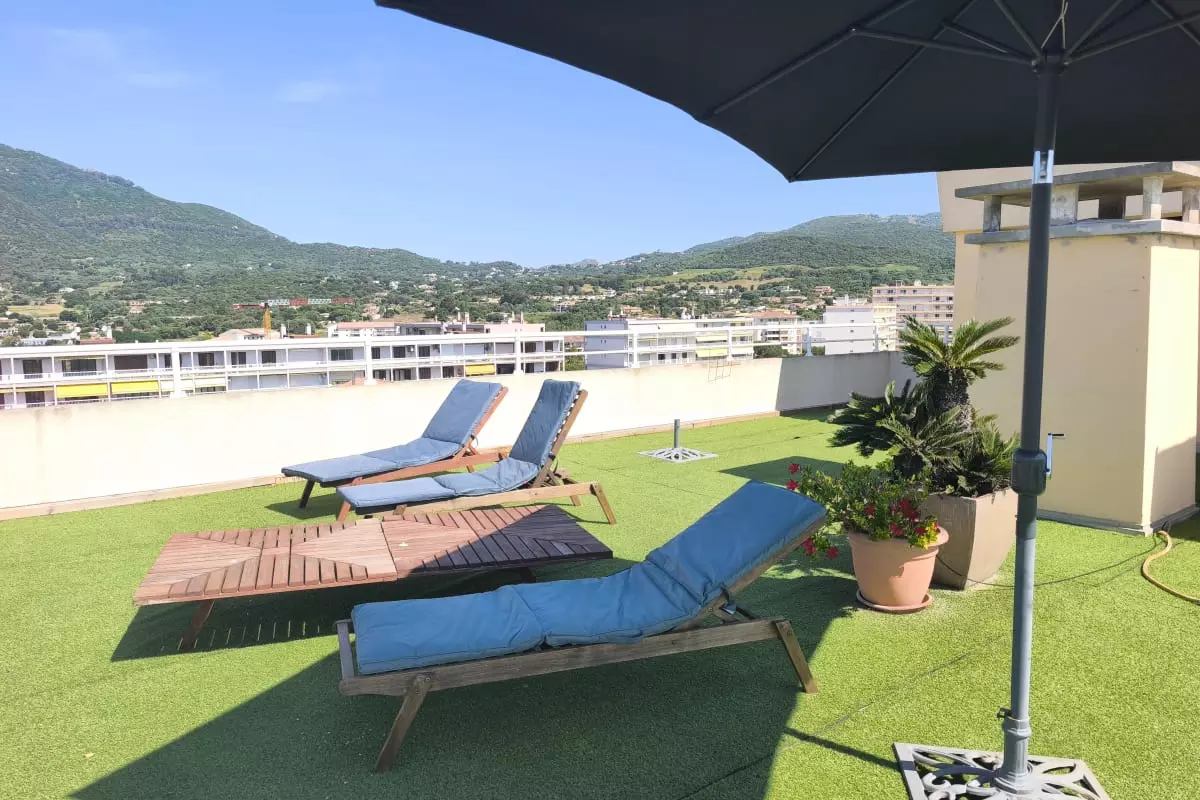 Exclusively, you will particularly appreciate, day and night, its exceptional fully equipped 350m2 roof terrace with parasol, electric awning, garden furniture, dining table and chairs, teak sun loungers. All this with a breathtaking 360 degree view over the entire bay of Ajaccio, the mountains and the city.