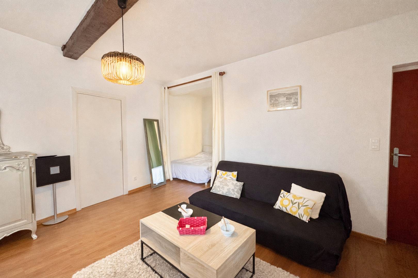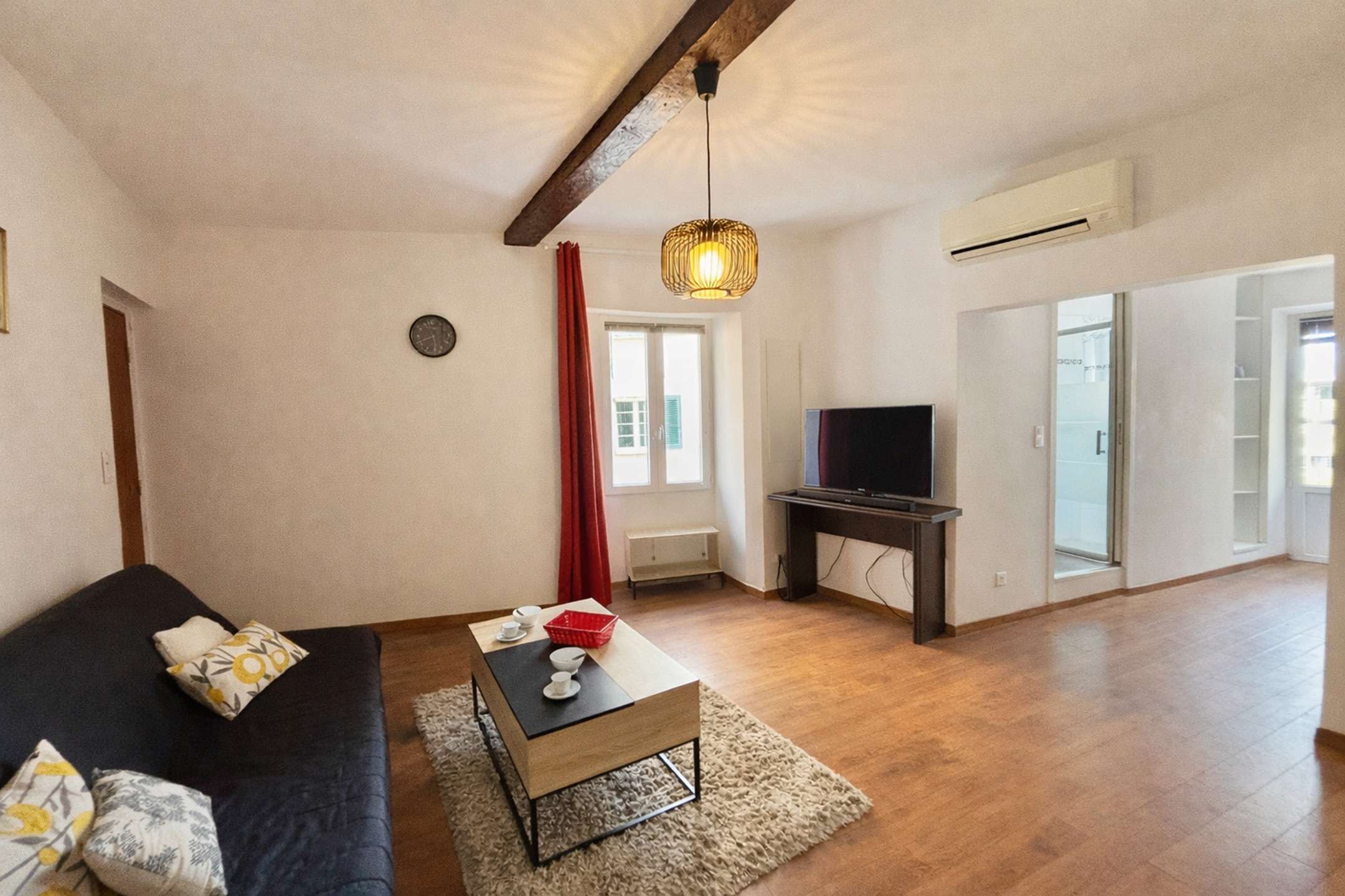 The apartment, located on the 3rd floor (no elevator), has been renovated while retaining its original charm. It features an air-conditioned living room with a sleeping area (double bed) and a lounge area with a sofa bed (double), a fully equipped kitchen, a bathroom with toilet, and a window overlooking the market square and the port.