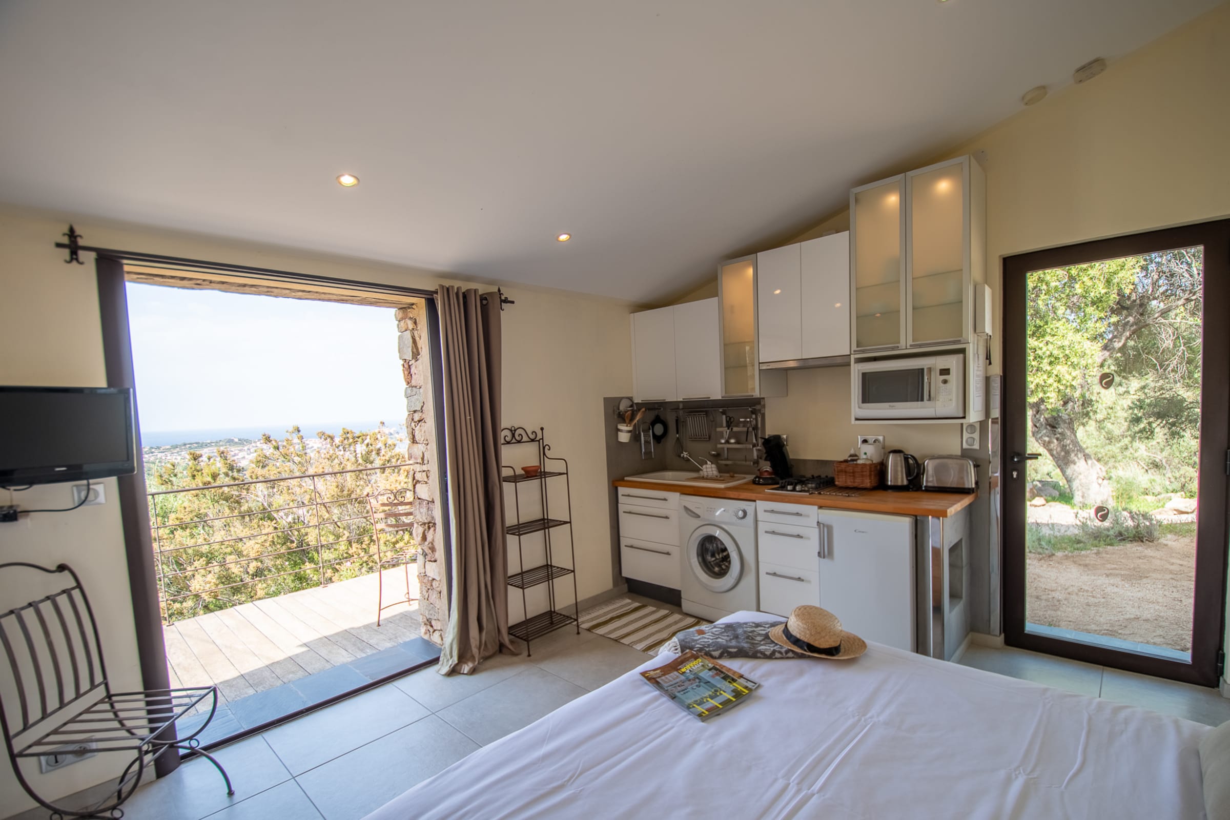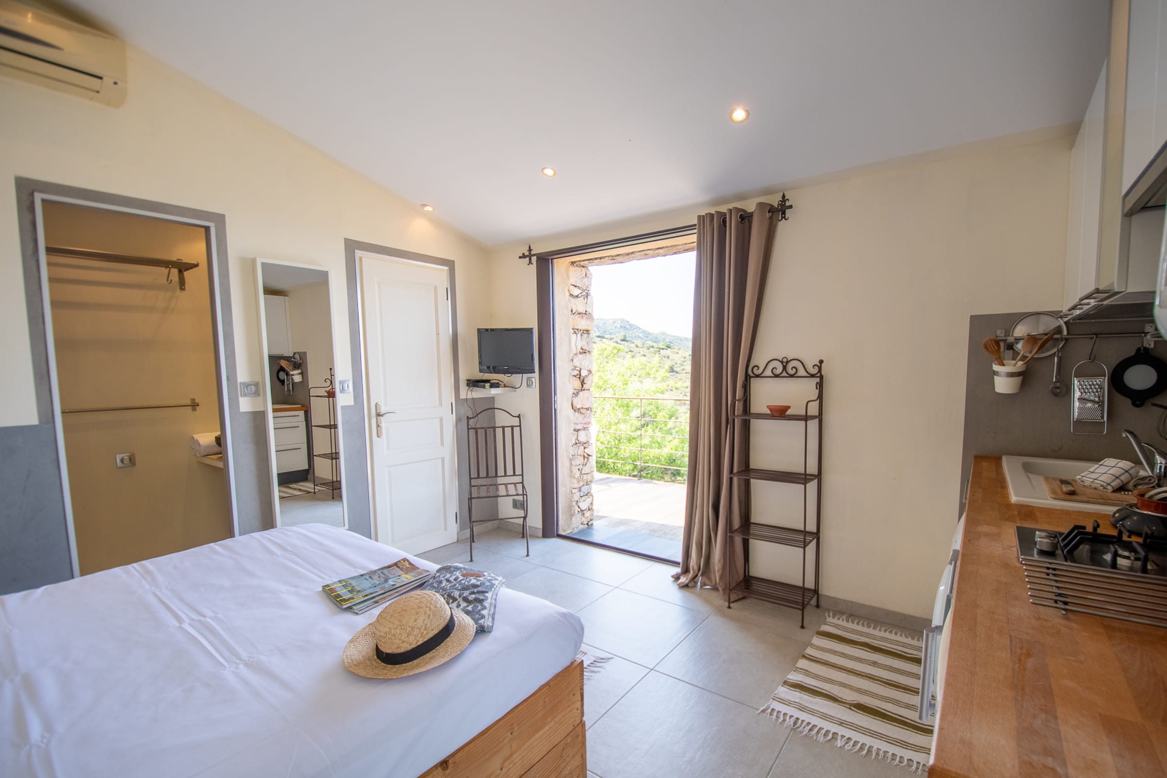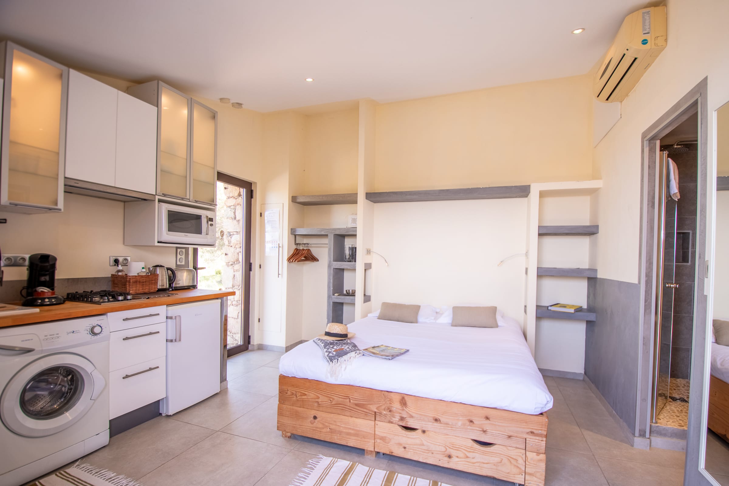 The house is at the heart of lush nature, offering total immersion in the une conciergerie of the island of beauty. The interior is carefully arranged to maximize space and comfort, making this studio perfect for couples or solo travelers. The main room, bright and airy, is equipped with a comfortable double bed and a small functional kitchen where visitors can prepare simple meals. A modern bathroom with shower completes the interior layout.