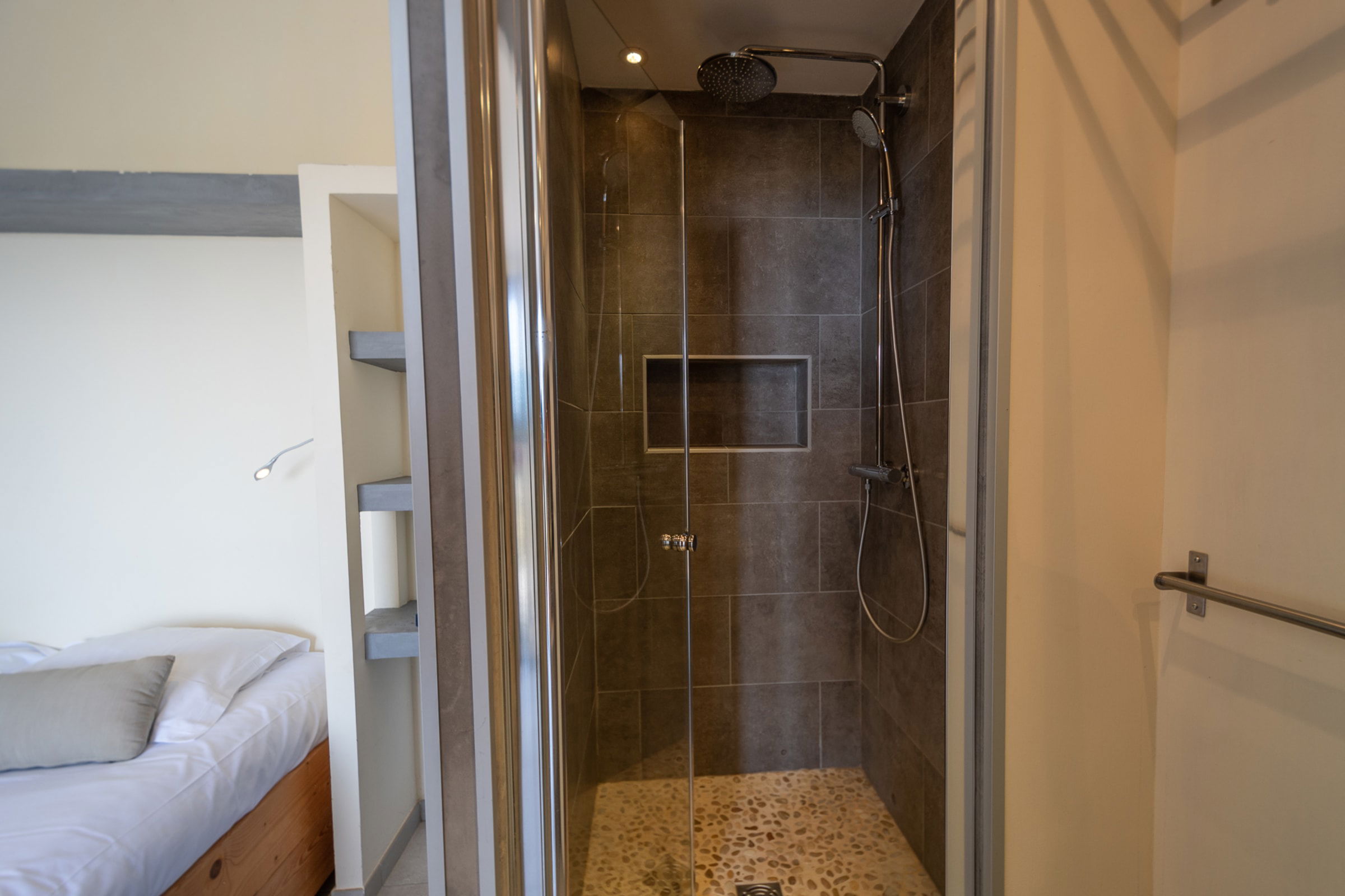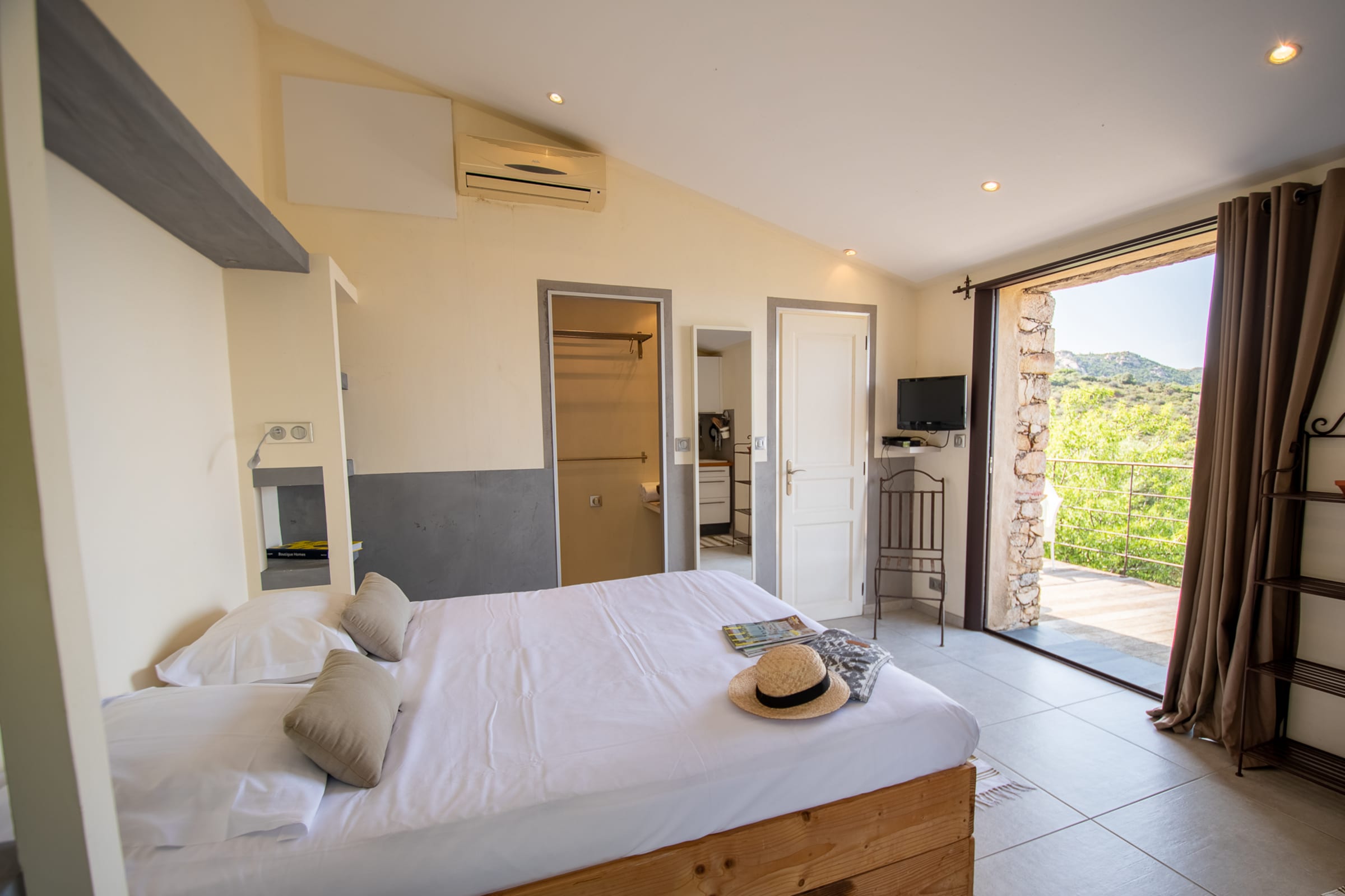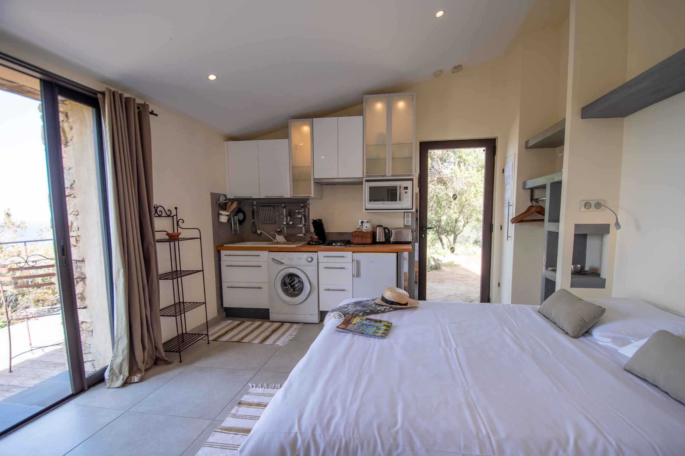 The house is at the heart of lush nature, offering total immersion in the une conciergerie of the island of beauty. The interior is carefully arranged to maximize space and comfort, making this studio perfect for couples or solo travelers. The main room, bright and airy, is equipped with a comfortable double bed and a small functional kitchen where visitors can prepare simple meals. A modern bathroom with shower completes the interior layout.