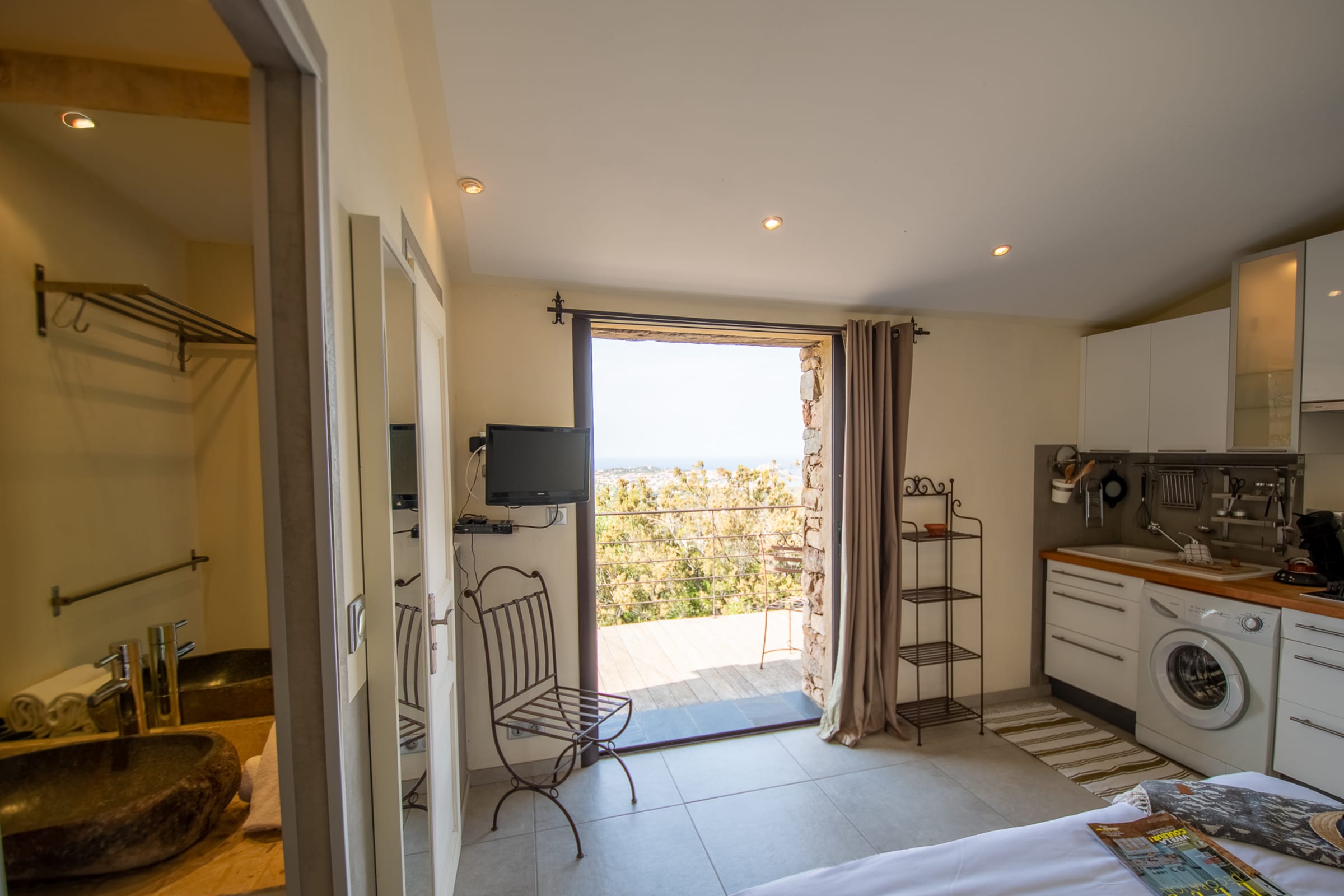 A breathtaking view of the Bay of Calvi. It is located within an estate comprising 5 sheepfolds on 17 hectares overlooking the bay and the town of Calvi. This studio includes a main room with a 160 cm bed and a fully equipped kitchen area with a dishwasher, washing machine, an oven, and a coffee maker, toaster, and kettle. You have a bathroom with a shower and a hairdryer. Sheets and towels, end-of-stay cleaning, and tourist taxes are included in our rates. Nestled in the idyllic landscape of Corsica, near Calvi, this charming independent studio house offers an exceptional living environment, combining privacy and access to a shared pool and tennis court. Just a 5-minute drive from the vibrant center of Calvi and its crystal-clear beaches, this retreat is perfect for those seeking tranquility while staying close to urban amenities and local attractions.