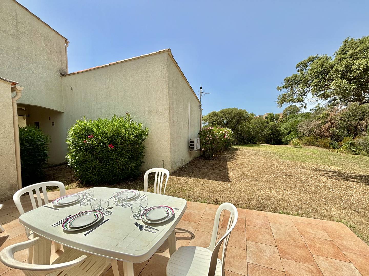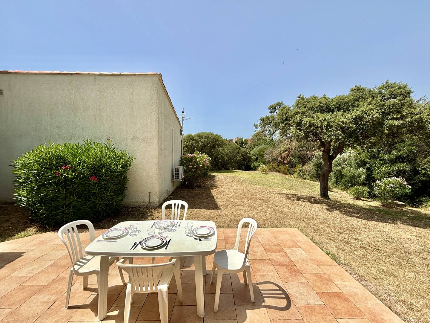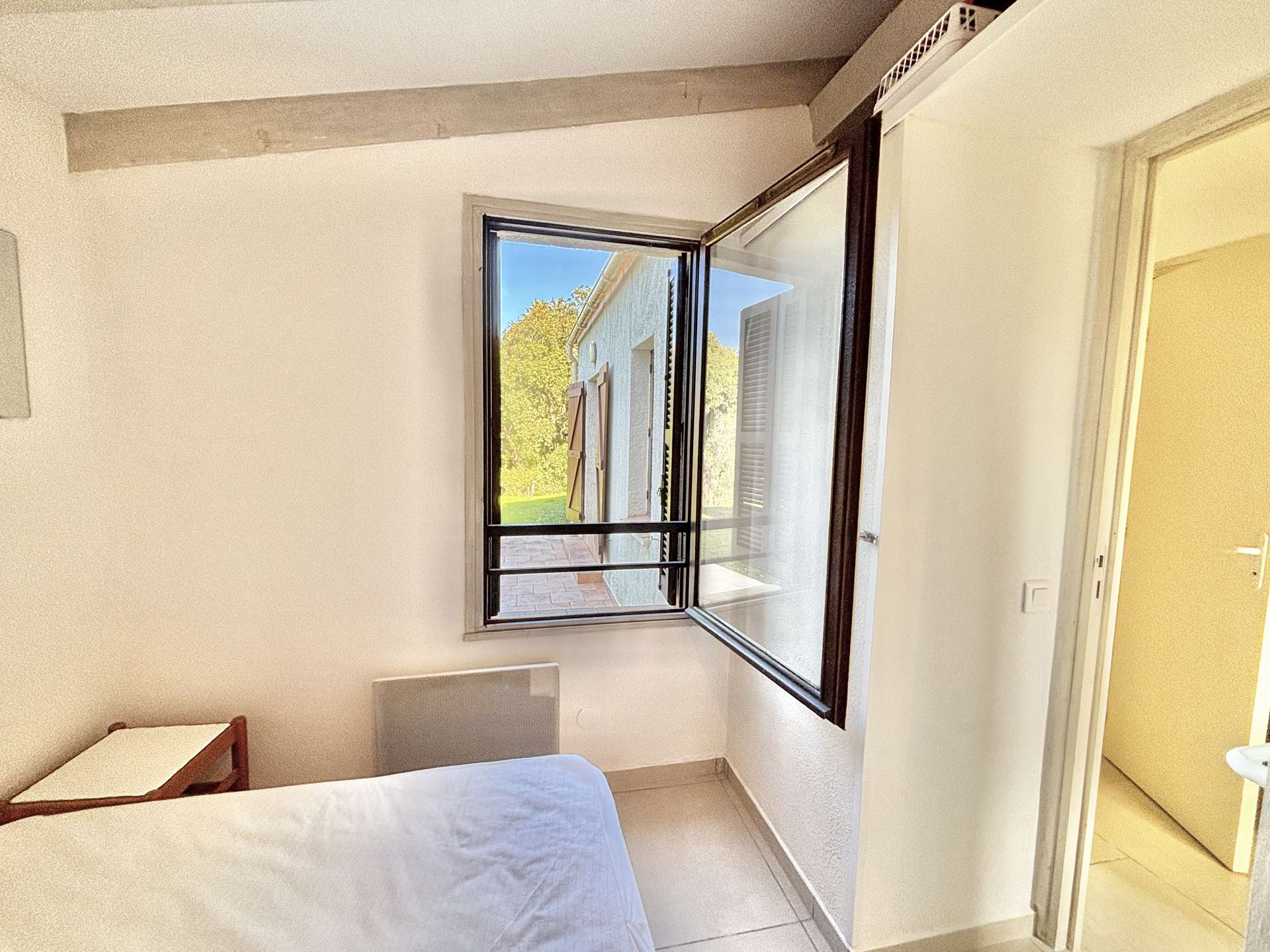 The proposed apartment, type F2, is located on the ground floor, not overlooked, it includes: an entrance with storage, a main room with kitchen area opening onto the living room dining room with convertible sofa (bed 140) overlooking on the terrace with garden and maquis view, a bedroom with double bed, a bathroom and a separate toilet.