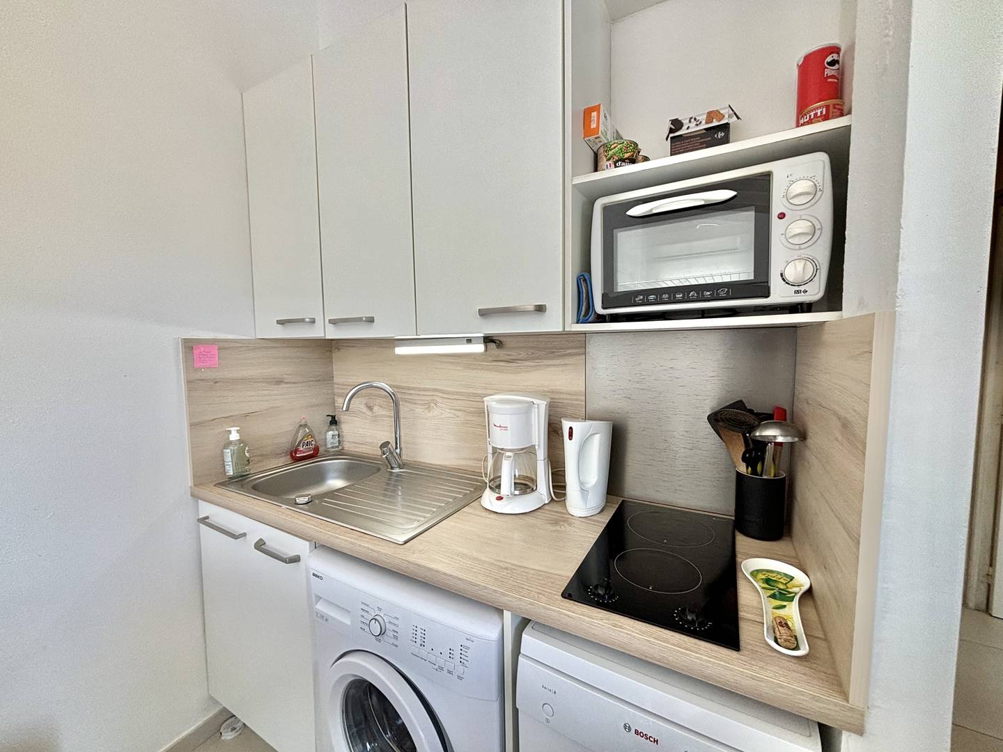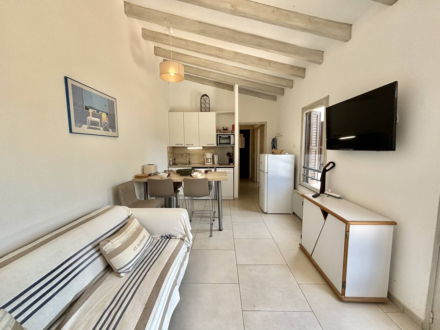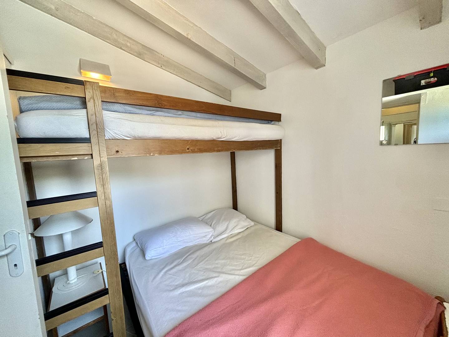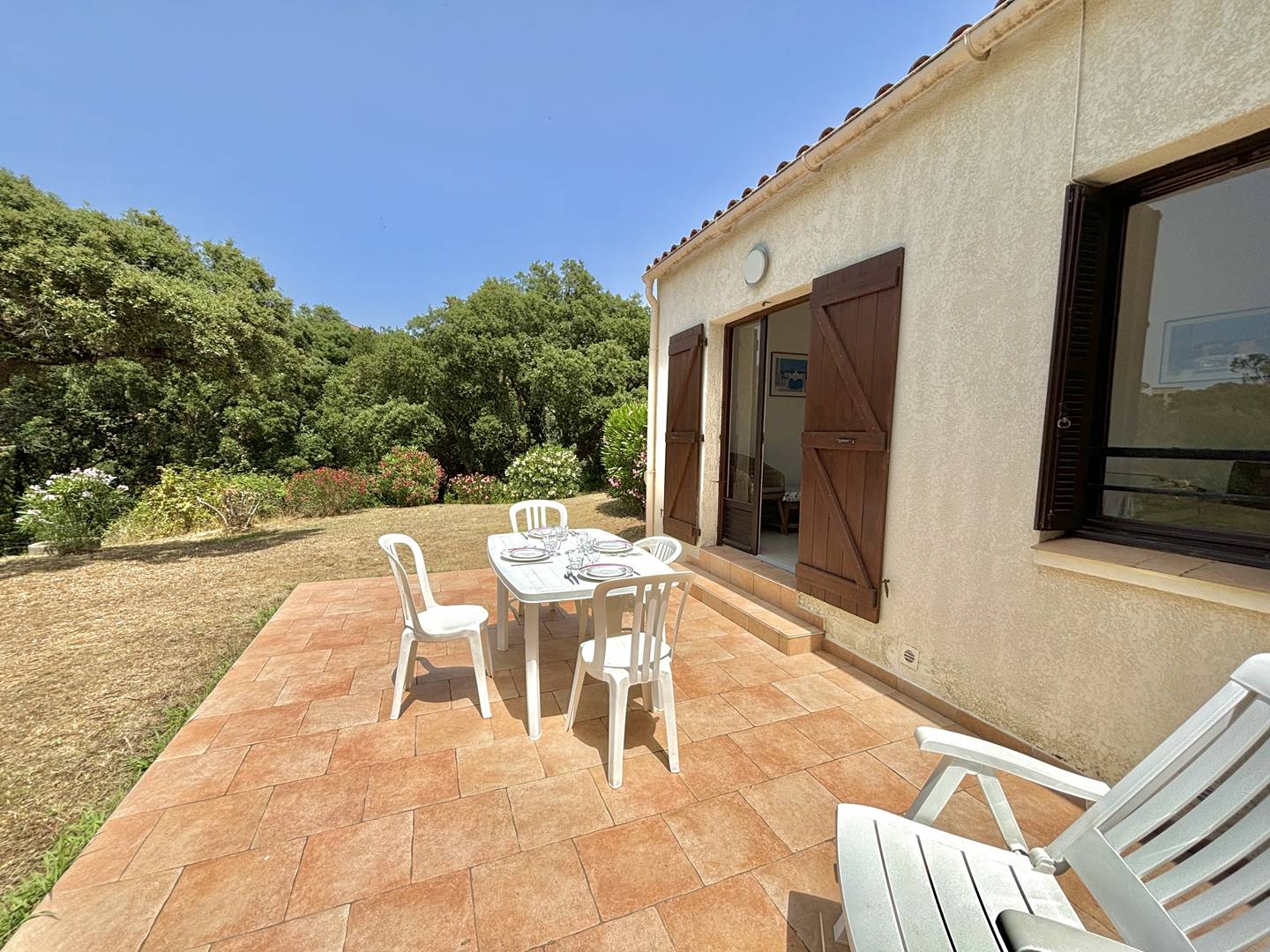 The proposed apartment, type F2, is located on the ground floor, not overlooked, it includes: an entrance with storage, a main room with kitchen area opening onto the living room dining room with convertible sofa (bed 140) overlooking on the terrace with garden and maquis view, a bedroom with double bed, a bathroom and a separate toilet.