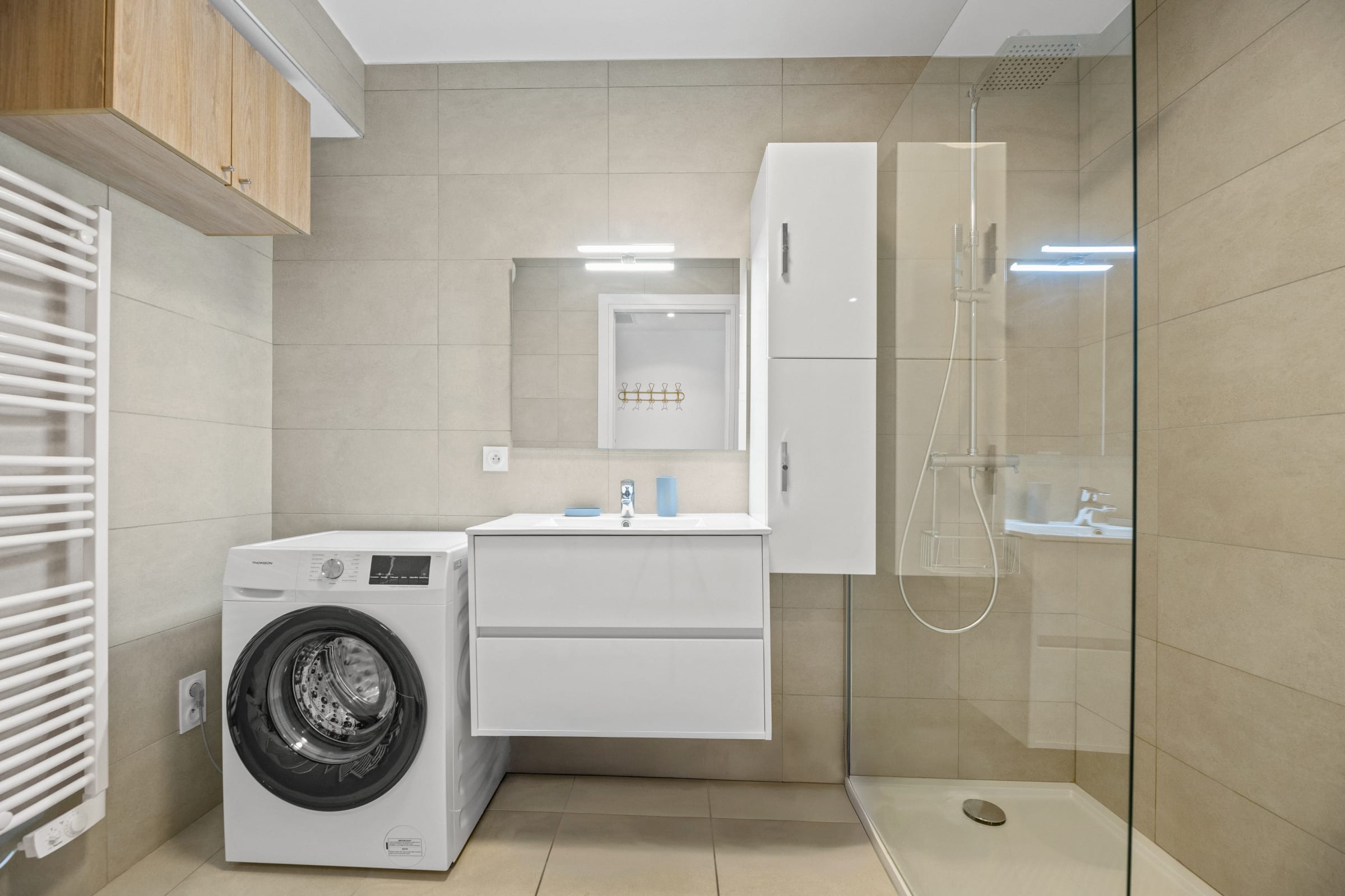 The air-conditioned sleeping area welcomes you with a foldaway double bed (140x200 cm) and practical storage spaces to make you feel at home. The elegant and functional bathroom features a shower, a wall-mounted toilet, and a stylish towel warmer, with towels provided for your comfort. A washing machine, steamer, and drying rack are also available for your convenience.