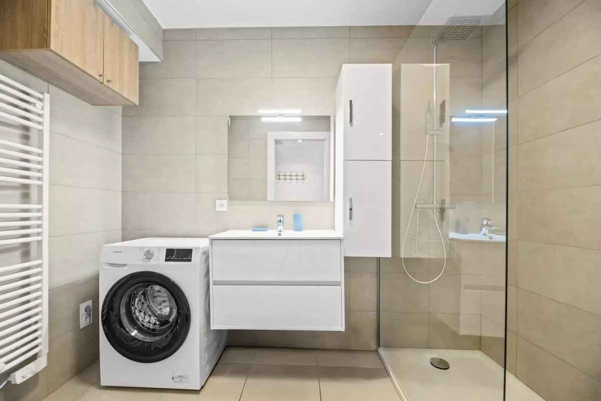 The air-conditioned sleeping area welcomes you with a fold-away double bed (140x200 cm) and practical storage to make you feel right at home. The elegant and functional bathroom offers a shower, a wall-mounted toilet, and a designer towel dryer, with towels included for your comfort. A washing machine, a steamer, and a clothes horse are also at your disposal.