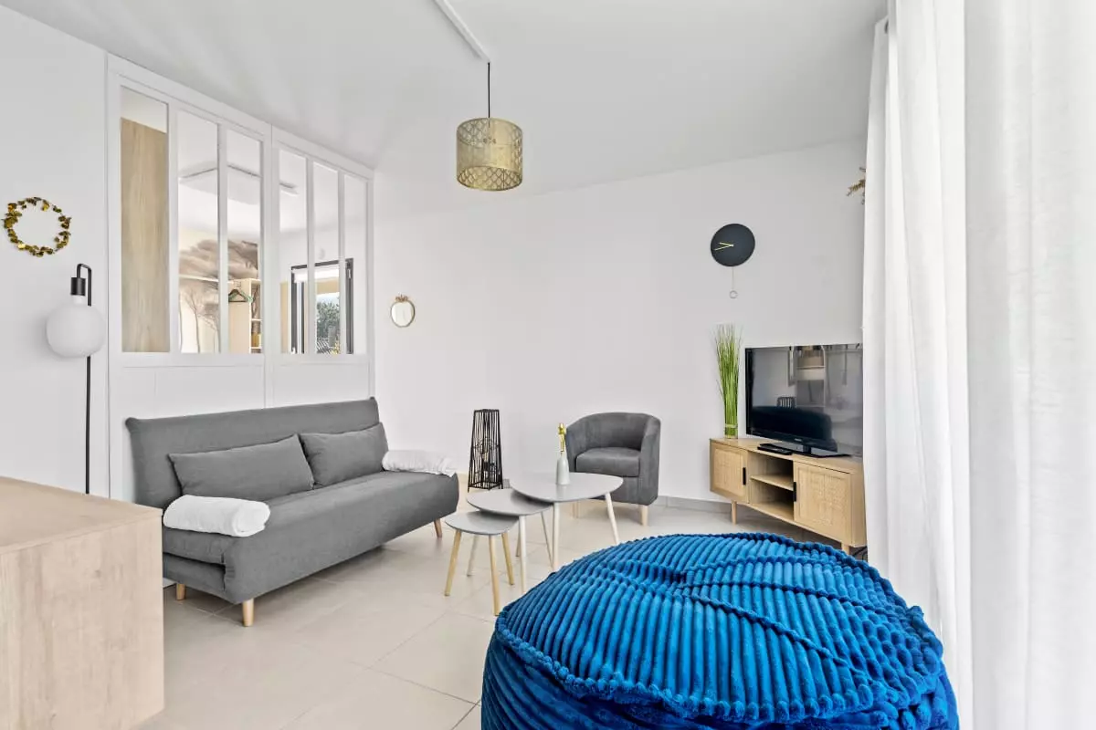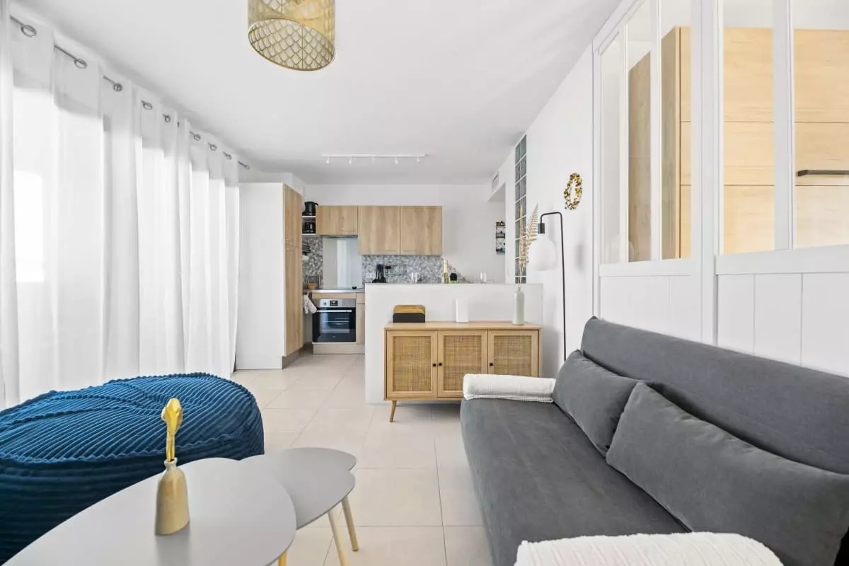 Inside, every detail has been designed to make your stay as enjoyable as possible. The cozy living room, equipped with a two-seater sofa and a TV, is the perfect place to relax after a day of adventure, whether at the beach or on the hiking trails. The modern, fully equipped kitchen (ceramic hob, microwave, Nespresso coffee machine, and refrigerator with freezer) will allow you to prepare delicious meals to enjoy with ease.