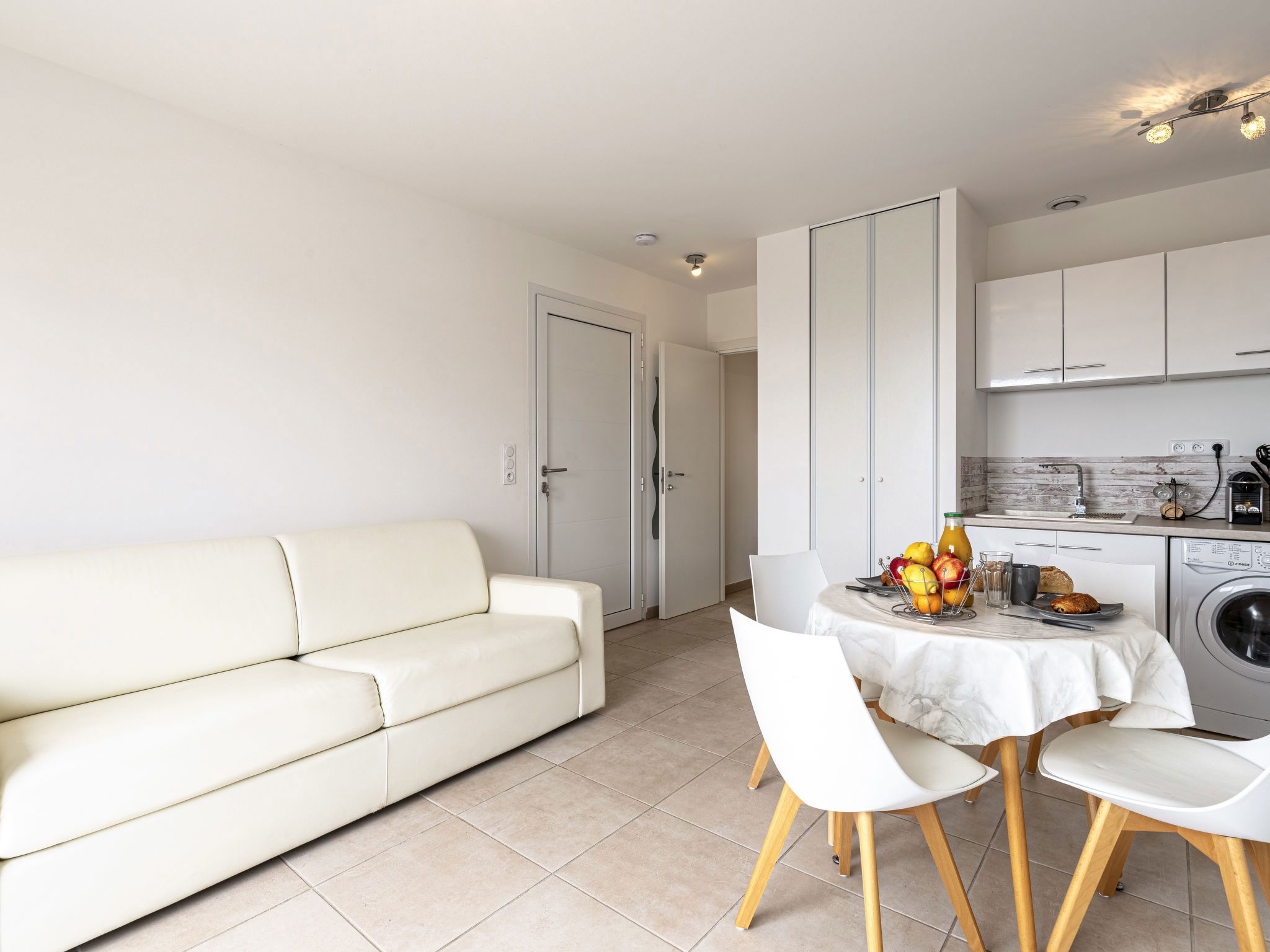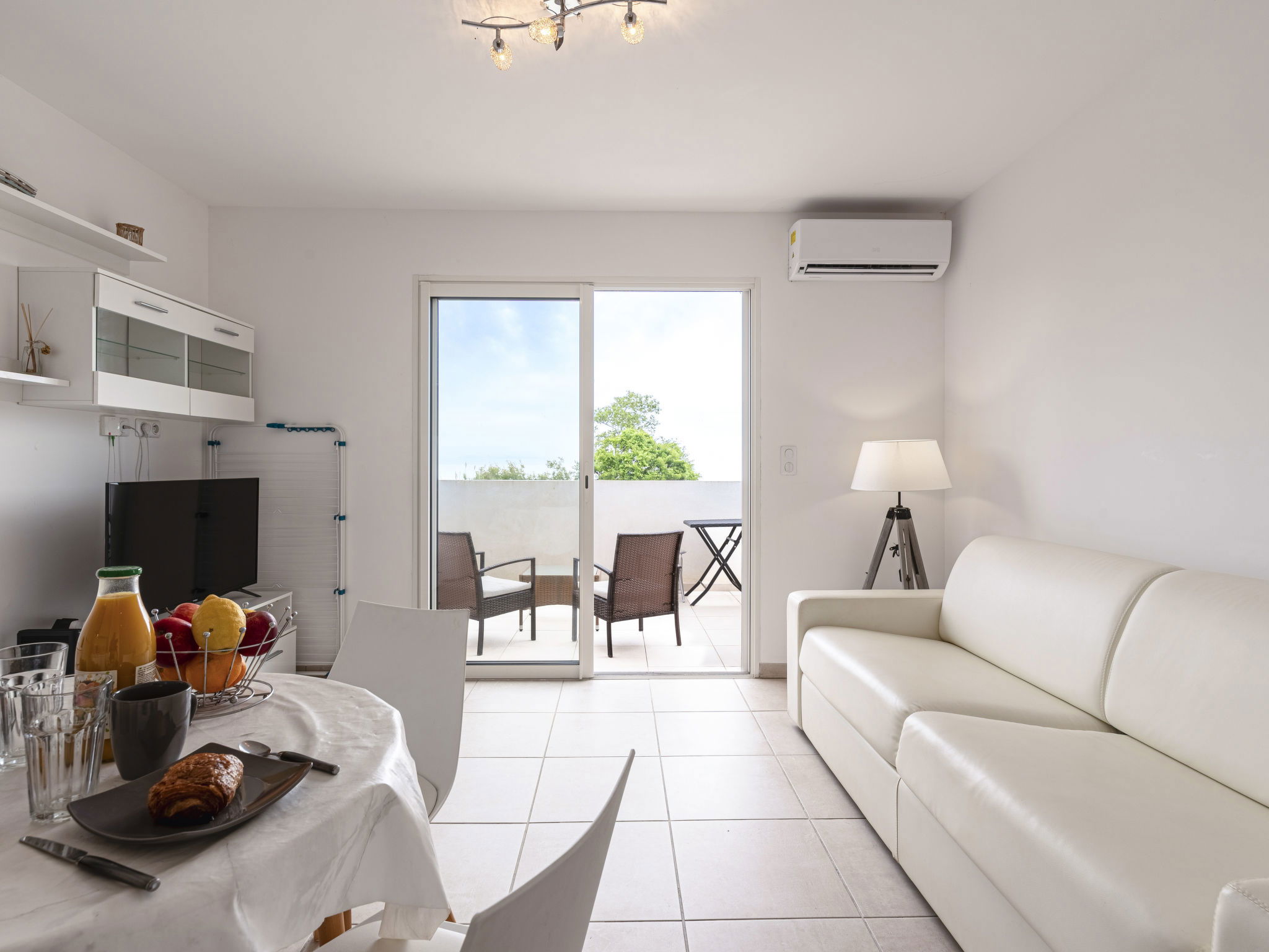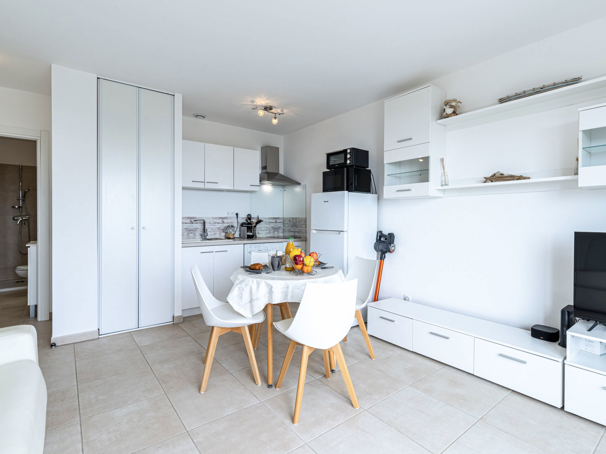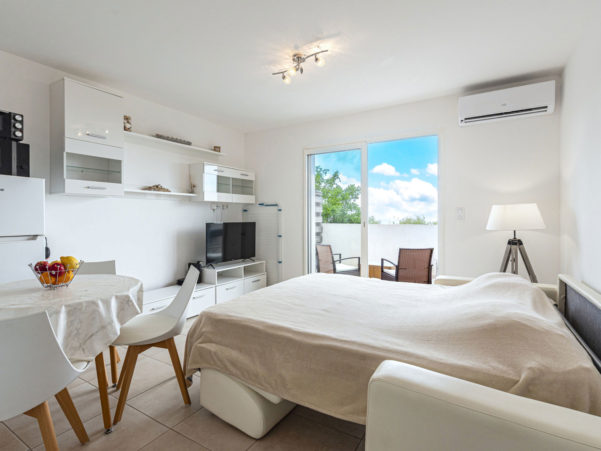 "Brigitte", 1-room studio 23 m2 on 1st floor. Comfortable furnishings: living/sleeping room with 1 sofabed (160 cm, length 200 cm), dining table and TV (flat screen). Exit to the terrace. Kitchen-/living room (2 induction hot plates, toaster, kettle, microwave, electric coffee machine). Shower/WC. Electric heating, air-conditioning. Terrace 10 m2, east facing position. Terrace furniture, deck chairs (1). Beautiful view of the sea. Facilities: washing machine. Internet (WiFi). Parking space n 33. Please note: smoke alarm. Offer by a private individual according to Art. 155, IV of CGI.