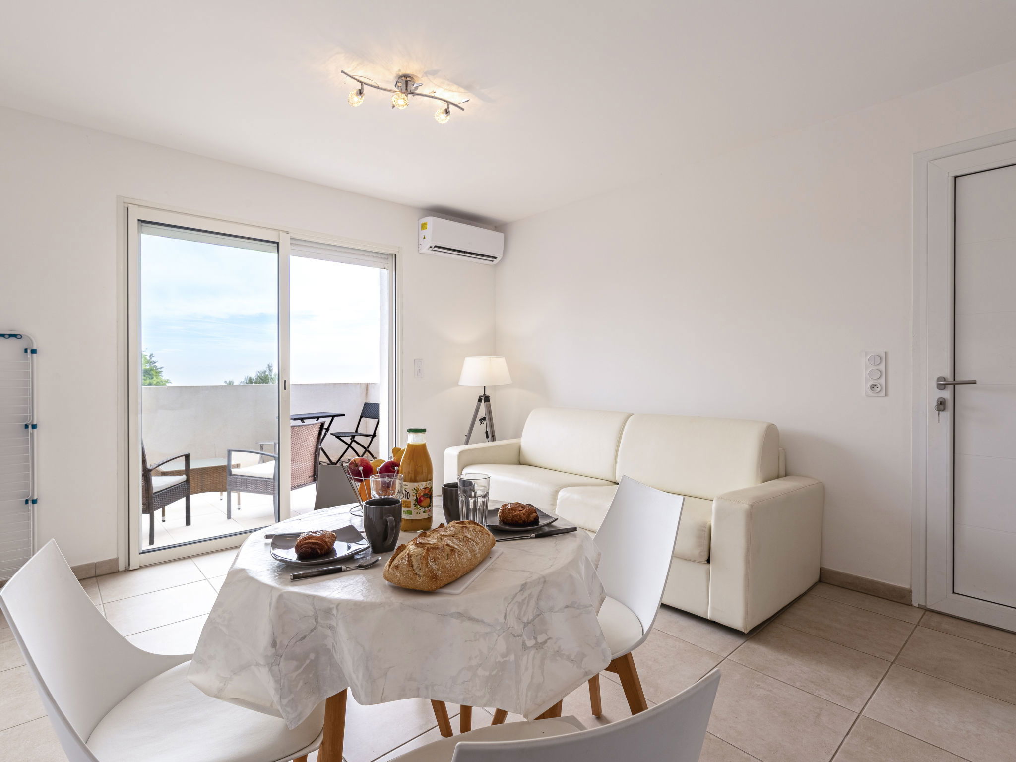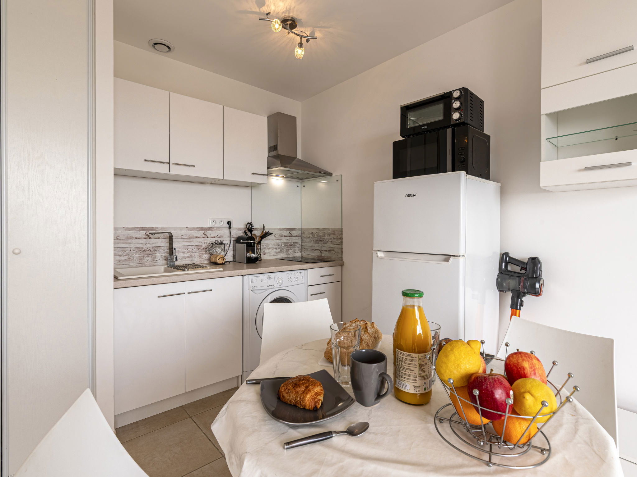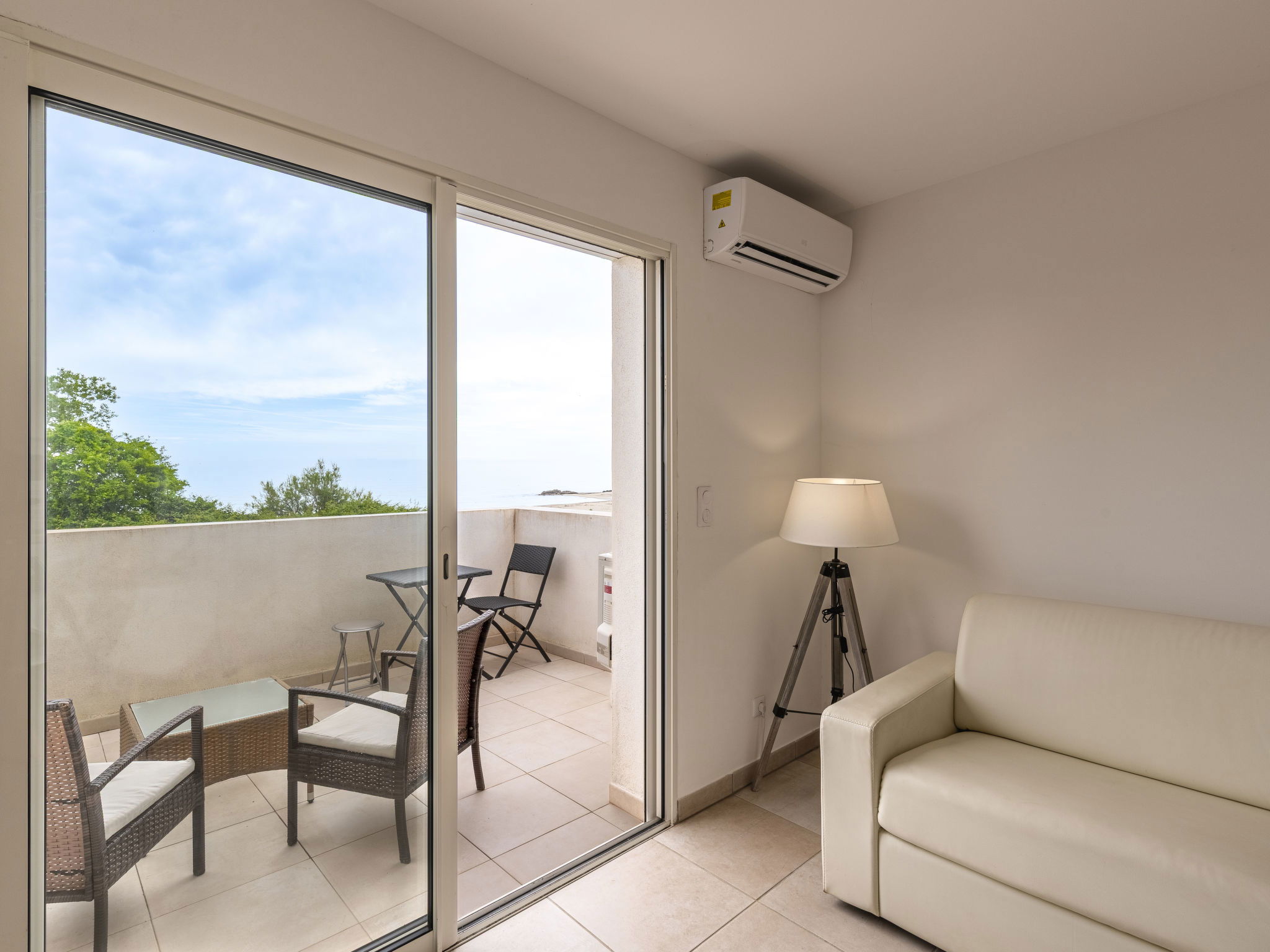 "Brigitte", 1-room studio 23 m2 on 1st floor. Comfortable furnishings: living/sleeping room with 1 sofabed (160 cm, length 200 cm), dining table and TV (flat screen). Exit to the terrace. Kitchen-/living room (2 induction hot plates, toaster, kettle, microwave, electric coffee machine). Shower/WC. Electric heating, air-conditioning. Terrace 10 m2, east facing position. Terrace furniture, deck chairs (1). Beautiful view of the sea. Facilities: washing machine. Internet (WiFi). Parking space n 33. Please note: smoke alarm. Offer by a private individual according to Art. 155, IV of CGI.
