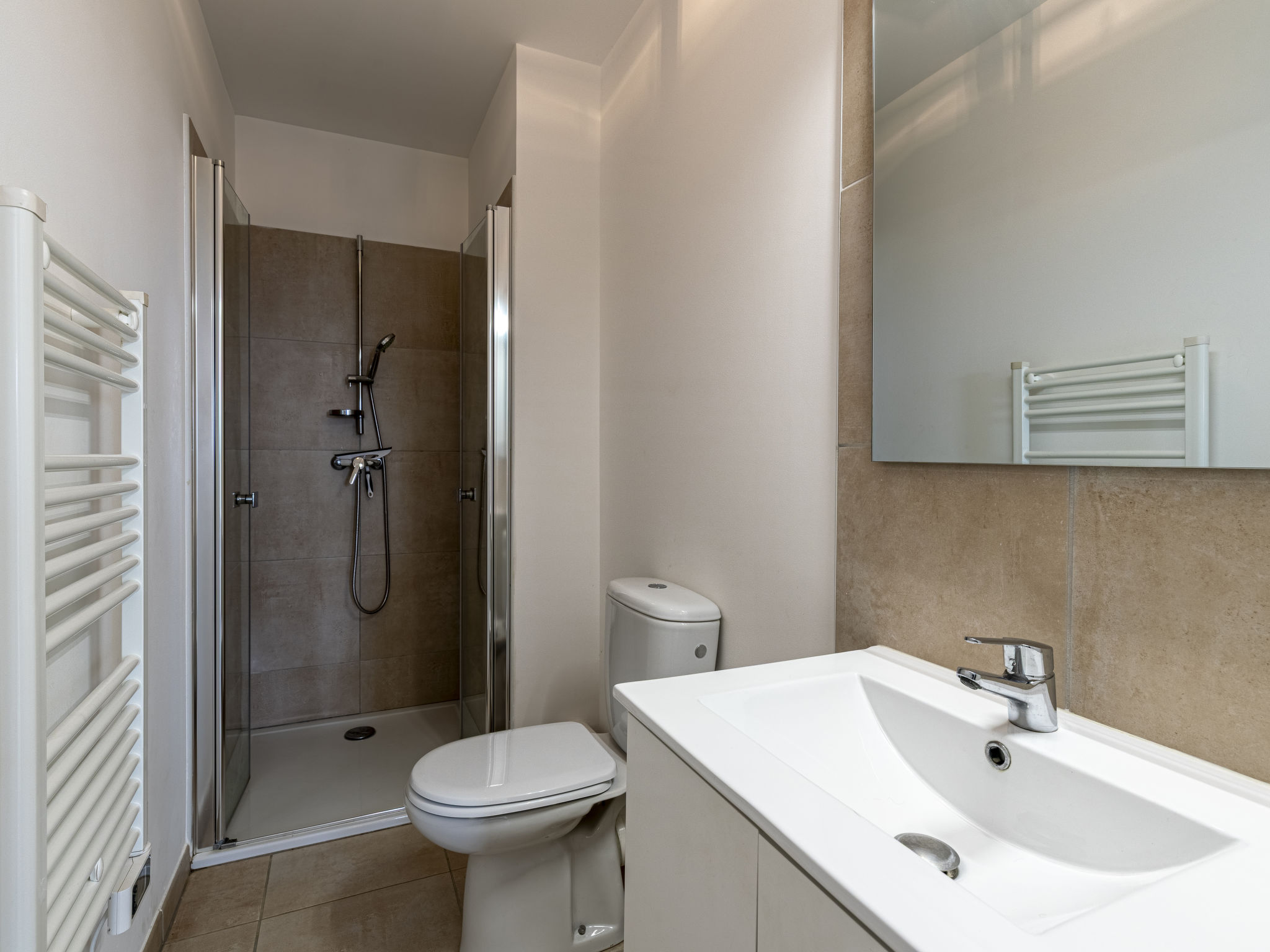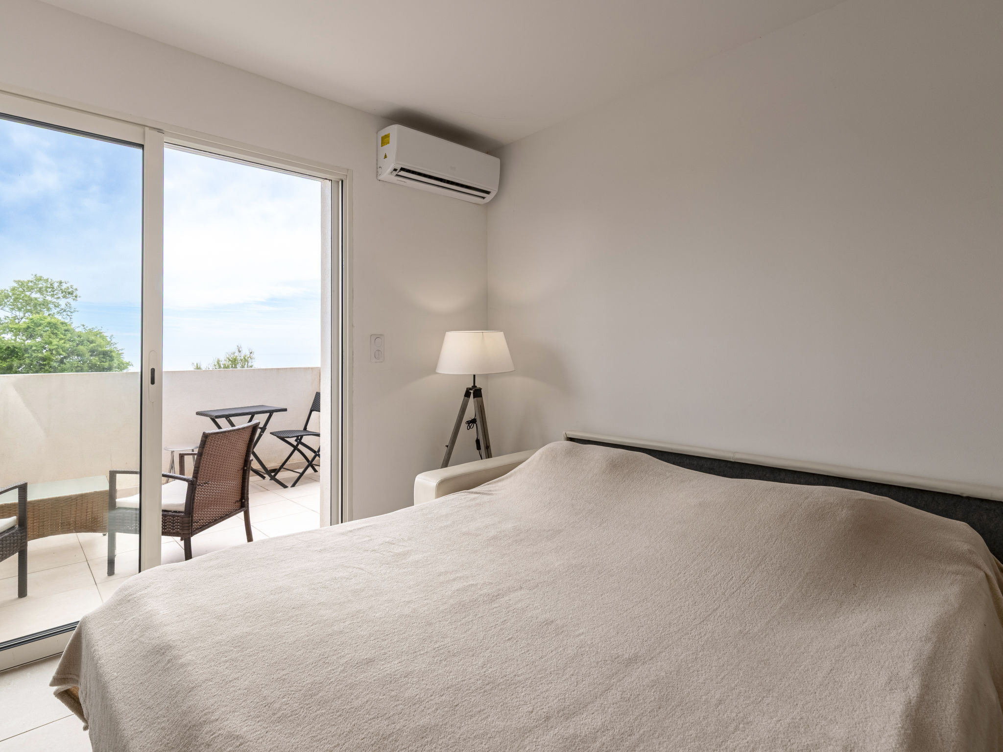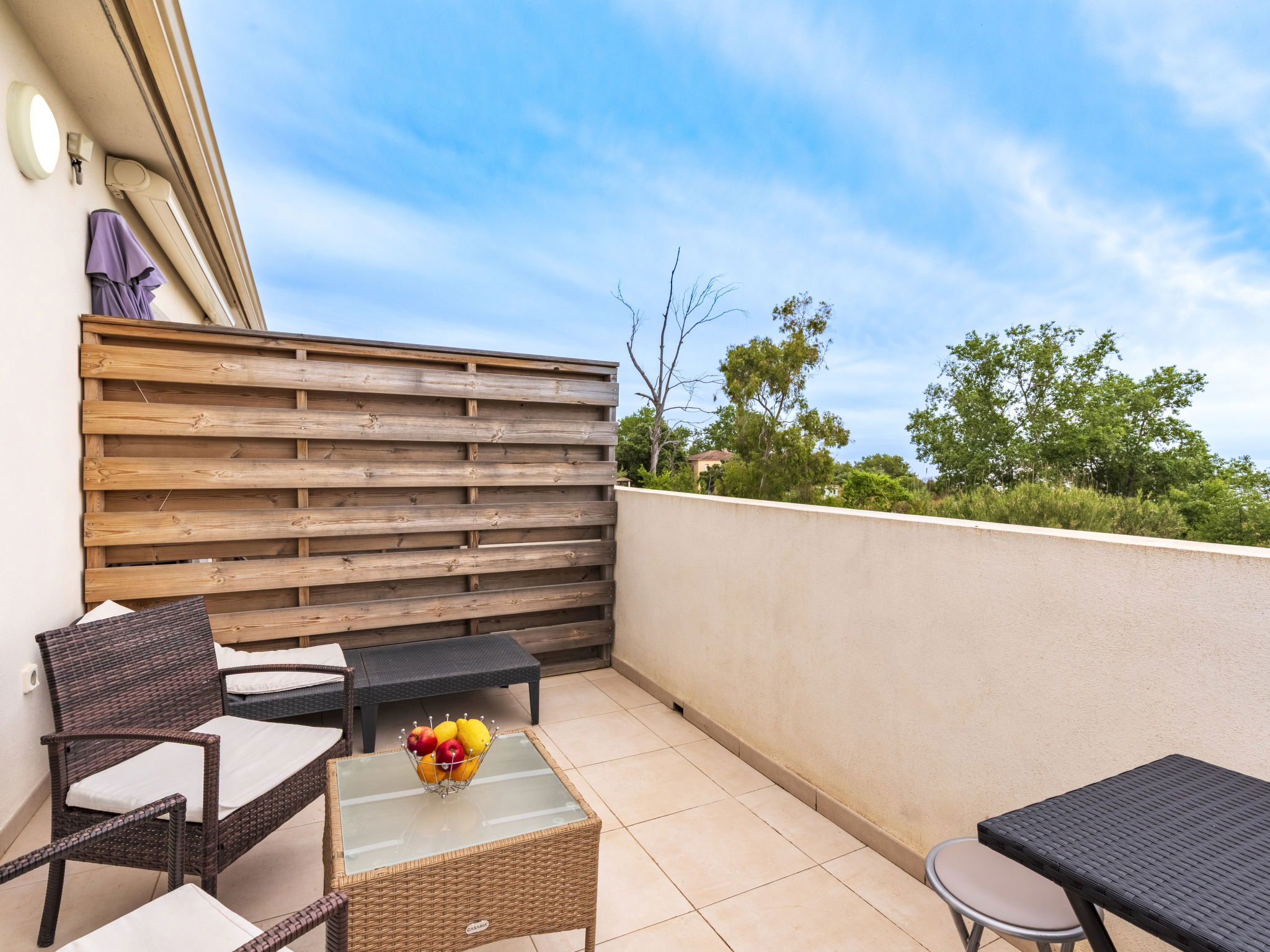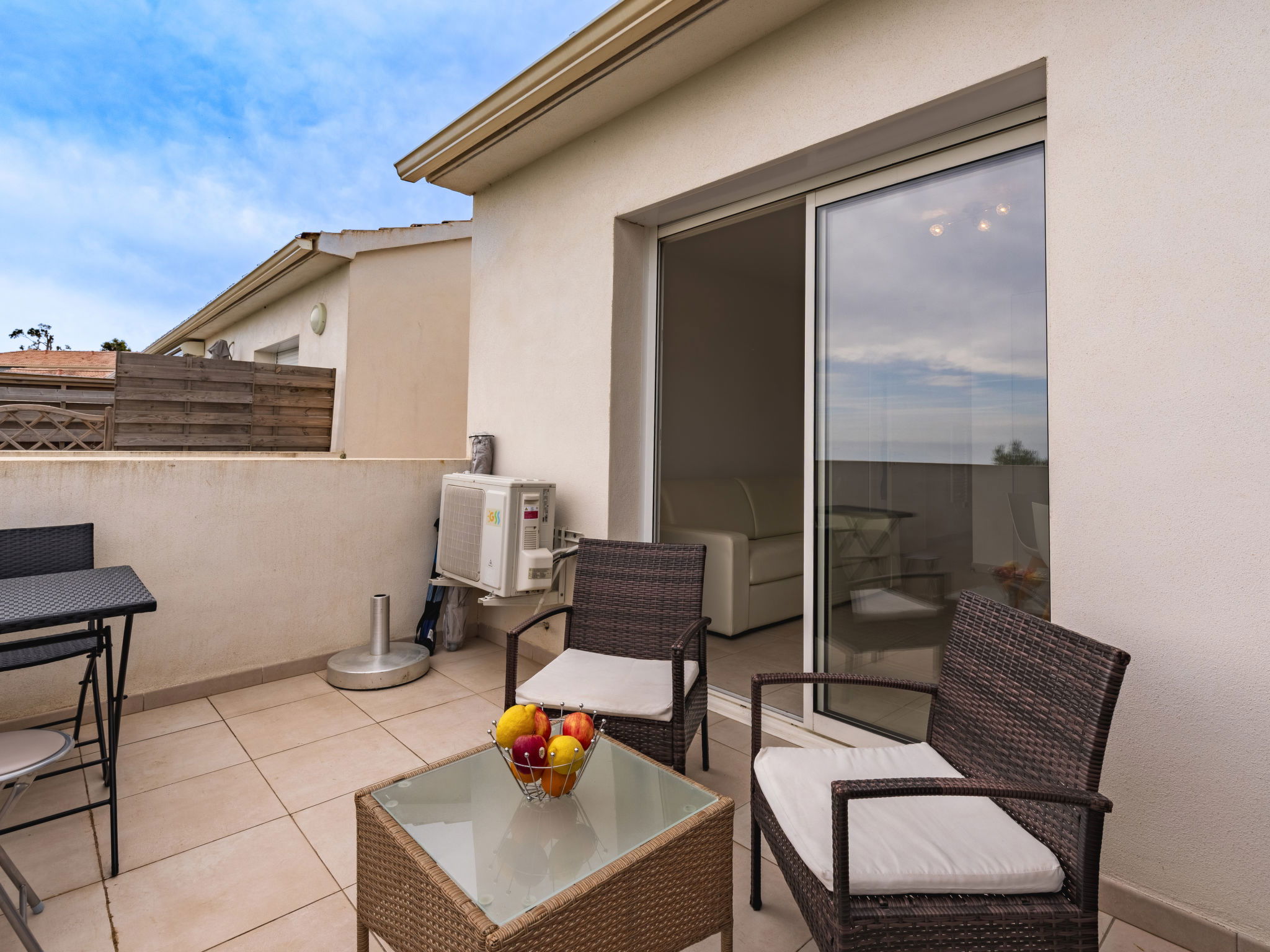 "Brigitte", 1-room studio 23 m2 on 1st floor. Comfortable furnishings: living/sleeping room with 1 sofabed (160 cm, length 200 cm), dining table and TV (flat screen). Exit to the terrace. Kitchen-/living room (2 induction hot plates, toaster, kettle, microwave, electric coffee machine). Shower/WC. Electric heating, air-conditioning. Terrace 10 m2, east facing position. Terrace furniture, deck chairs (1). Beautiful view of the sea. Facilities: washing machine. Internet (WiFi). Parking space n 33. Please note: smoke alarm. Offer by a private individual according to Art. 155, IV of CGI.