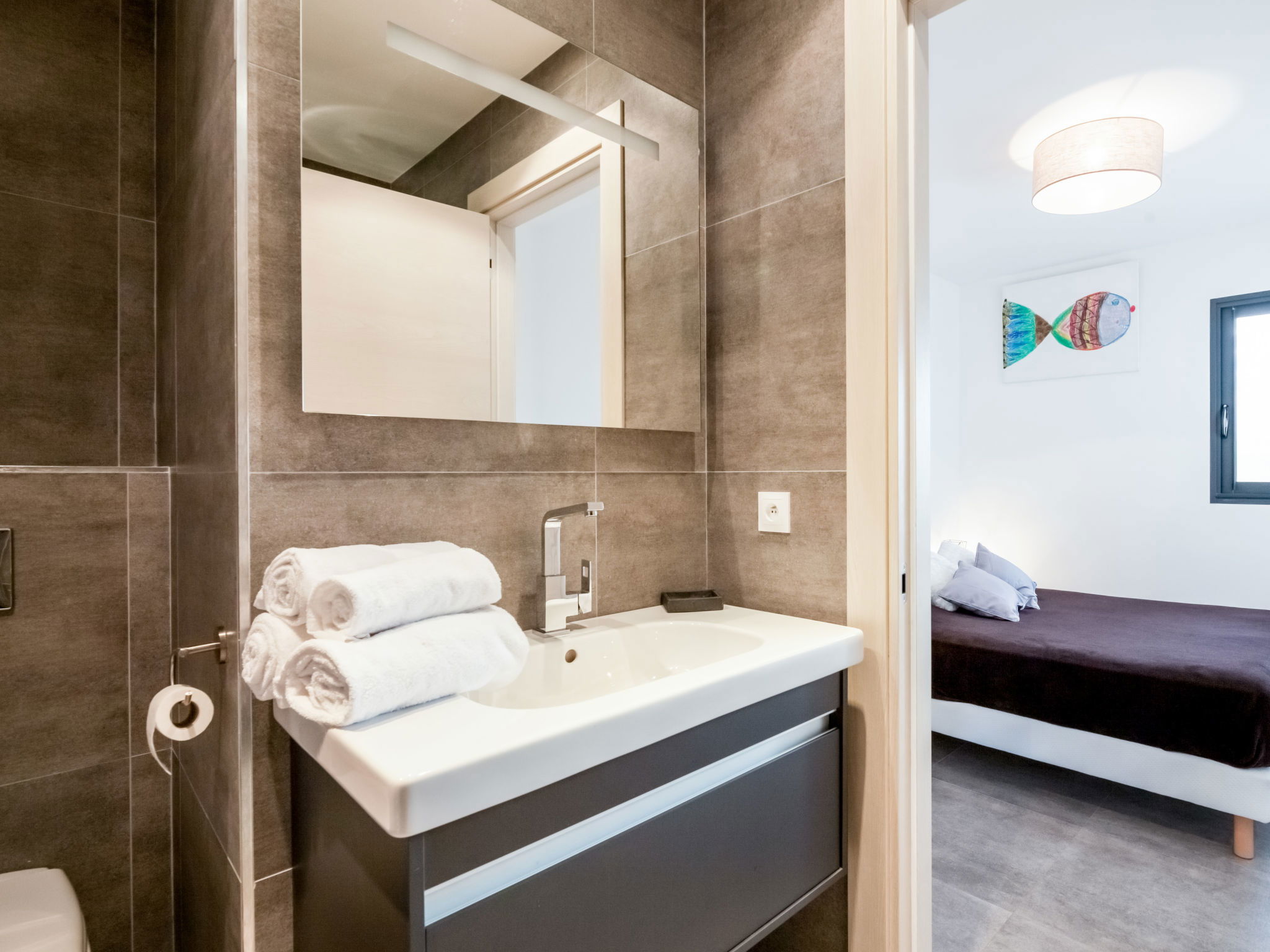 "Château", 5-room apartment 105 m2 on 2nd floor. Object suitable for 4 adults + 4 children. Modern and cosy furnishings: living/dining room with satellite TV (flat screen). Exit to the terrace. 1 room with 1 french bed (140 cm, length 190 cm). 1 room with 1 french bed (140 cm, length 190 cm), TV (flat screen). Exit to the terrace. 1 room with 1 x 2 bunk beds (90 cm, length 190 cm). 1 room with 1 french bed (160 cm, length 200 cm). Open kitchen (4 hot plates, oven, dishwasher, toaster, kettle, microwave, freezer, electric coffee machine). 2 showers/WC, sep. WC. Electric heating, air-conditioning. Terrace 29 m2. Terrace furniture. Facilities: washing machine. Internet (WiFi, free). Garage. Please note: non-smokers only. Smoke alarm. 2A2470002802A