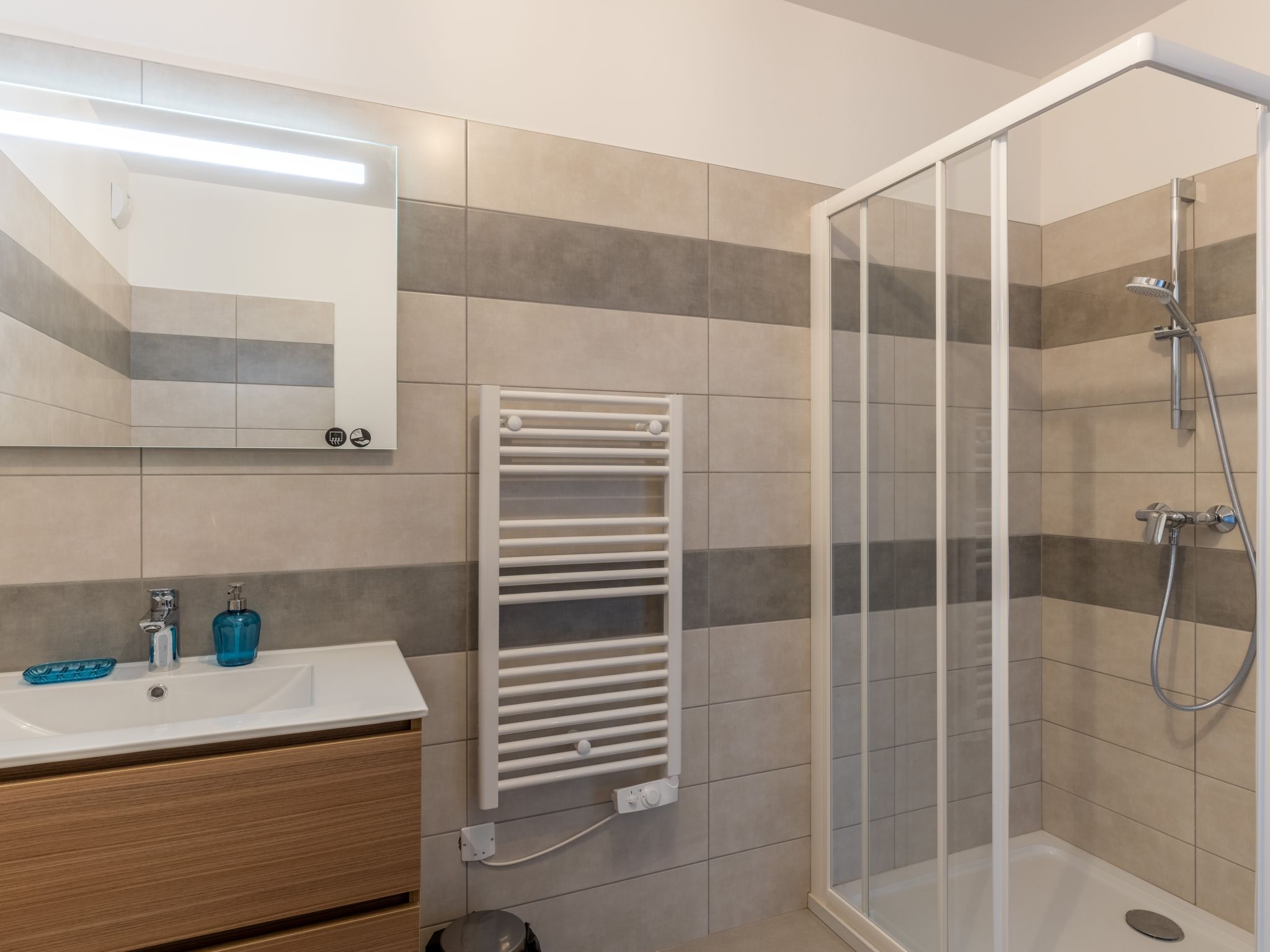 3-room apartment 73 m2 on 1st floor. Very beautiful and modern furnishings: living/dining room with TV (flat screen). Exit to the terrace. 2 rooms, each room with 1 french bed (140 cm, length 190 cm). Exit to the terrace. Open kitchen (oven, dishwasher, 3 induction hot plates, toaster, kettle, microwave, freezer, electric coffee machine). Shower/WC, sep. WC. Electric heating, air-conditioning. Large terrace 20 m2. View of the mountains. Facilities: washing machine, children's high chair. Internet (WiFi, extra). Parking space n 12-13 (2 cars). Please note: non-smokers only. Smoke alarm. 2A247001505A4