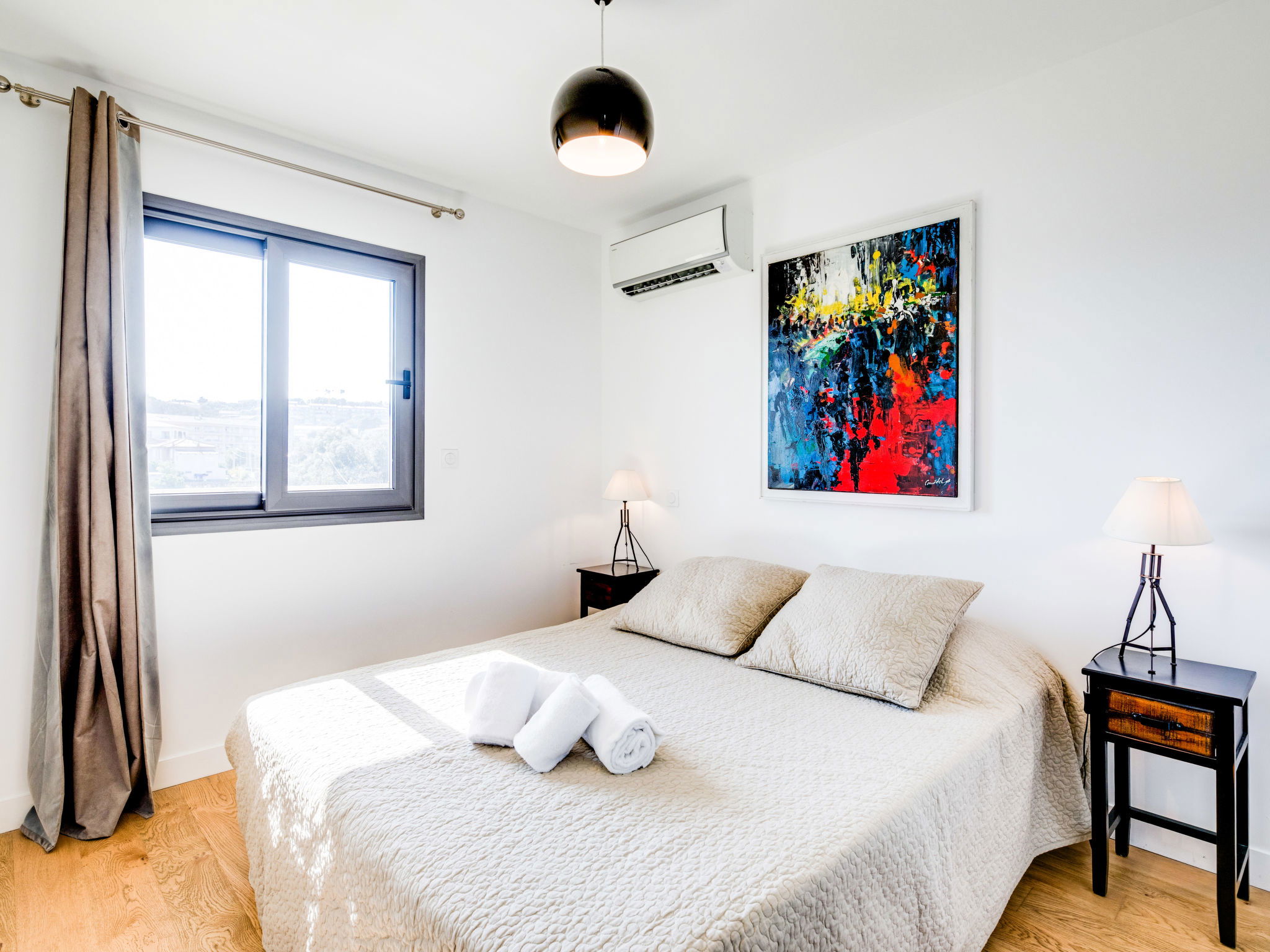 2-room apartment 57 m2 on 3rd floor. Comfortable and cosy furnishings: living/dining room with 1 double sofabed (140 cm, length 190 cm), TV (flat screen). Exit to the balcony. 1 room with 1 french bed (160 cm, length 200 cm), TV (flat screen). Open kitchen (4 hot plates, oven, dishwasher, toaster, kettle, microwave, electric coffee machine). Shower/WC, sep. WC. Electric heating, air-conditioning. Balcony 12 m2. Balcony furniture. View of the swimming pool. Facilities: washing machine. Internet (WiFi, free). Please note: non-smokers only. Smoke alarm.