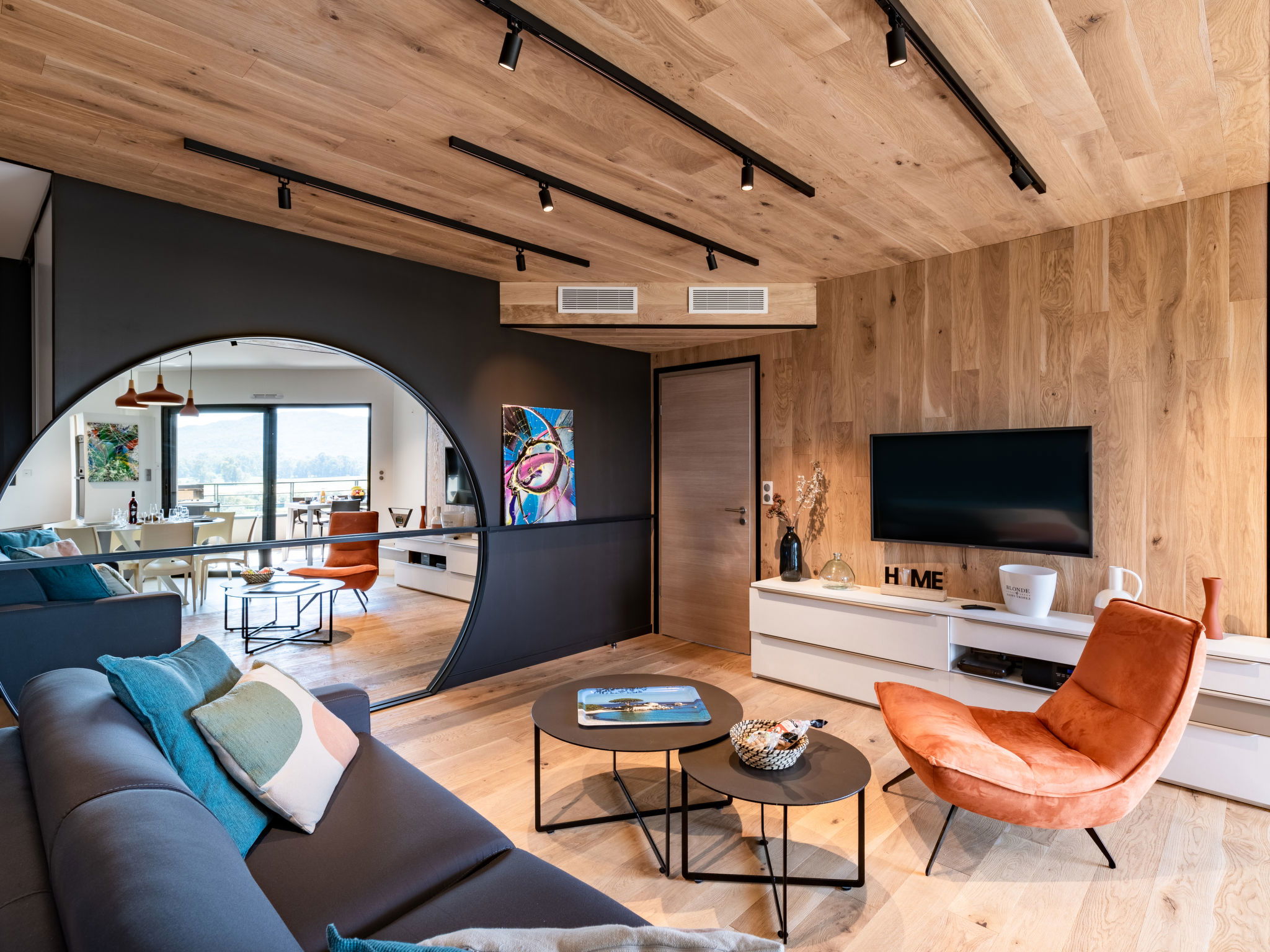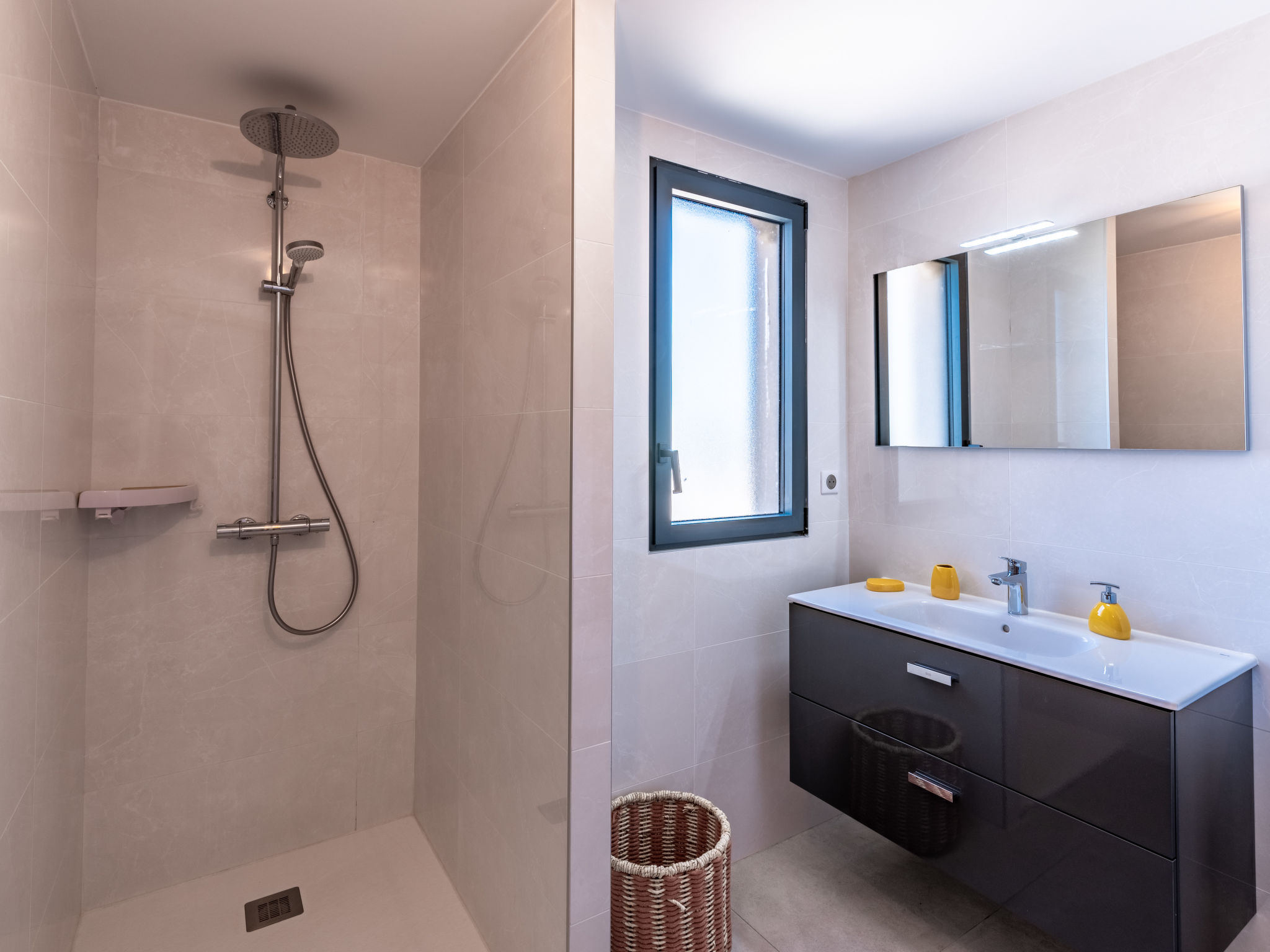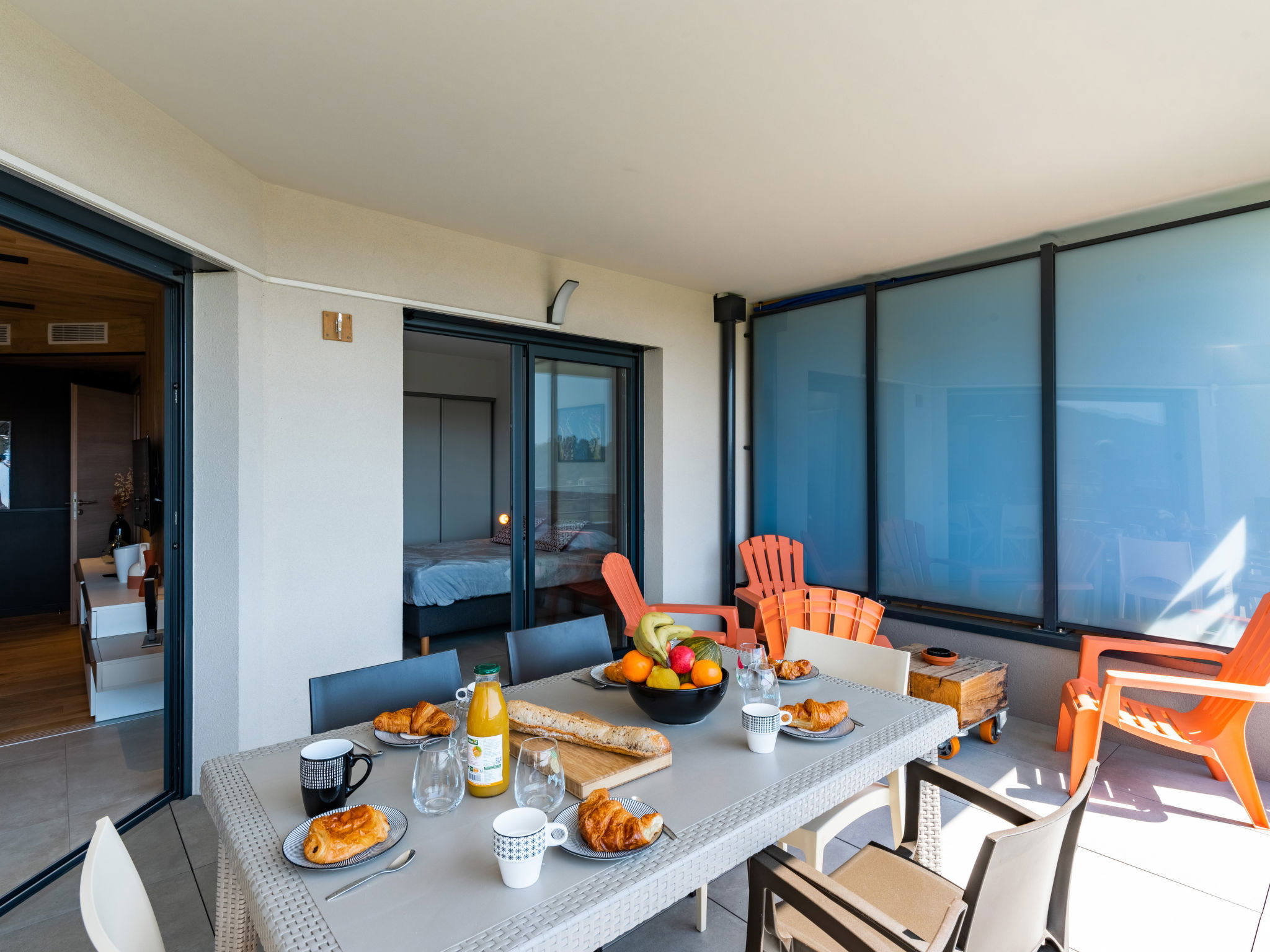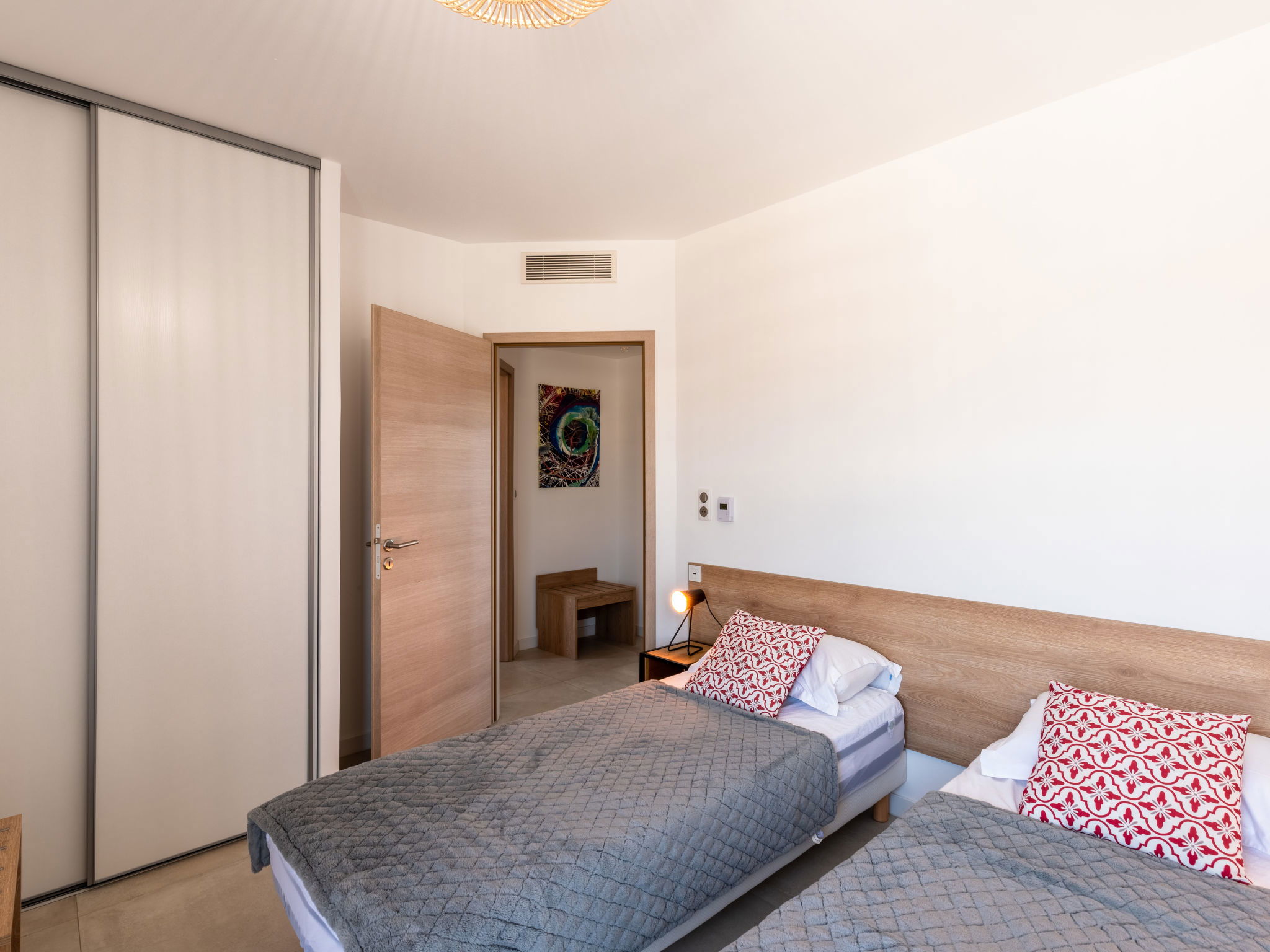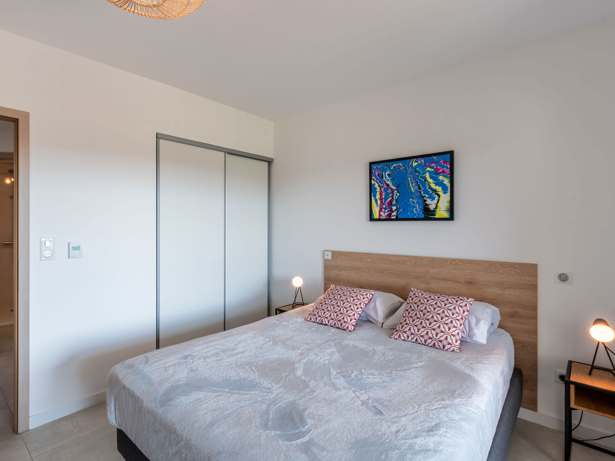 3-room apartment 72 m2 on 5th floor. Very beautiful and modern furnishings: living/dining room with 1 double sofabed (160 cm, length 200 cm), TV (flat screen). Exit to the terrace. 1 room with 1 french bed (160 cm, length 200 cm). Exit to the terrace. 1 room with 2 beds (90 cm, length 190 cm). Open kitchen (oven, dishwasher, 4 induction hot plates, toaster, kettle, microwave, freezer, electric coffee machine). Shower/WC. Electric heating, air-conditioning. Terrace 25 m2. Terrace furniture. Beautiful view of the mountains. Facilities: washing machine, dryer. Internet (WiFi, free). Parking. Please note: suitable for families. Non-smokers only. Smoke alarm. Plancha. Wine cellar. 2A247000320EC