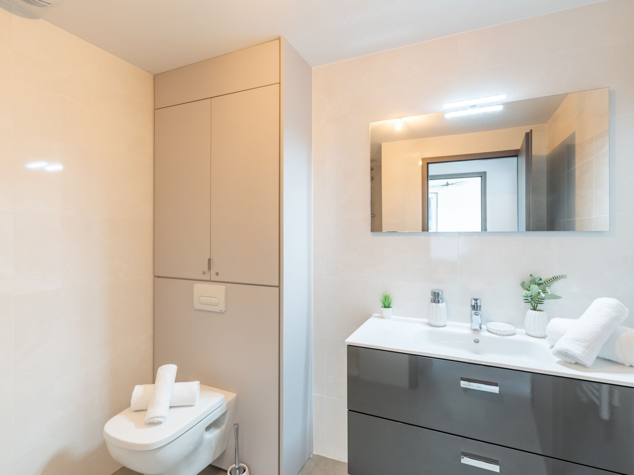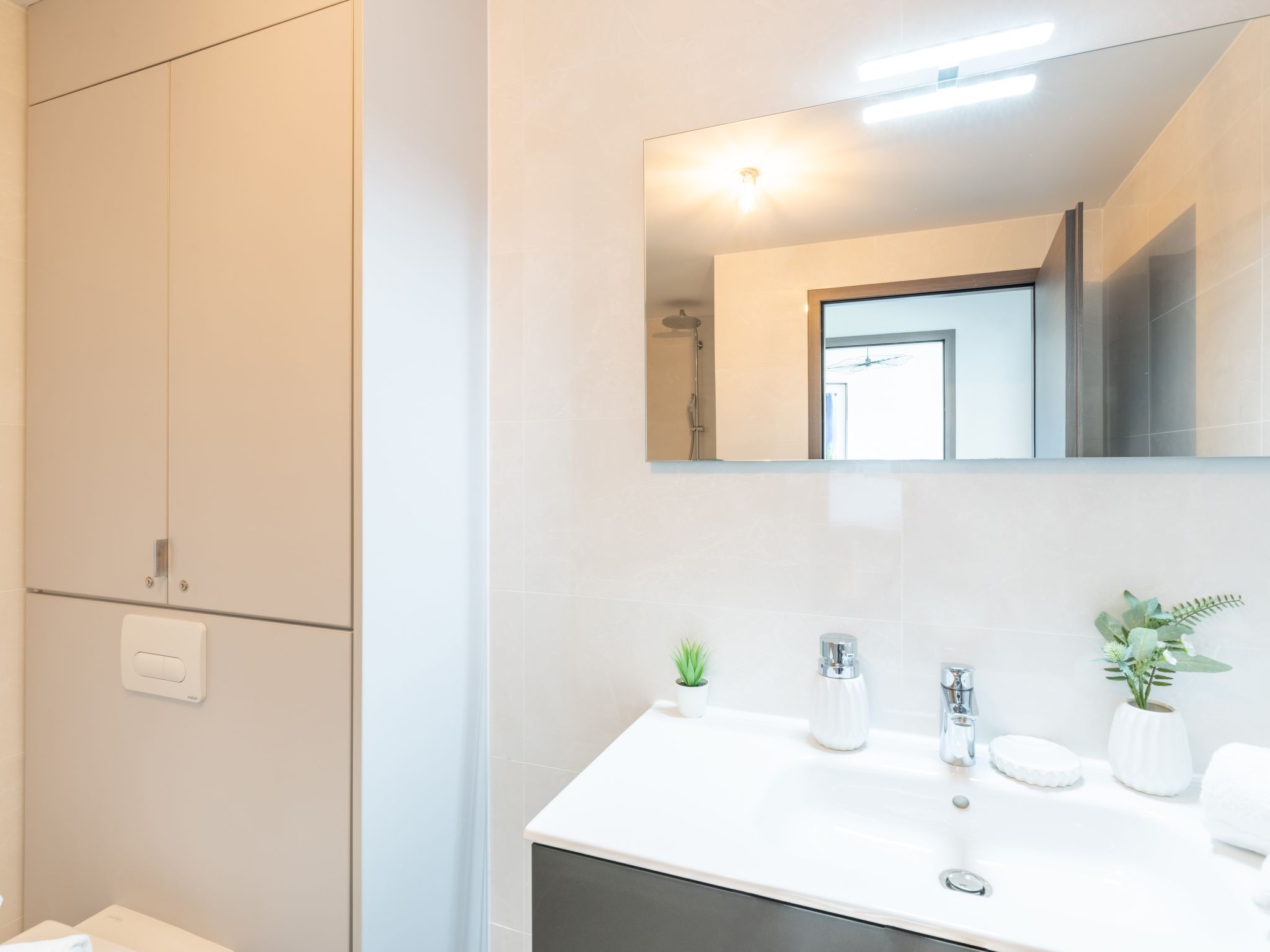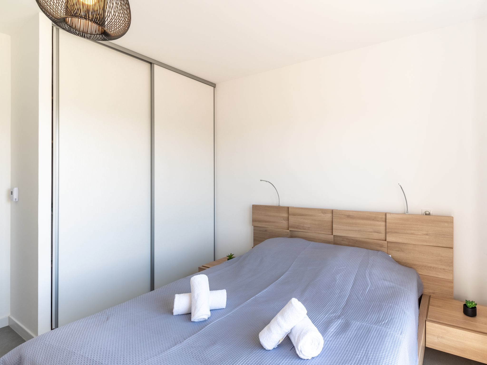 2-room apartment 51 m2 on 5th floor. Very beautiful and modern furnishings: living/dining room with 1 sofabed (140 cm, length 190 cm), TV (flat screen). Exit to the terrace. 1 room with 1 french bed (160 cm, length 200 cm). Open kitchen (oven, dishwasher, 3 induction hot plates, toaster, kettle, microwave, freezer, electric coffee machine). Shower/WC. Electric heating, air-conditioning. Terrace 8 m2. Terrace furniture. Facilities: washing machine, children's high chair, baby cot. Internet (WiFi, free). Please note: suitable for families. Non-smokers only. Smoke alarm.