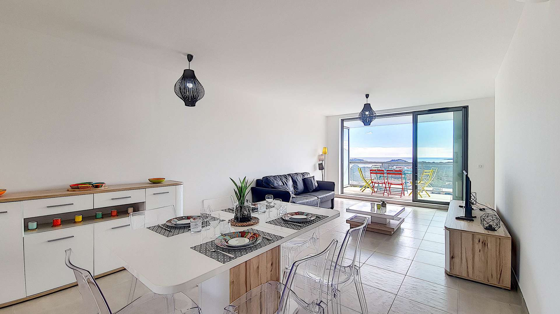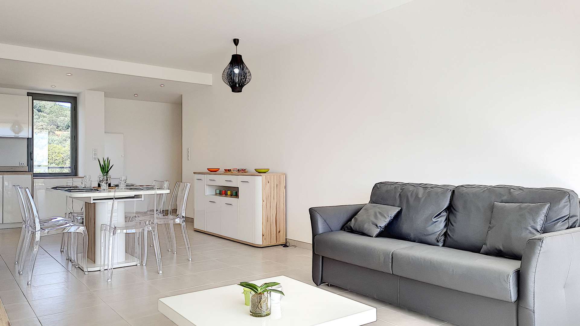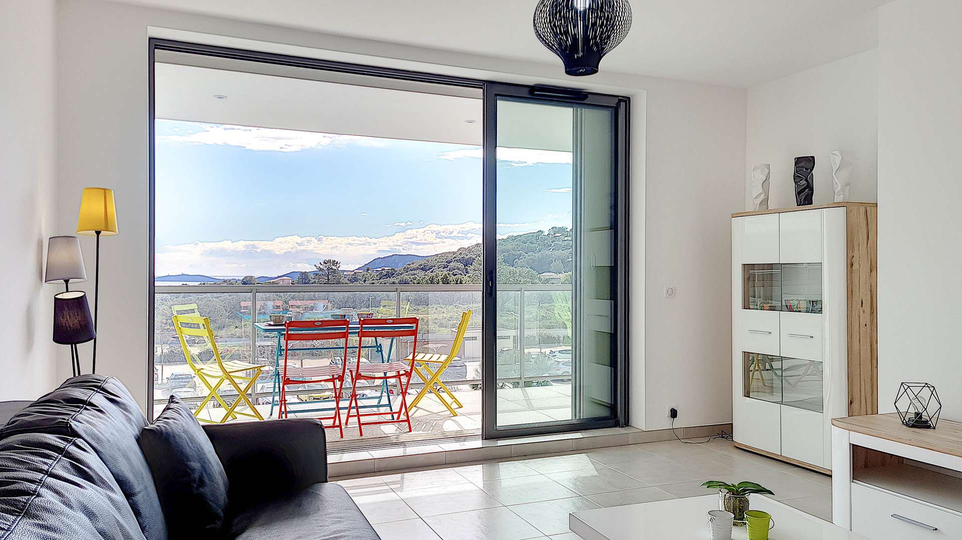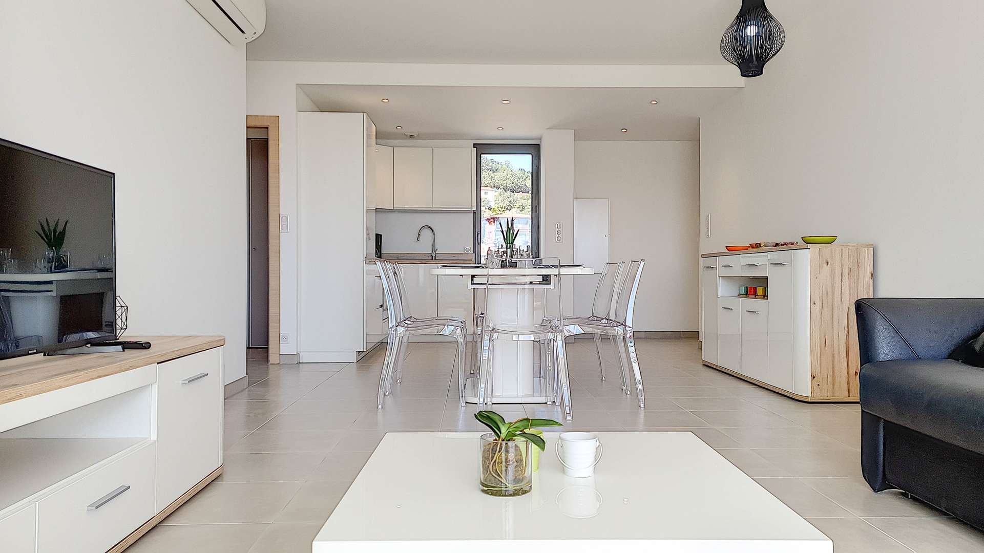 This apartment has a lovely living room going out to a terrace with a sea view.