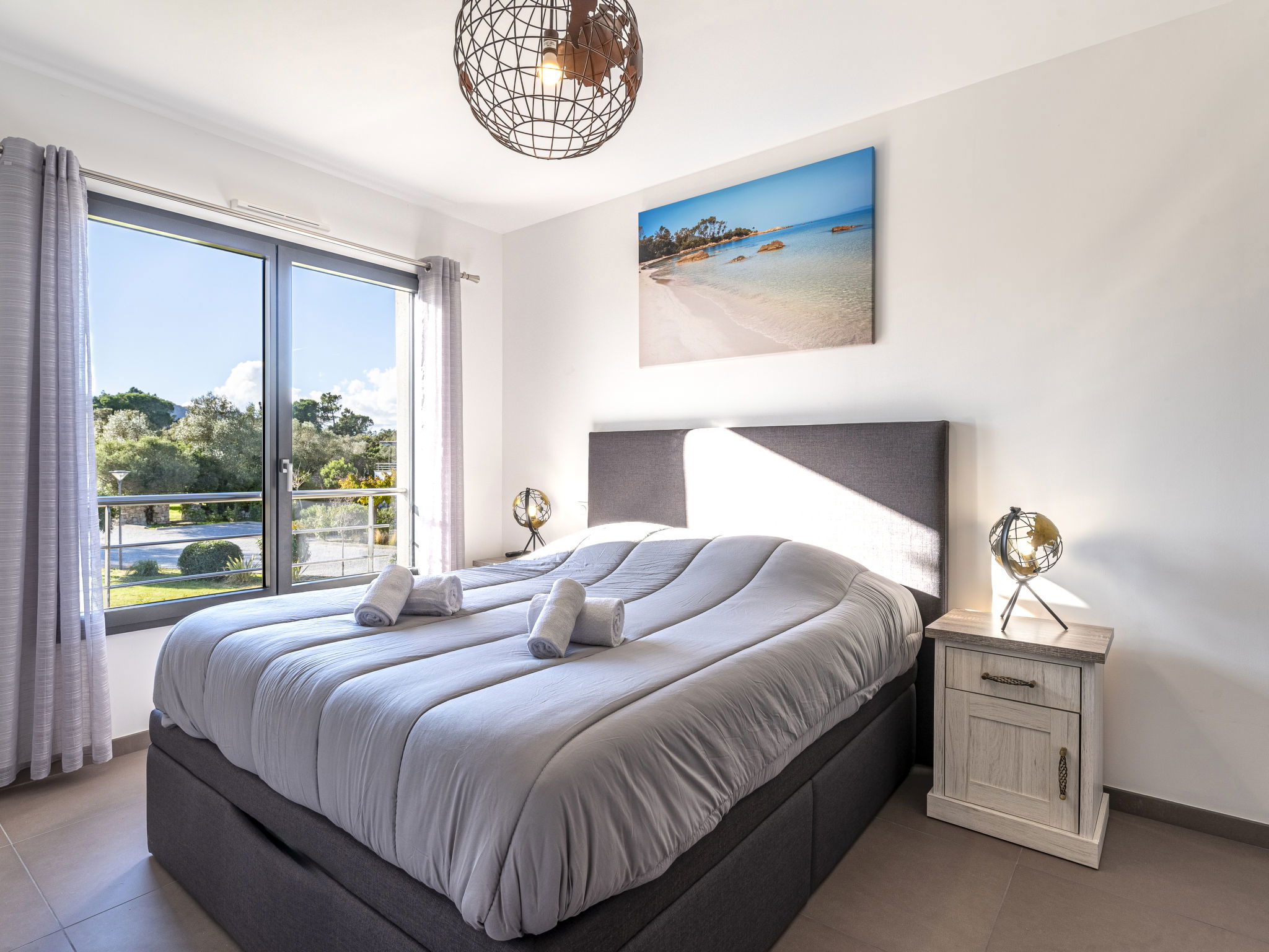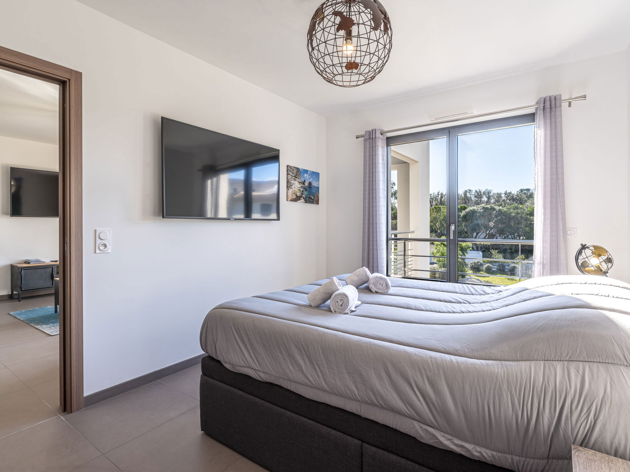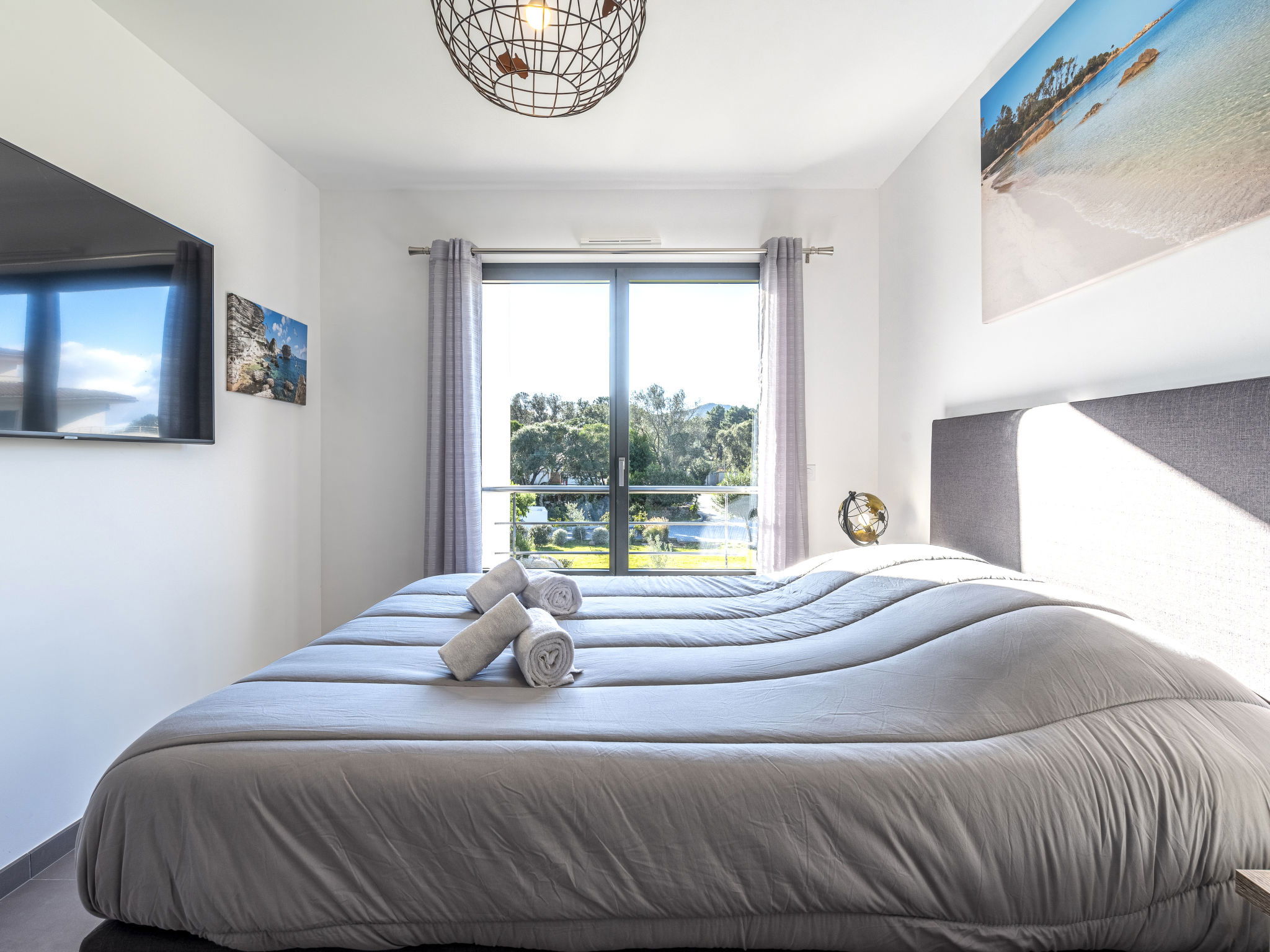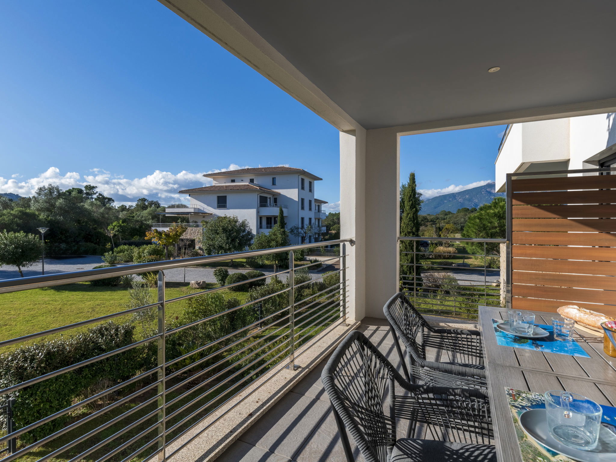 "Domaine d'Arca G6", 2-room apartment 51 m2 on 2nd floor. Modern furnishings: living/dining room with panoramic window with 1 double sofabed (140 cm, length 190 cm), TV (flat screen). Exit to the balcony, to the terrace. 1 room with panoramic window with 1 french bed (160 cm, length 200 cm). Exit to the terrace. Open kitchen (oven, dishwasher, 1 induction hot plates, 4 gas rings, kettle, microwave, electric coffee machine). Bath/WC. Electric heating, air-conditioning. Terrace 20 m2. Terrace furniture. Facilities: washing machine. Internet (WiFi, free). Parking. Please note: non-smokers only. Smoke alarm. 2A247000122EE
