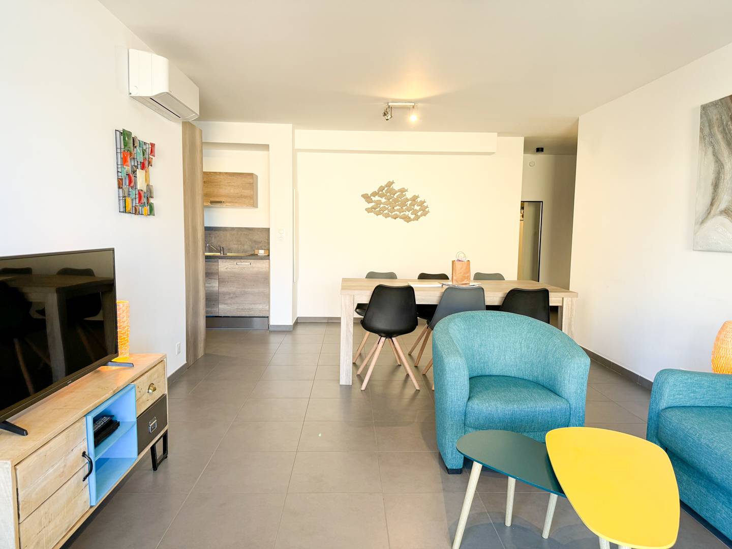A beautiful living room with dining area and living room equipped with a very good convertible sofa,