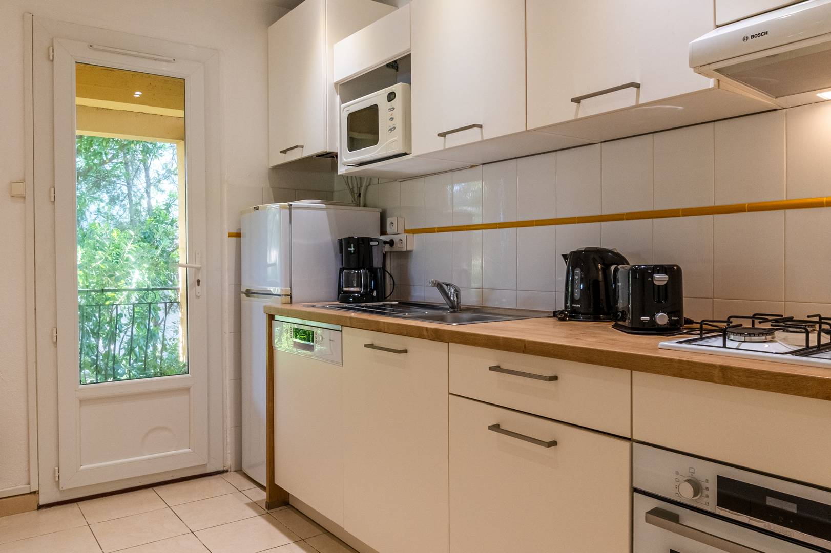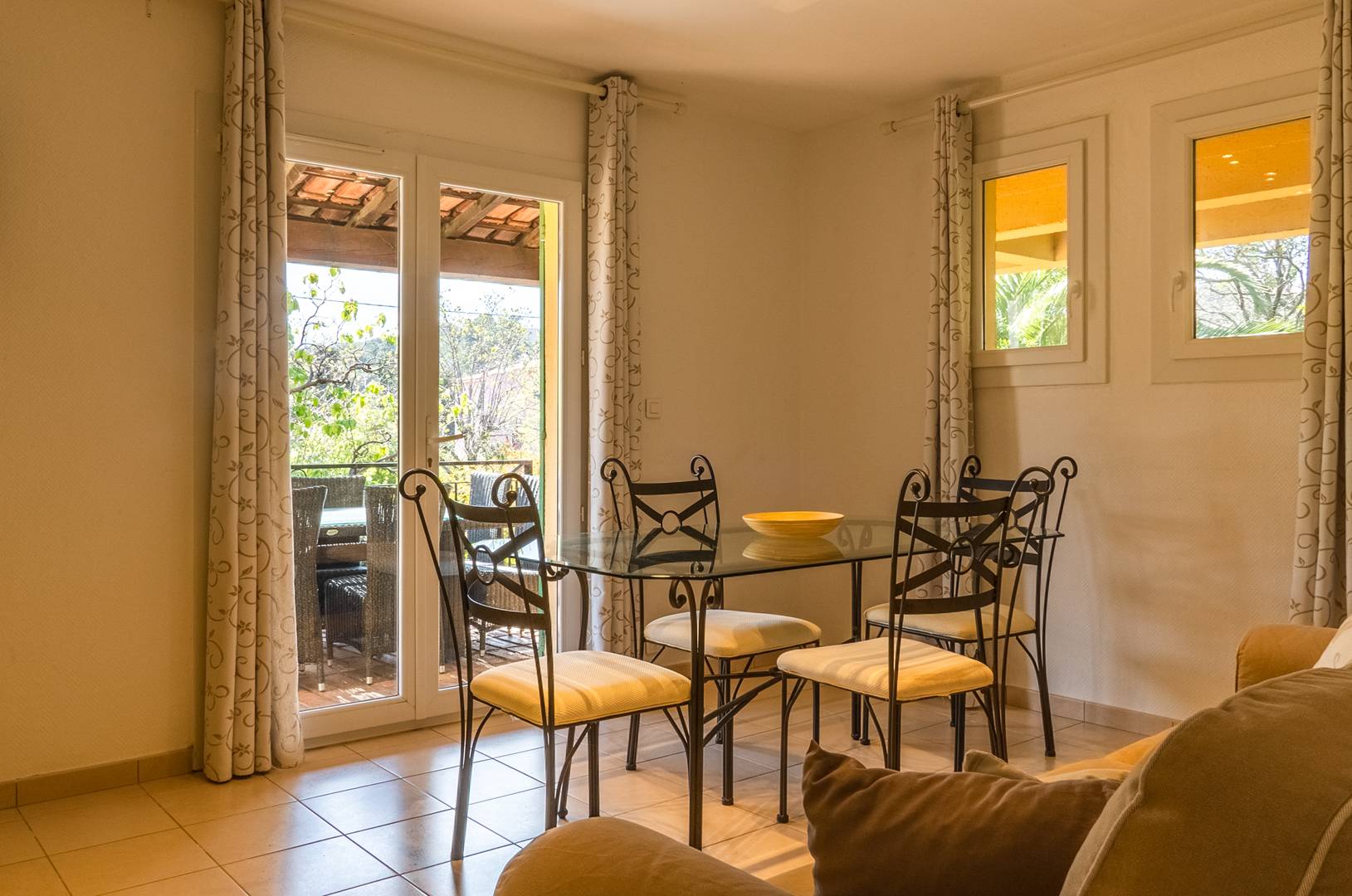The well-equipped kitchen is also separate. Both the kitchen and the living room have access to the terrace and the outside. This accommodation is air-conditioned and equipped with free internet access (or WiFi).