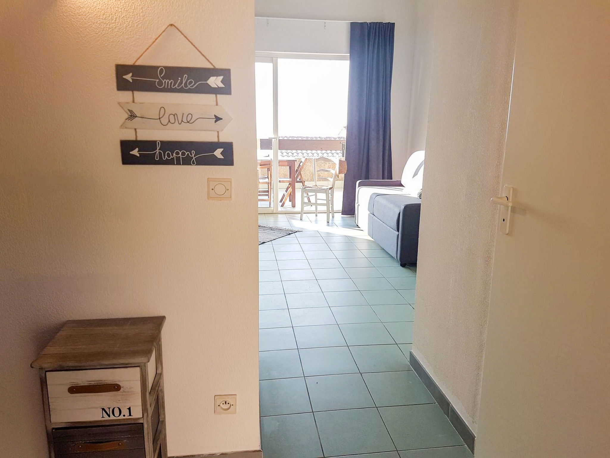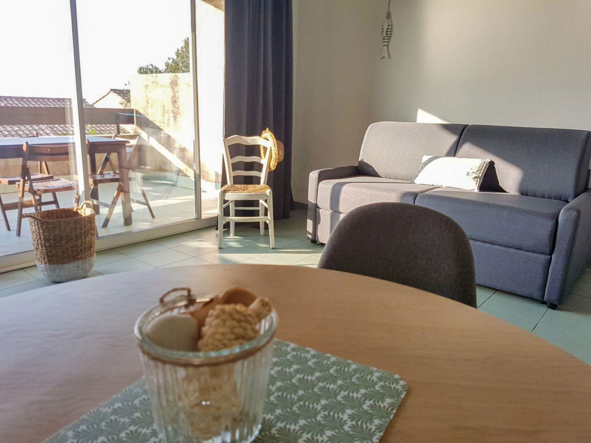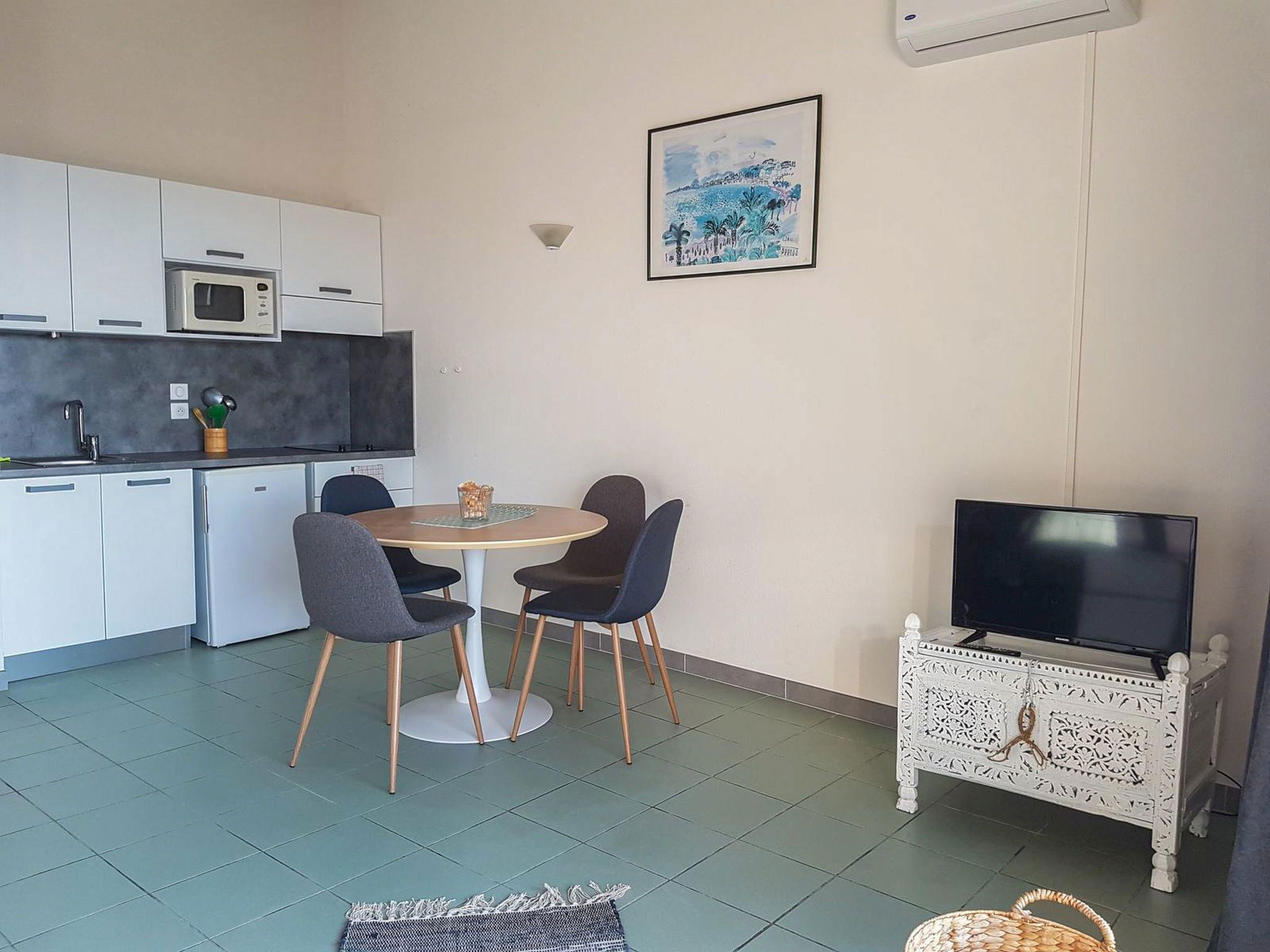 "Studio Cabine", 1-room studio 36 m2. Object suitable for 2 adults + 2 children. Simple and comfortable furnishings: living/sleeping room with 1 double sofabed (140 cm, length 190 cm), dining table and TV (flat screen), air conditioning. Exit to the terrace. Sleeping alcove with 1 x 2 bunk beds (90 cm, length 190 cm). Kitchenette (2 ceramic glass hob hotplates, kettle, microwave, electric coffee machine). Bathroom, sep. WC. Electric heating. Terrace 10 m2. Terrace furniture. View of the sea. Reserved parking at the house. Please note: suitable for families. Non-smokers only. Smoke alarm. Offer by a commercial proprietor according to Art. 155, IV, CGI