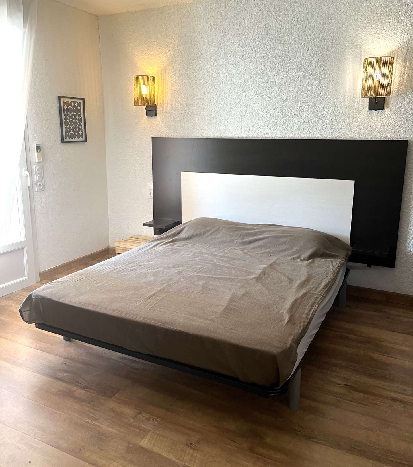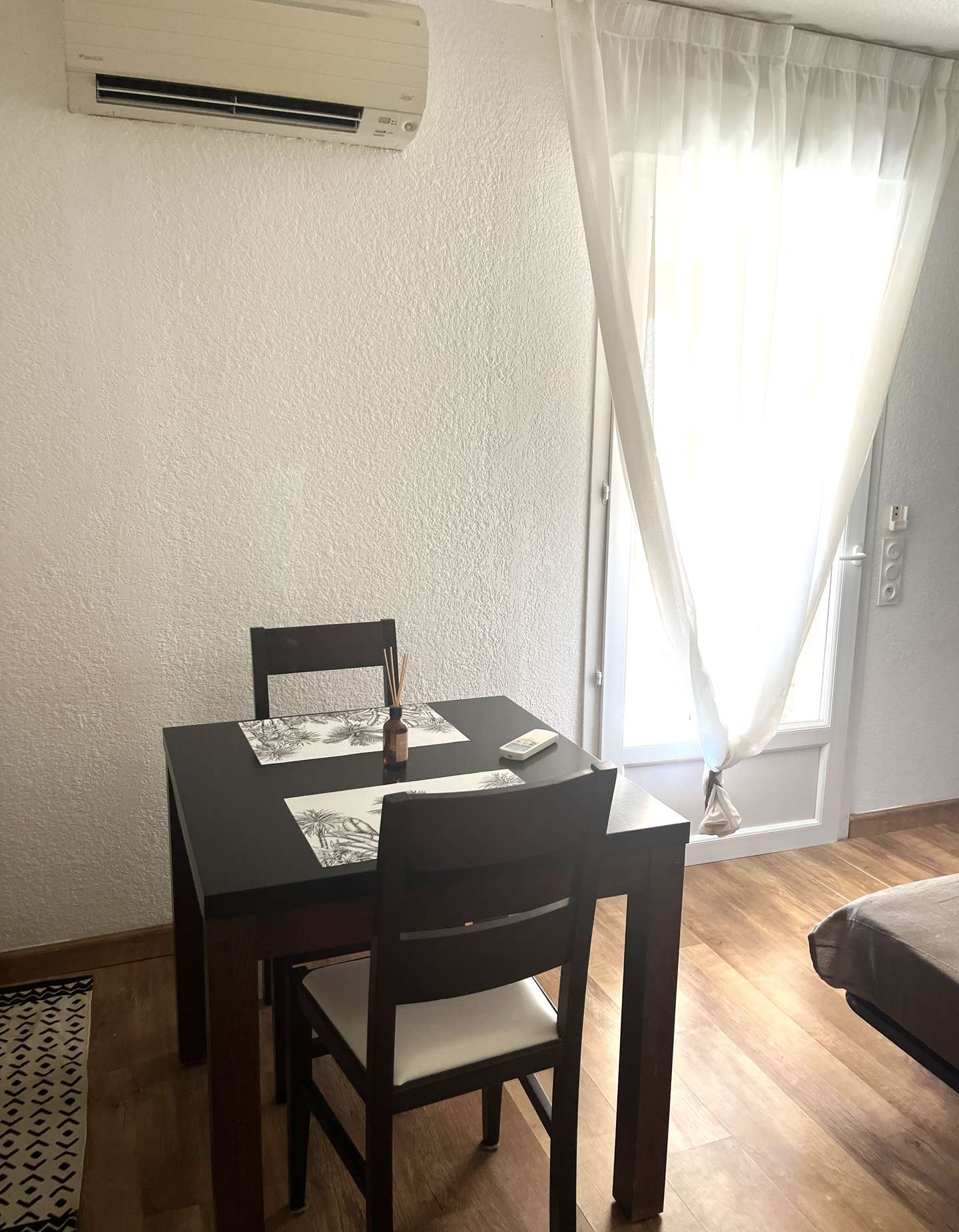 In a quiet and green residence, with swimming pool, charming air-conditioned studio comprising a living room with lounge/TV area, an equipped kitchen area (microwave, hob, extractor, fridge), dining area, 1 double bed 140.