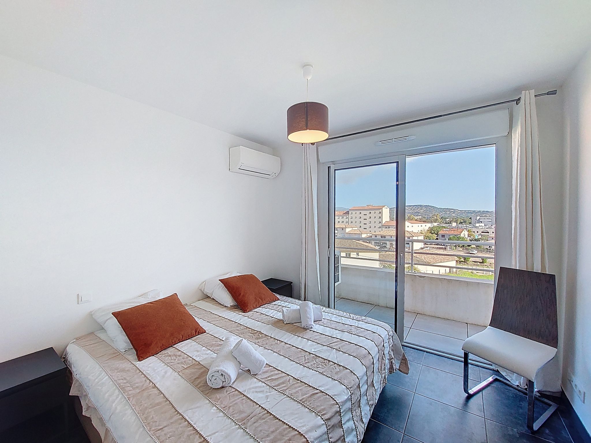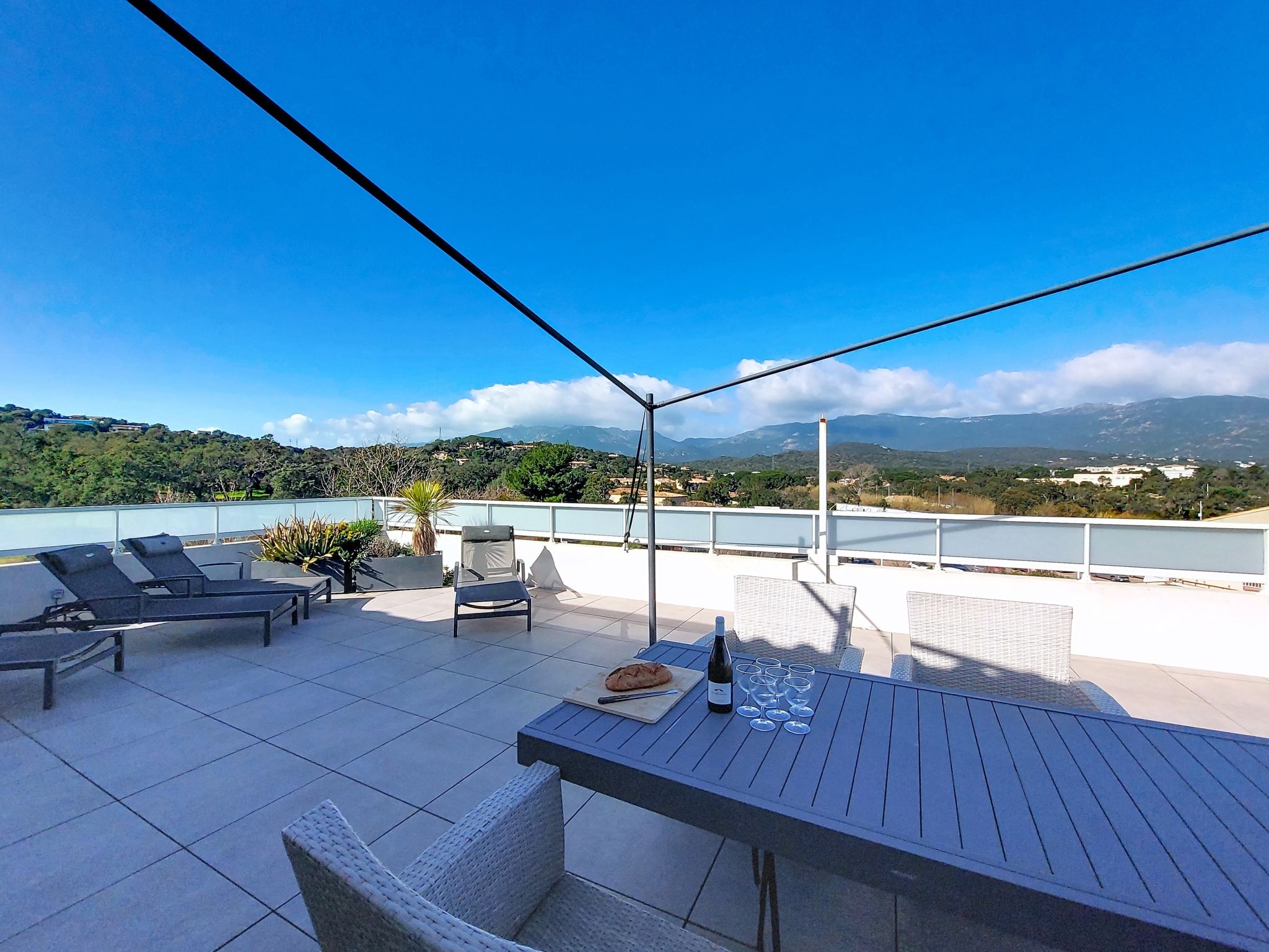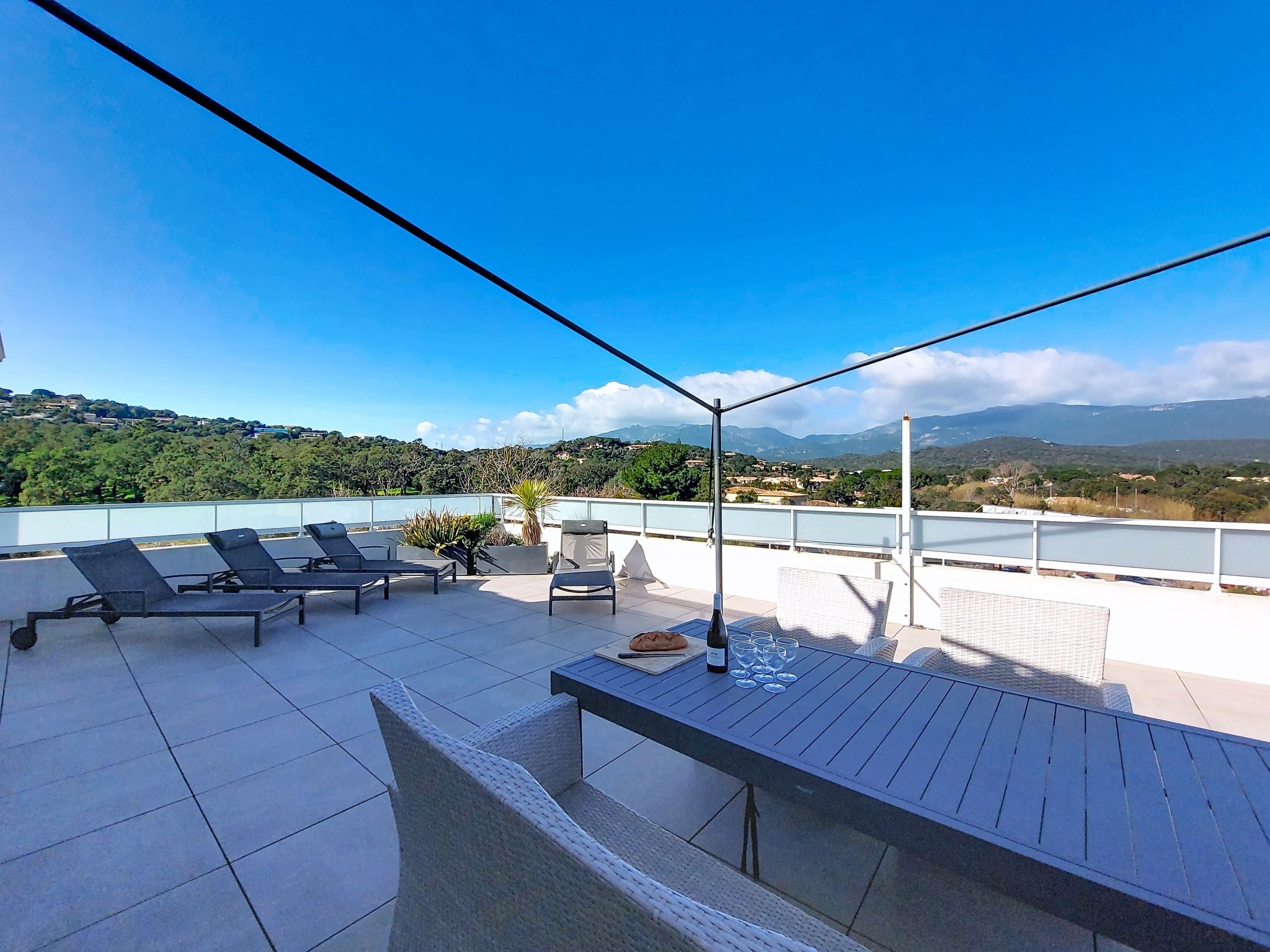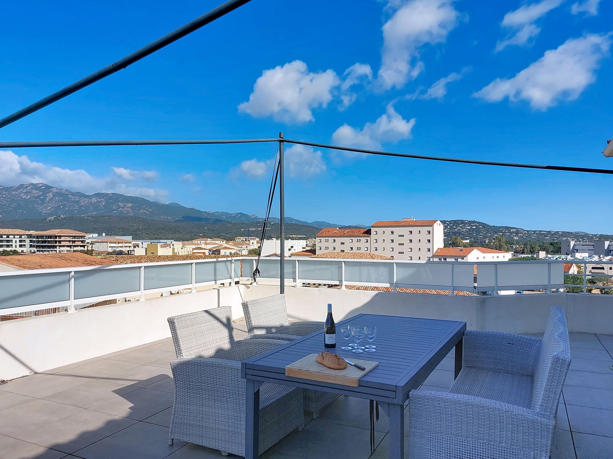 "La Boétie Penthouse", 4-room apartment 108 m2 on 3rd floor. Spacious, beautiful furnishings: large living/dining room with dining table and TV (flat screen). Exit to the terrace. 1 room with 1 french bed (160 cm, length 200 cm), TV (flat screen). 1 room with 1 french bed (160 cm, length 200 cm), TV (flat screen). Exit to the terrace. 1 room with 2 beds (80 cm, length 190 cm). Exit to the terrace. Open kitchen (oven, dishwasher, 4 induction hot plates, toaster, kettle, microwave, freezer, electric coffee machine, cooking island). 2 showers/WC, sep. WC. Electric heating, air-conditioning. Large terrace 80 m2 partly roofed. Terrace furniture, electric barbecue, deck chairs (4). View of the mountains and the countryside. Facilities: washing machine, iron, baby cot for up to 2 year olds, hair dryer. Internet (WiFi, free). Parking space n 1. Please note: non-smokers only. Smoke alarm. Offer by a private individual according to Art. 155, IV of CGI. 2A24700243305
