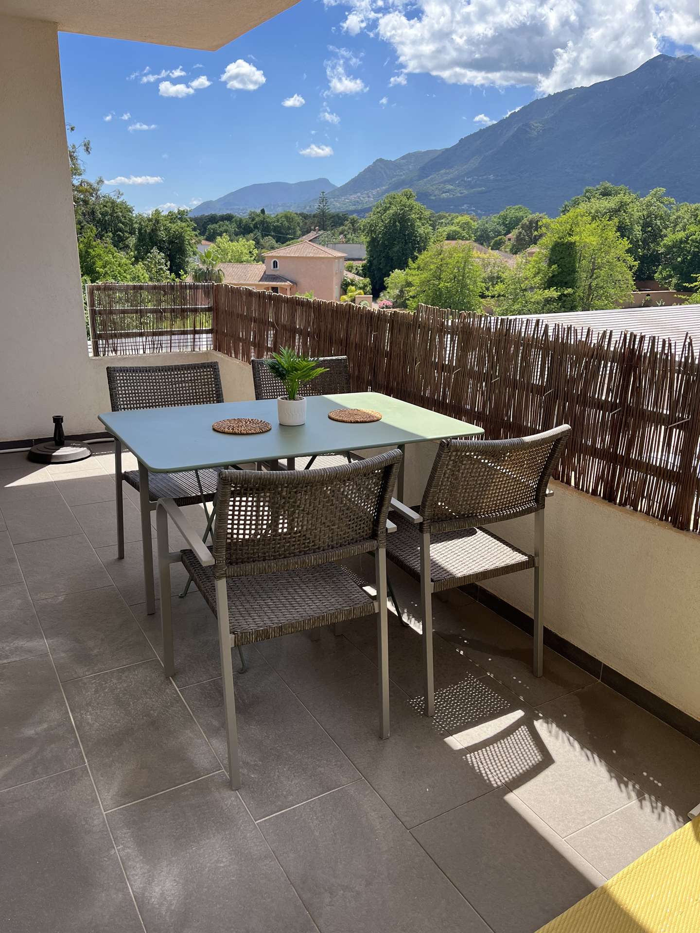 Une vaste terrasse aménagée avec salon de jardin vue montagne.