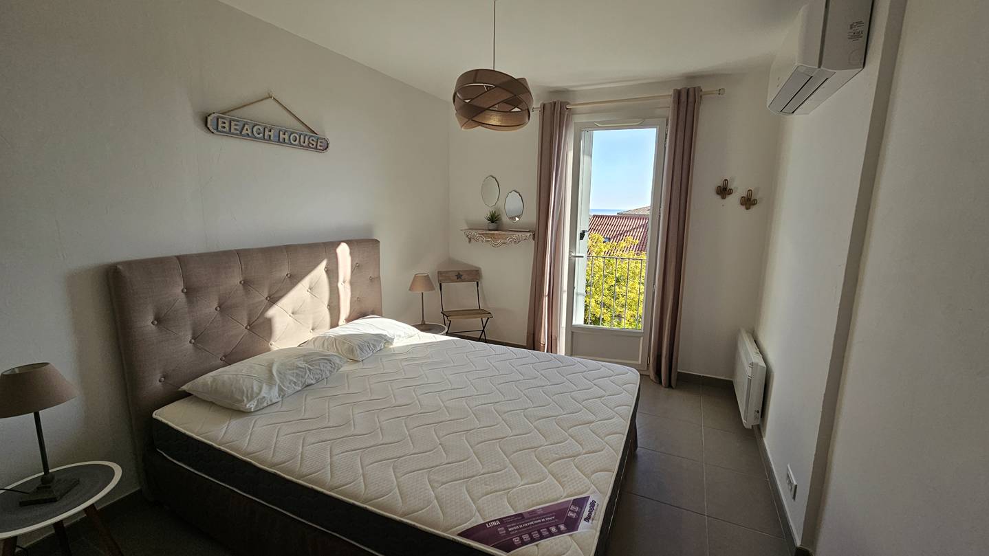 - Living room :(air-conditioned) 2 convertible sofas (140 cm), TV (flat screen with TNT), opening on covered terrace : sea and village view, garden table.
