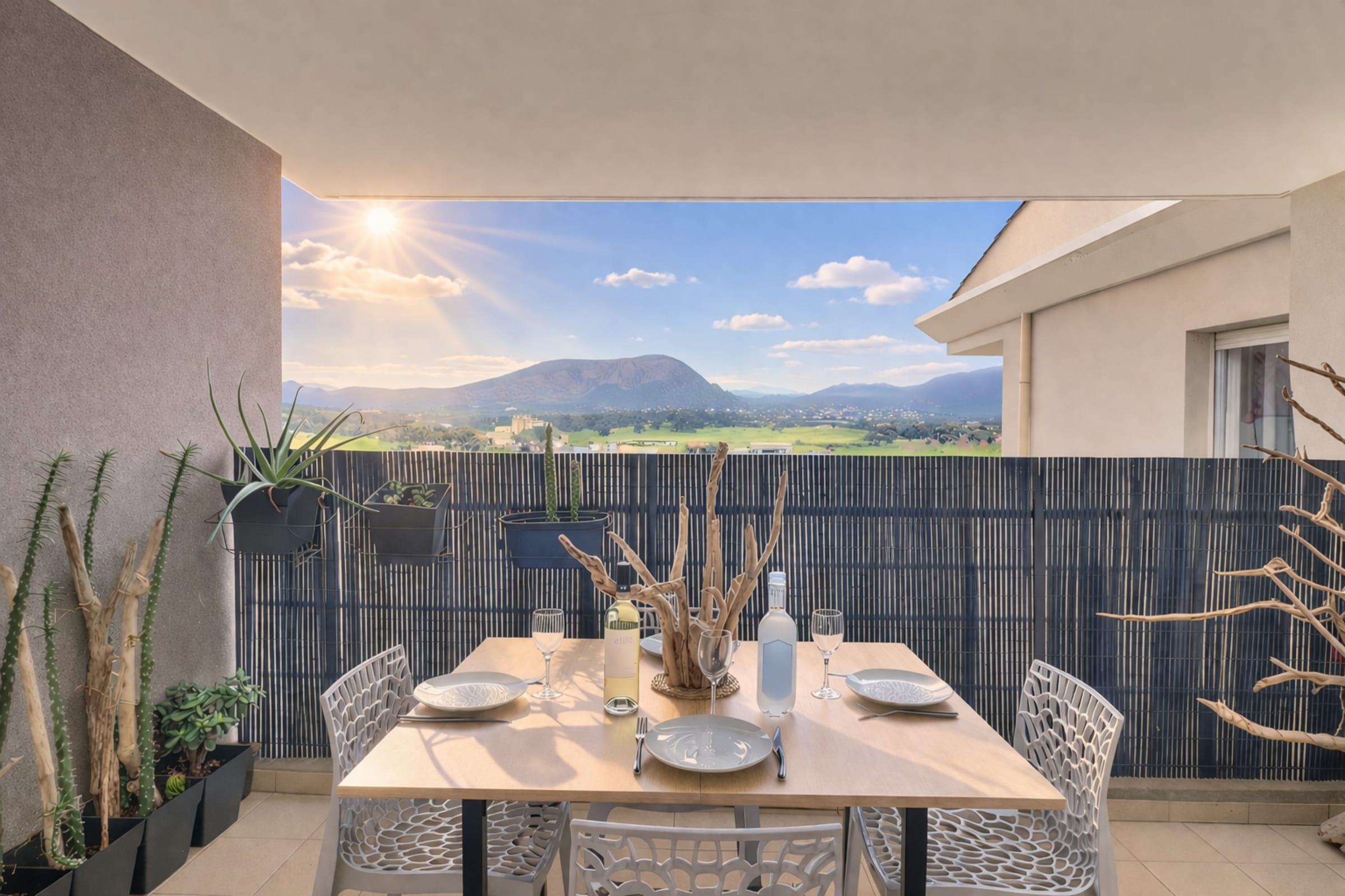 The terrace then becomes an extension of the living room. Around the outdoor table, meals take on a whole new dimension with unobstructed views of the Corsican mountains and the surrounding plain. In the morning, you can slowly savour your coffee while watching the landscape wake up. In the evening, the mild climate invites you to prolong your conversations over an al fresco dinner.