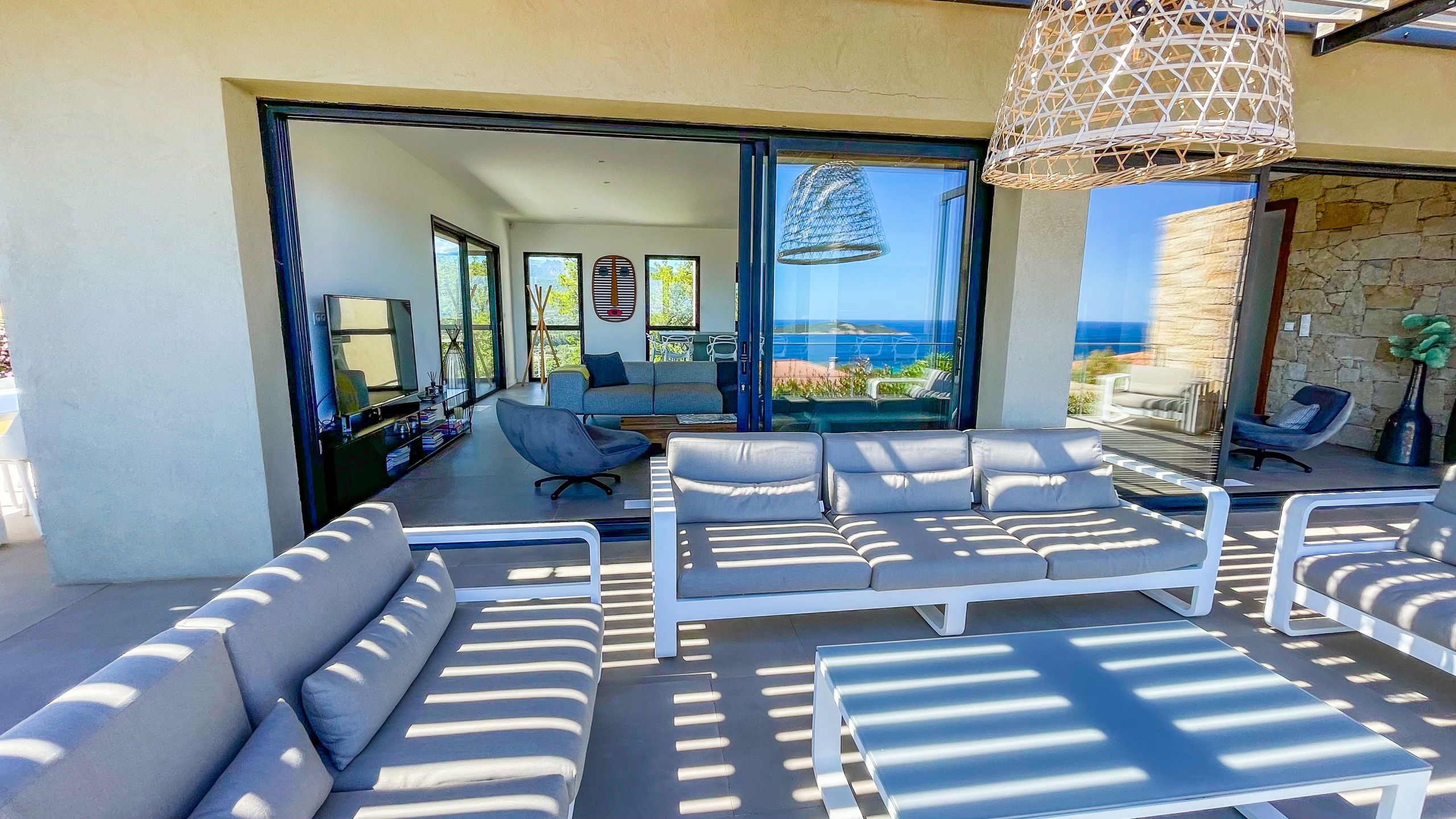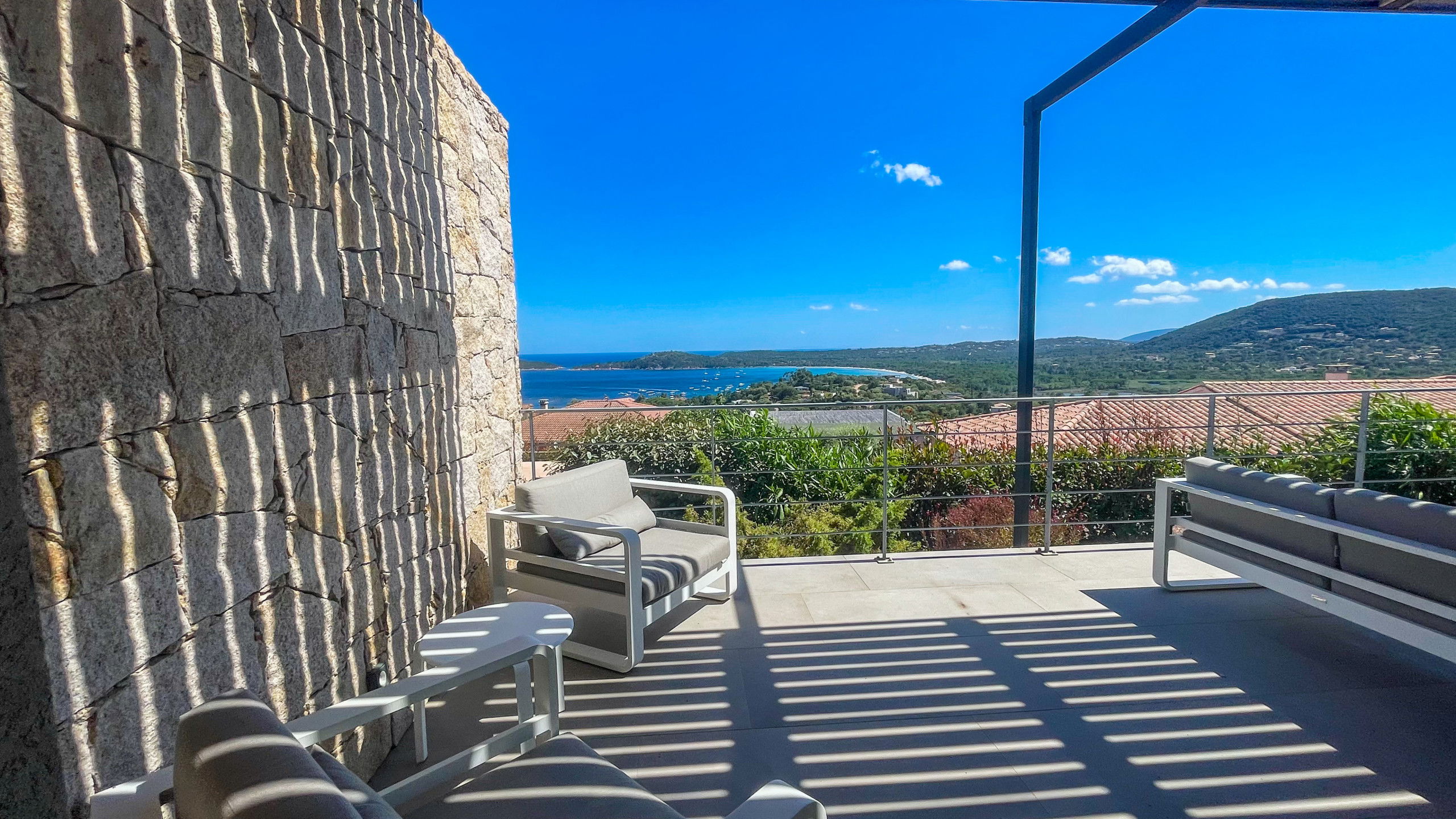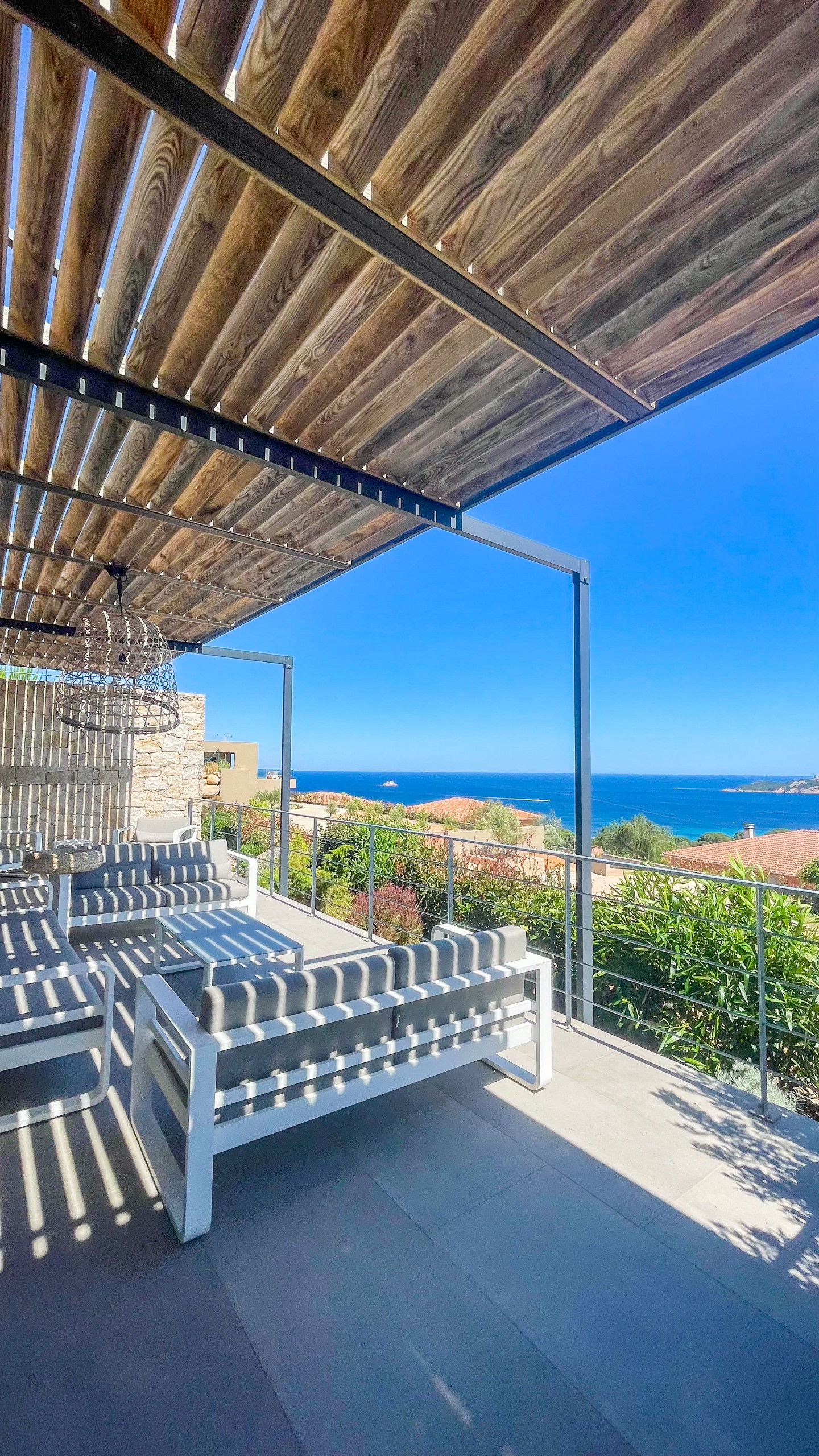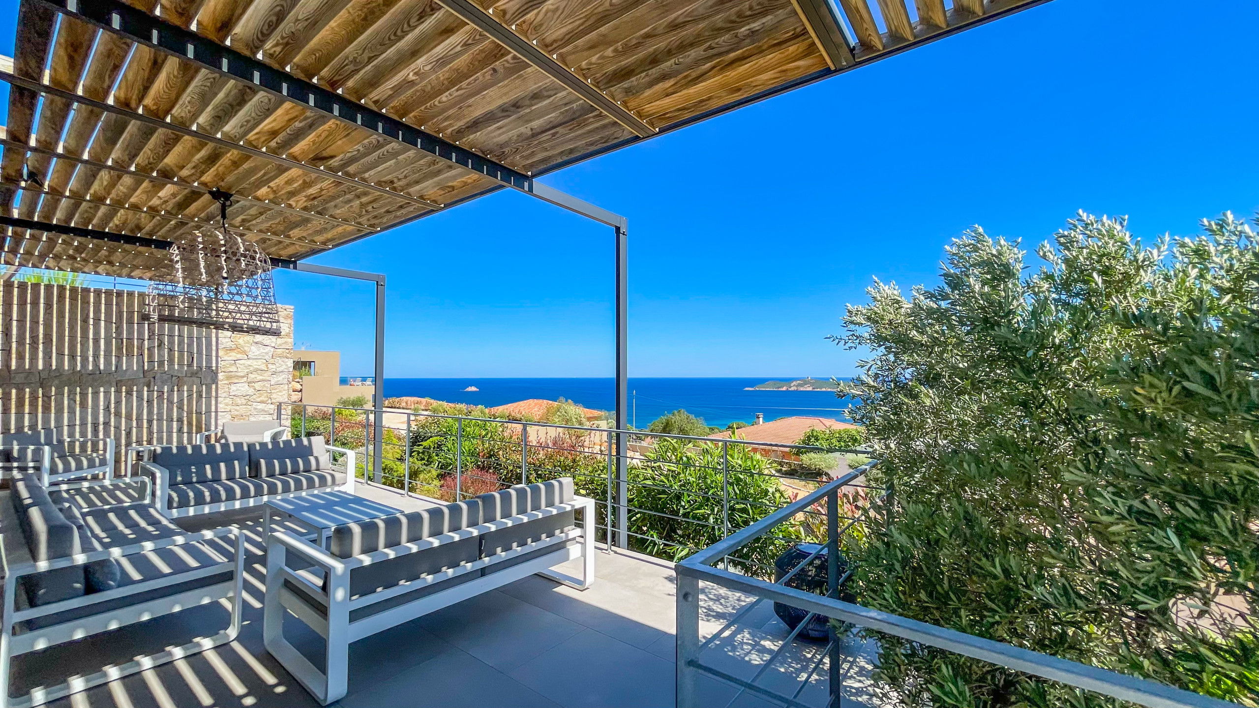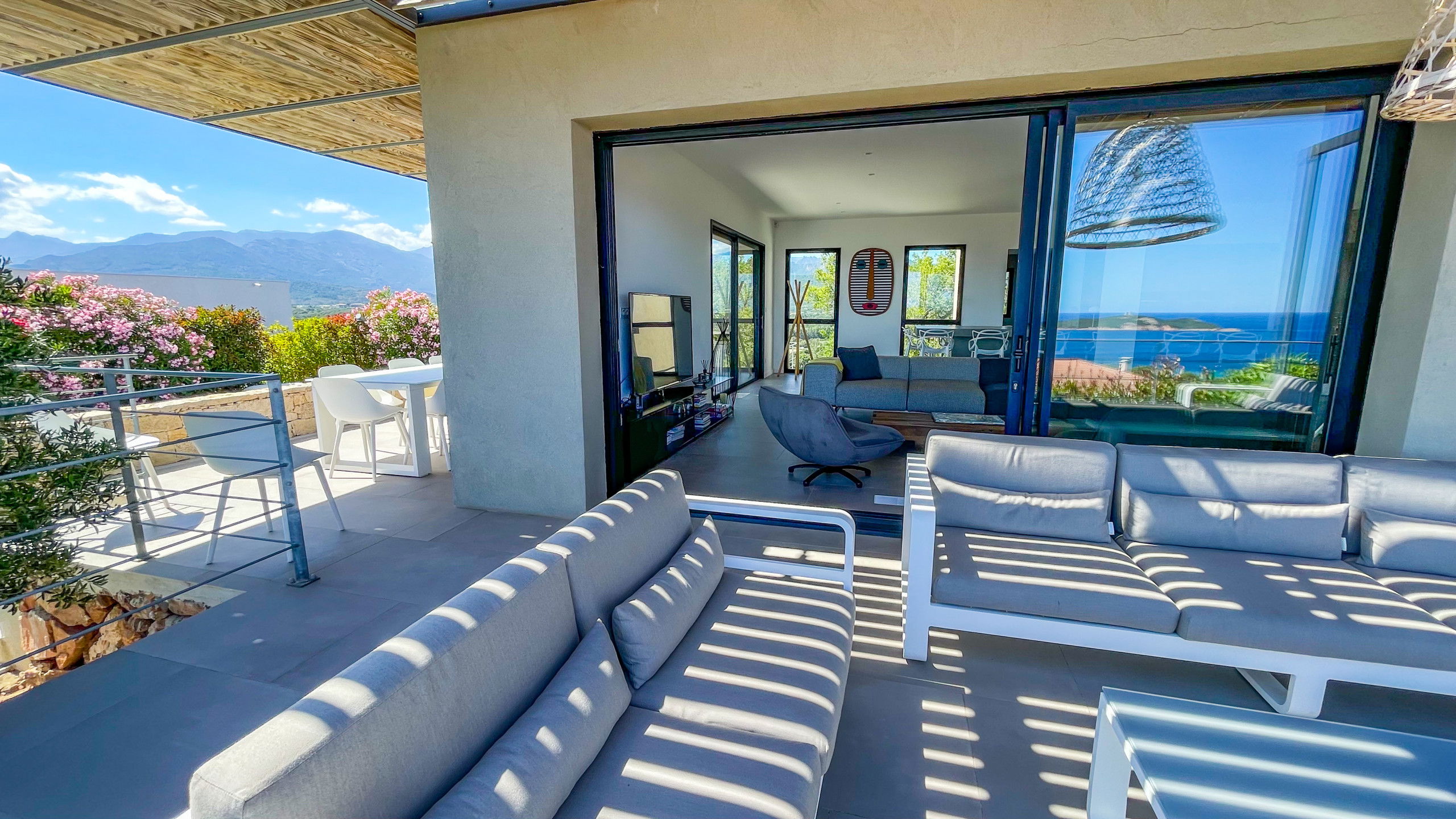 The terrace is very well arranged with an outside living room facing the sea and a shaded dining area with sea and mountain view.