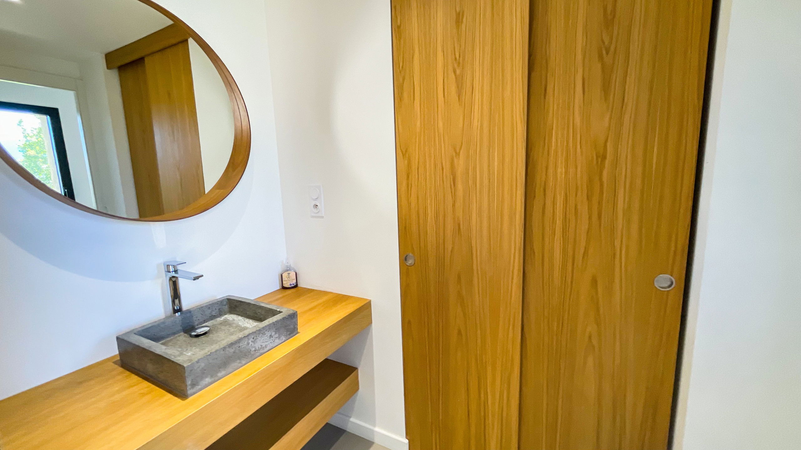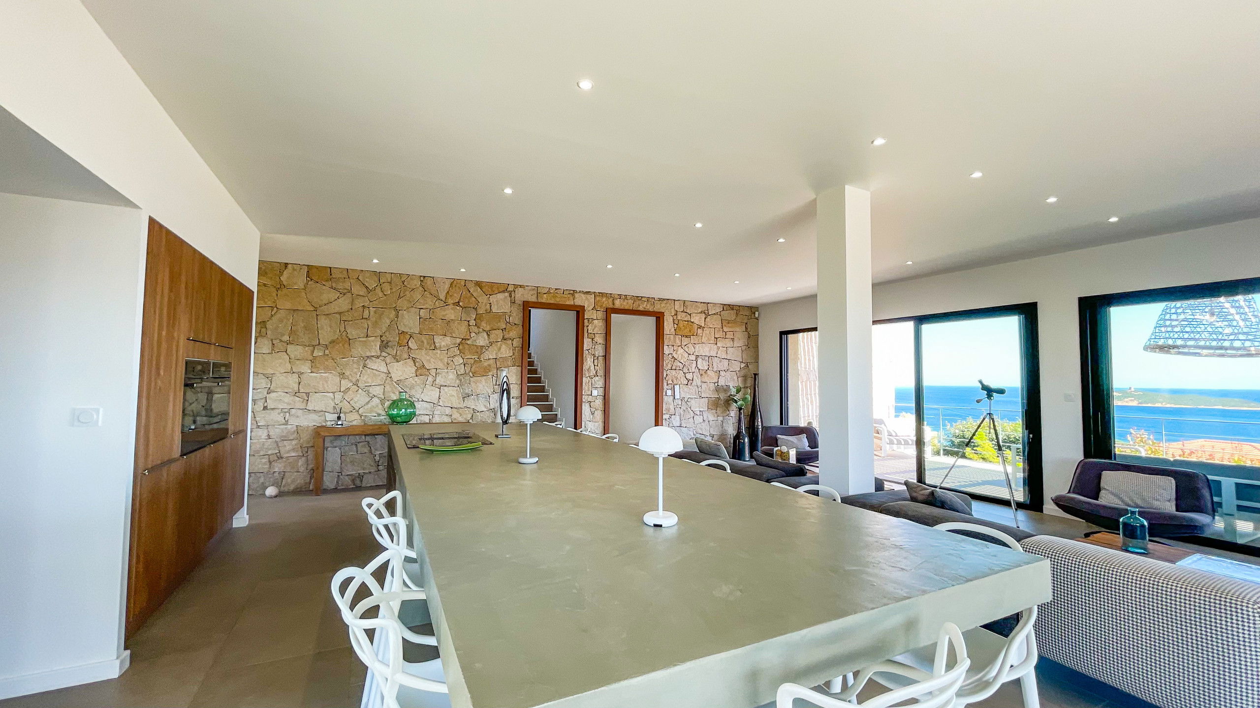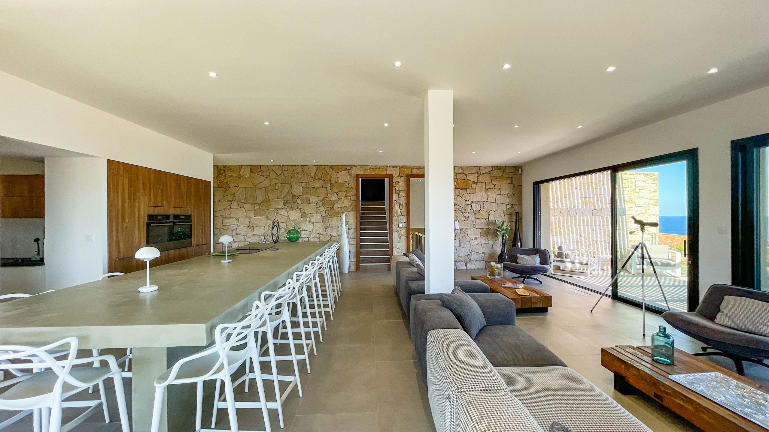 Very nice open kitchen fully equipped with a beautiful central island in waxed concrete.
