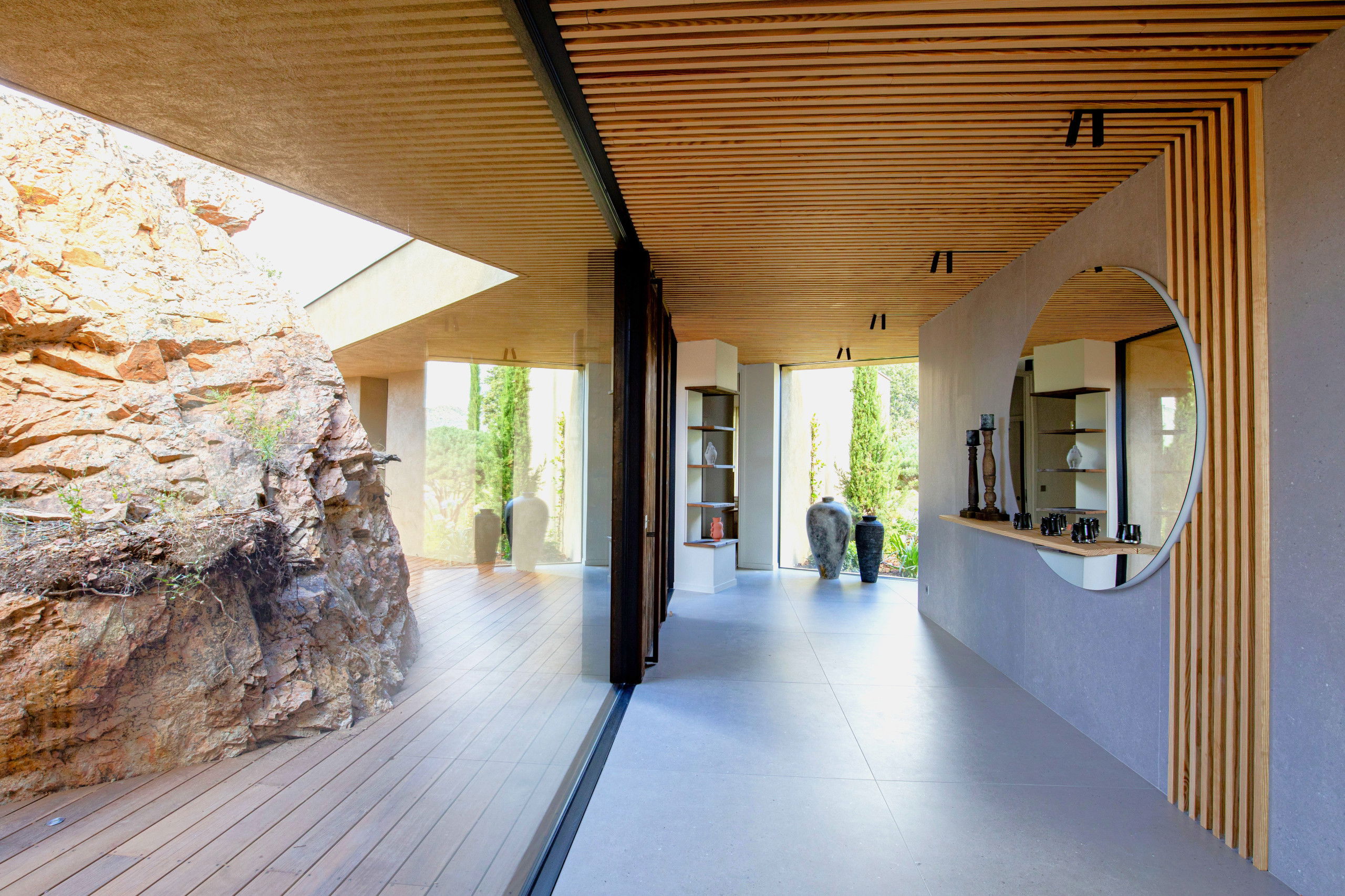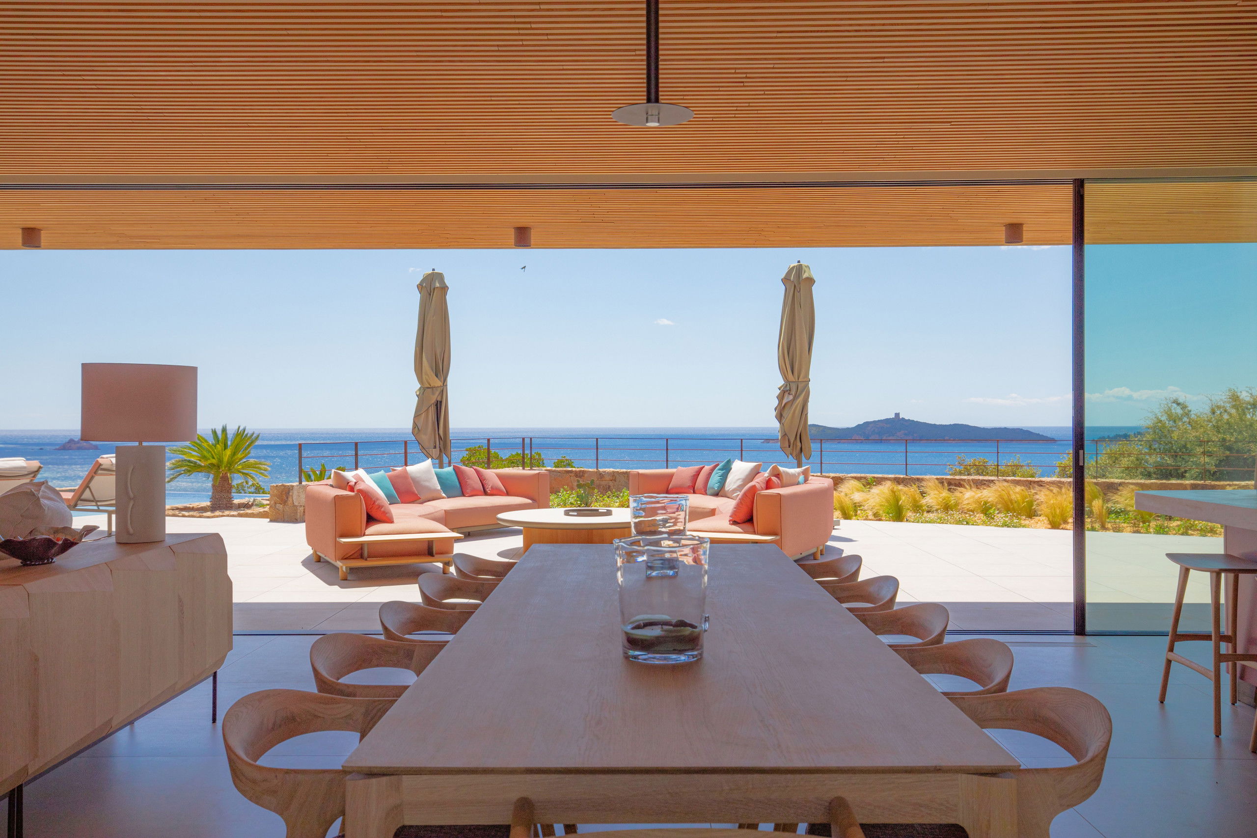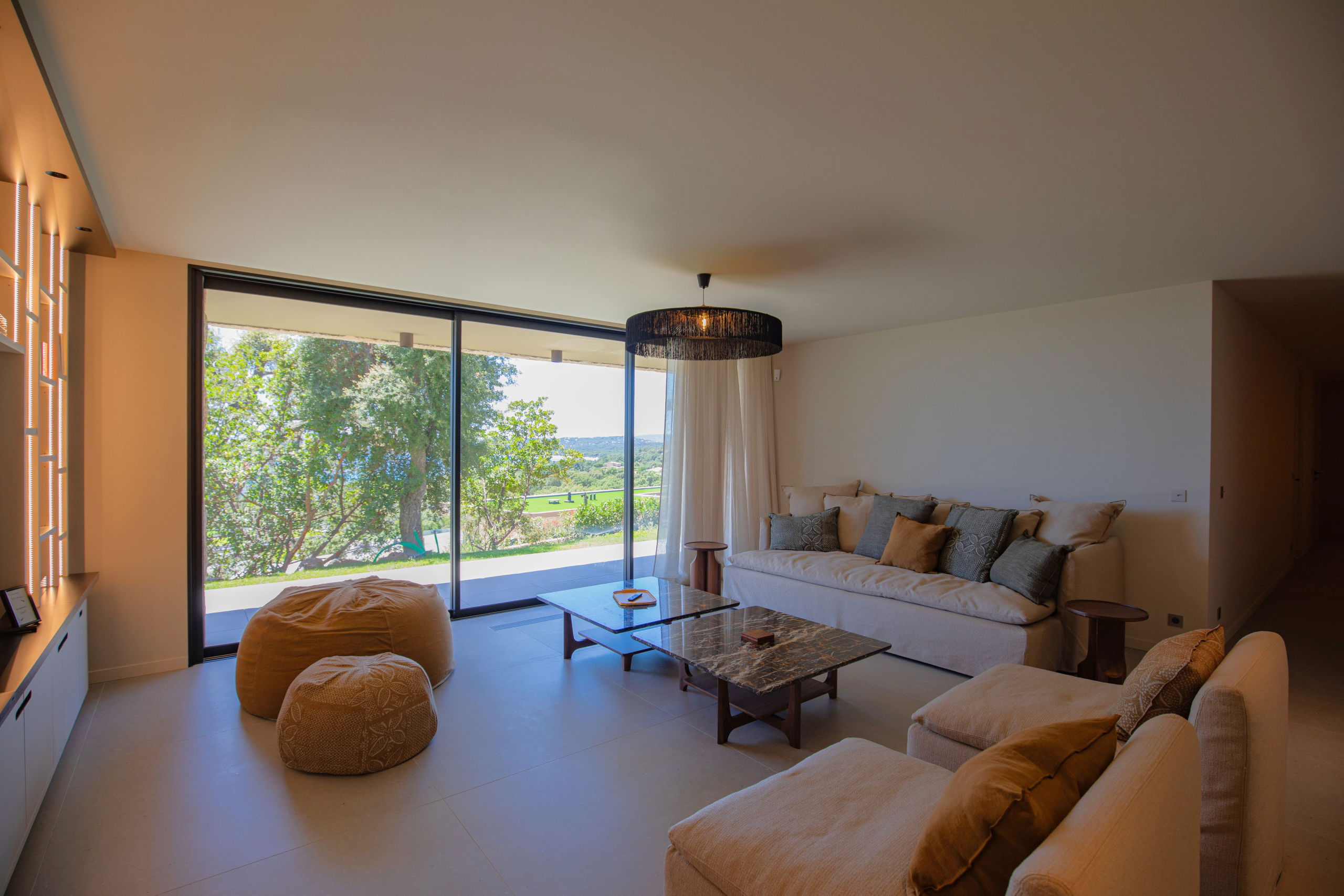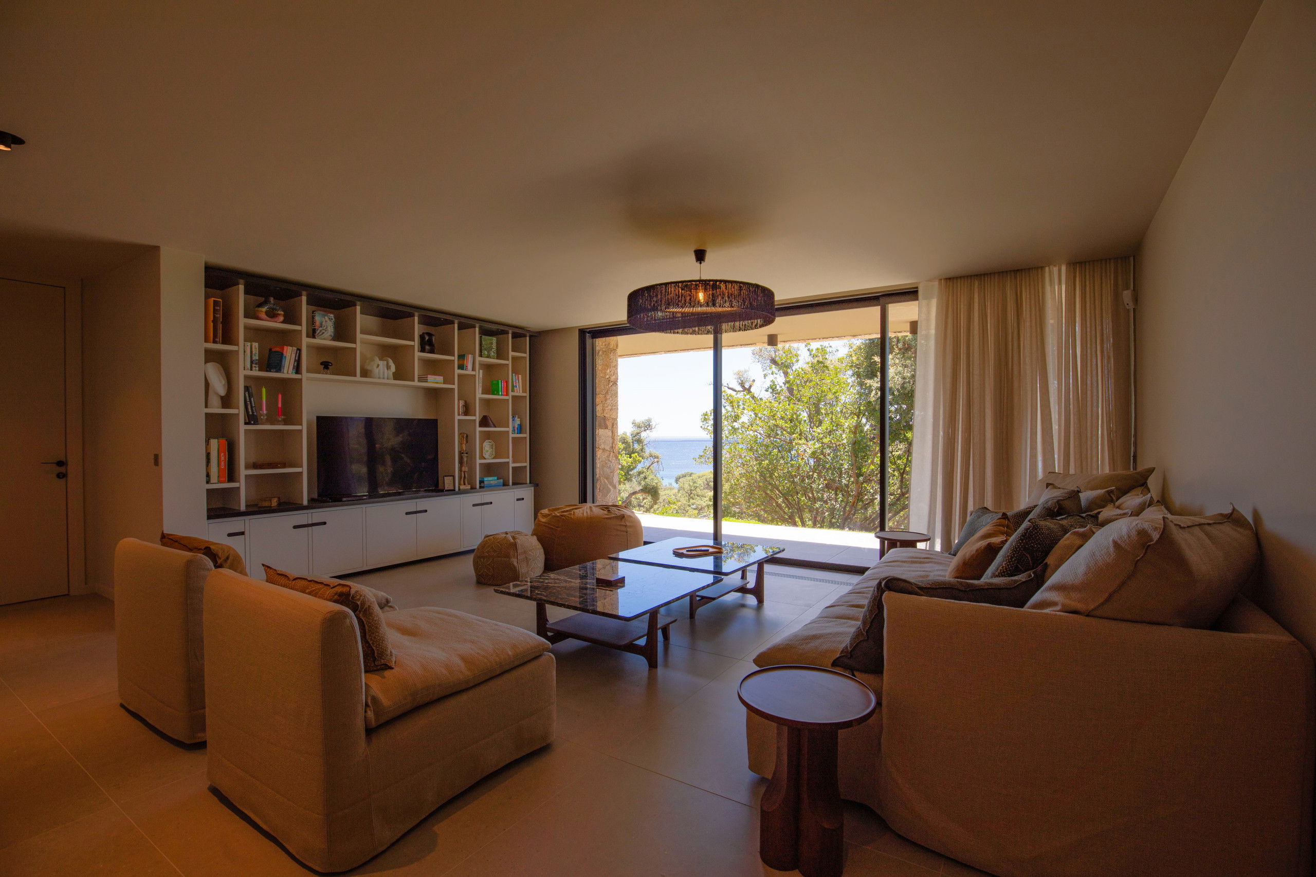 - Relaxation area with sofa, library and TV, opening onto a terrace with sea view.