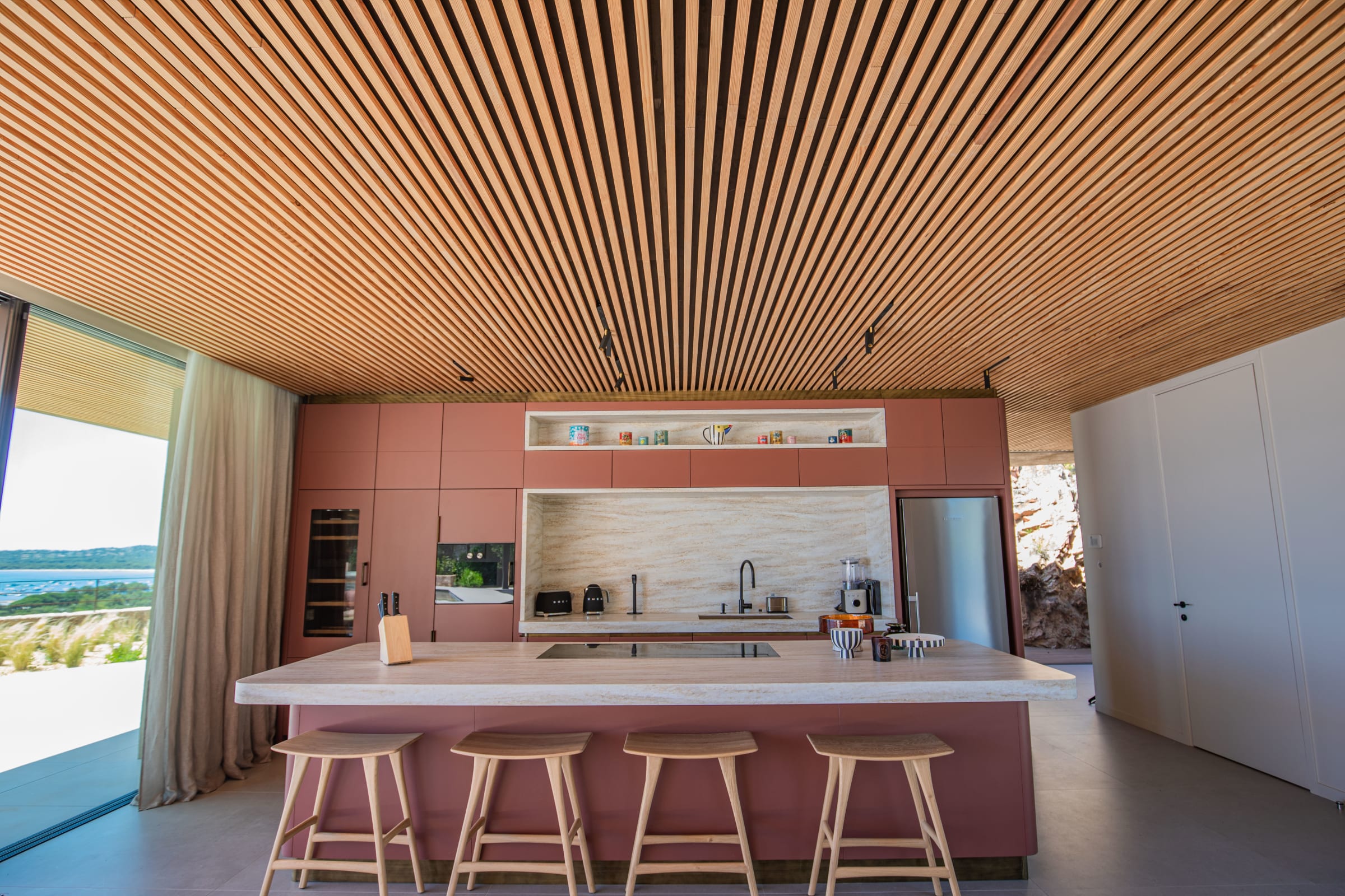 * Equipped kitchen with central island, American fridge, SMEG appliances (blender, toaster, kettle), wine cellar.