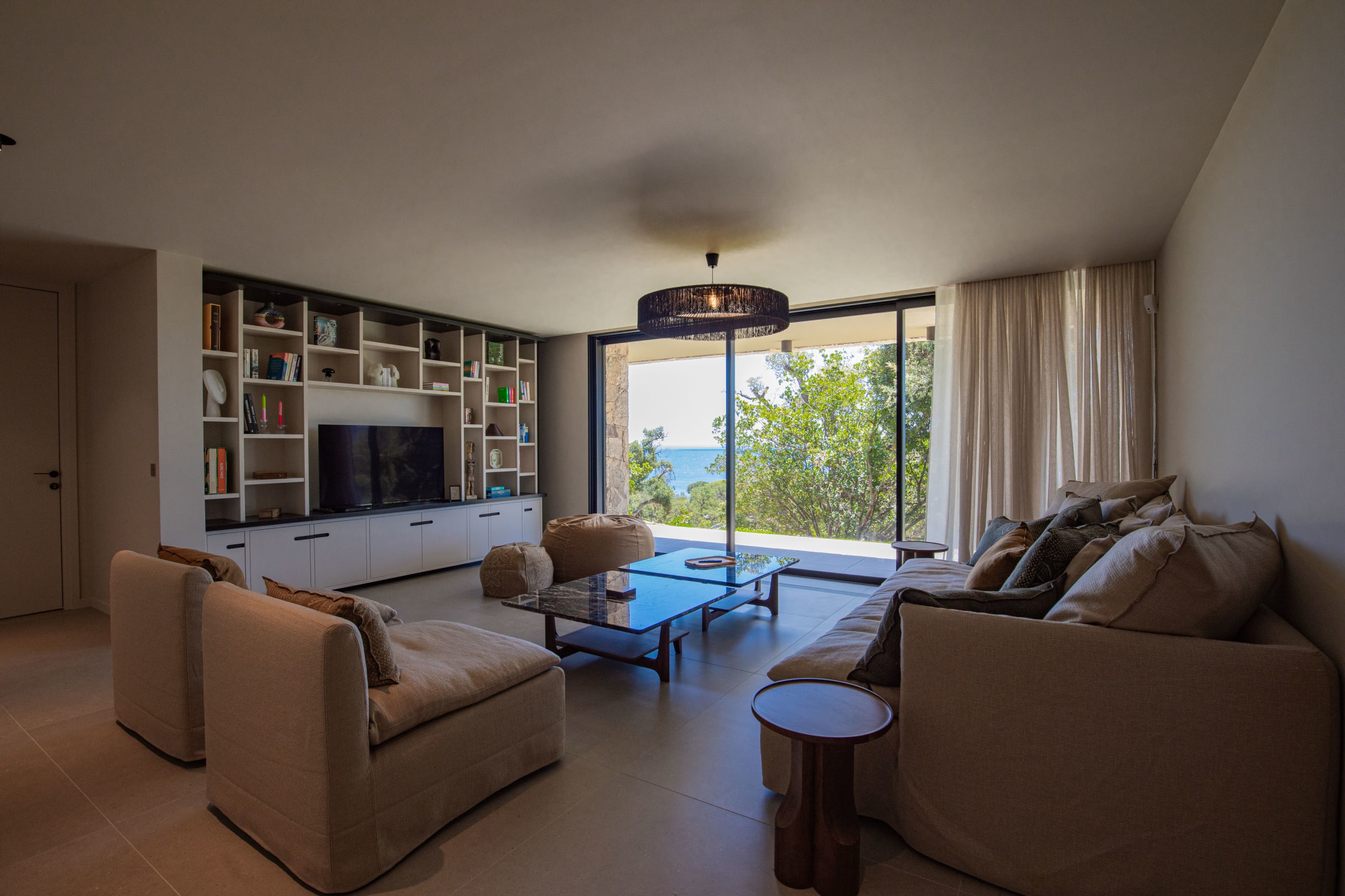 - Relaxation area with sofa, library and television, open to a terrace with sea view.