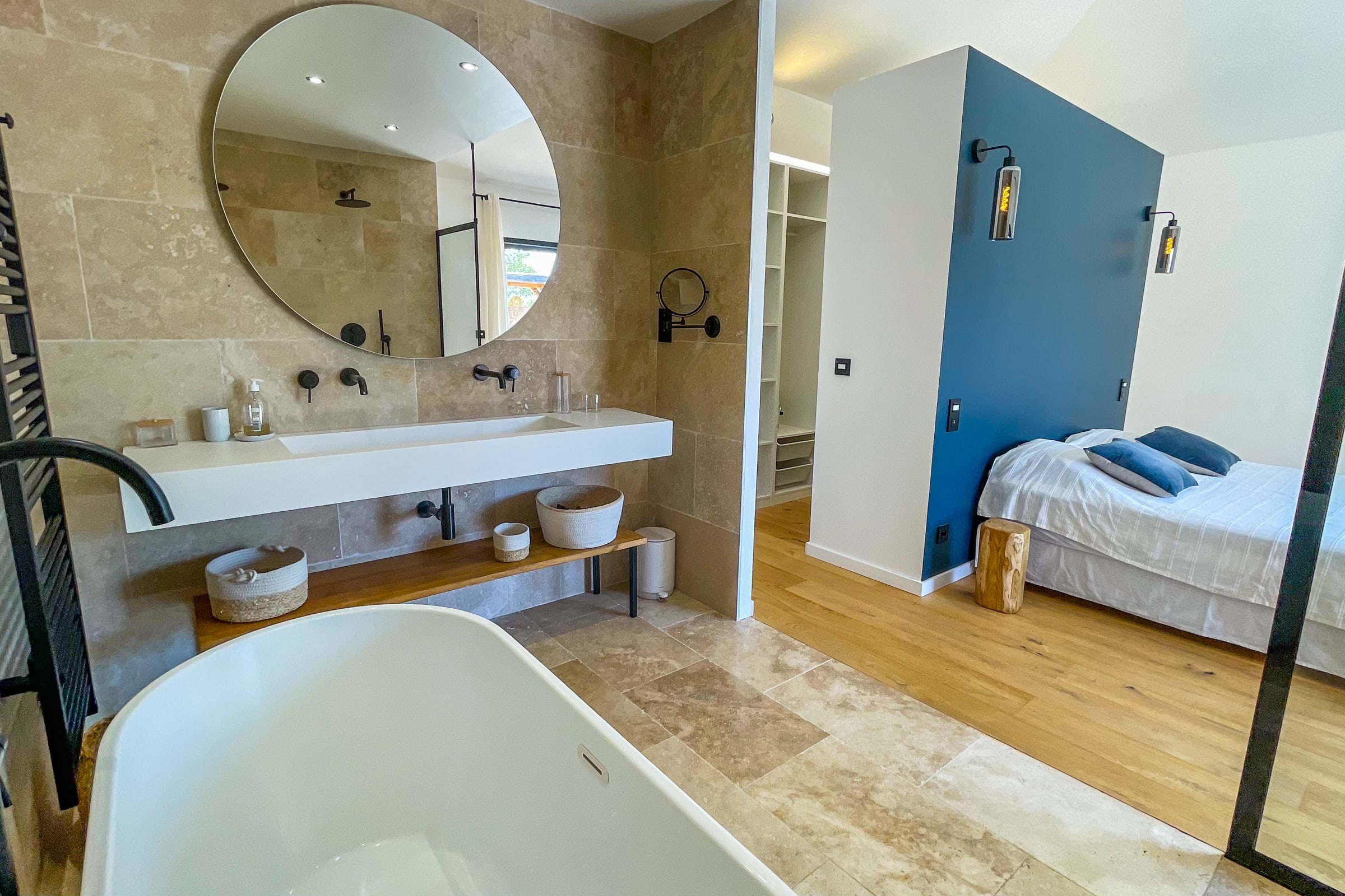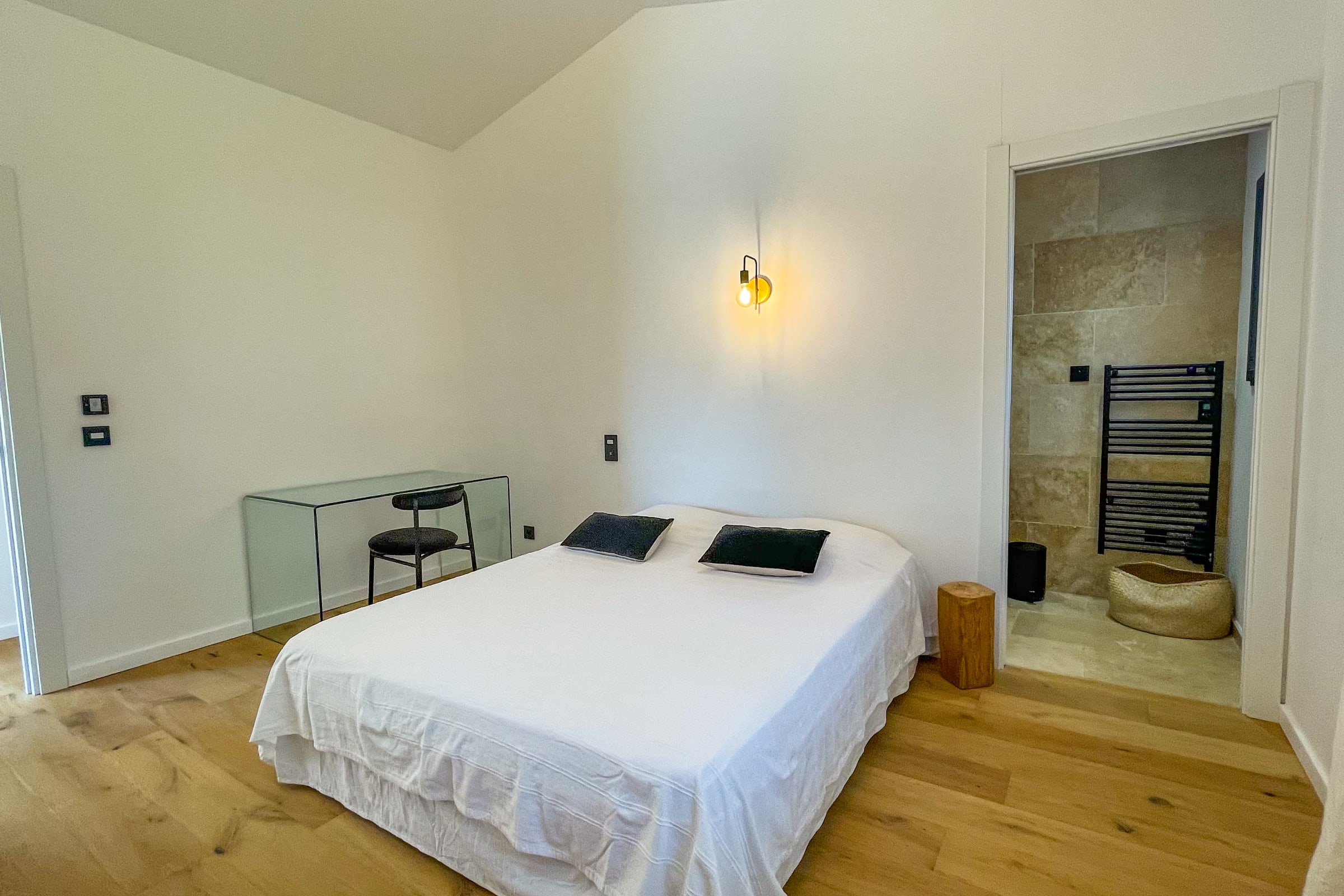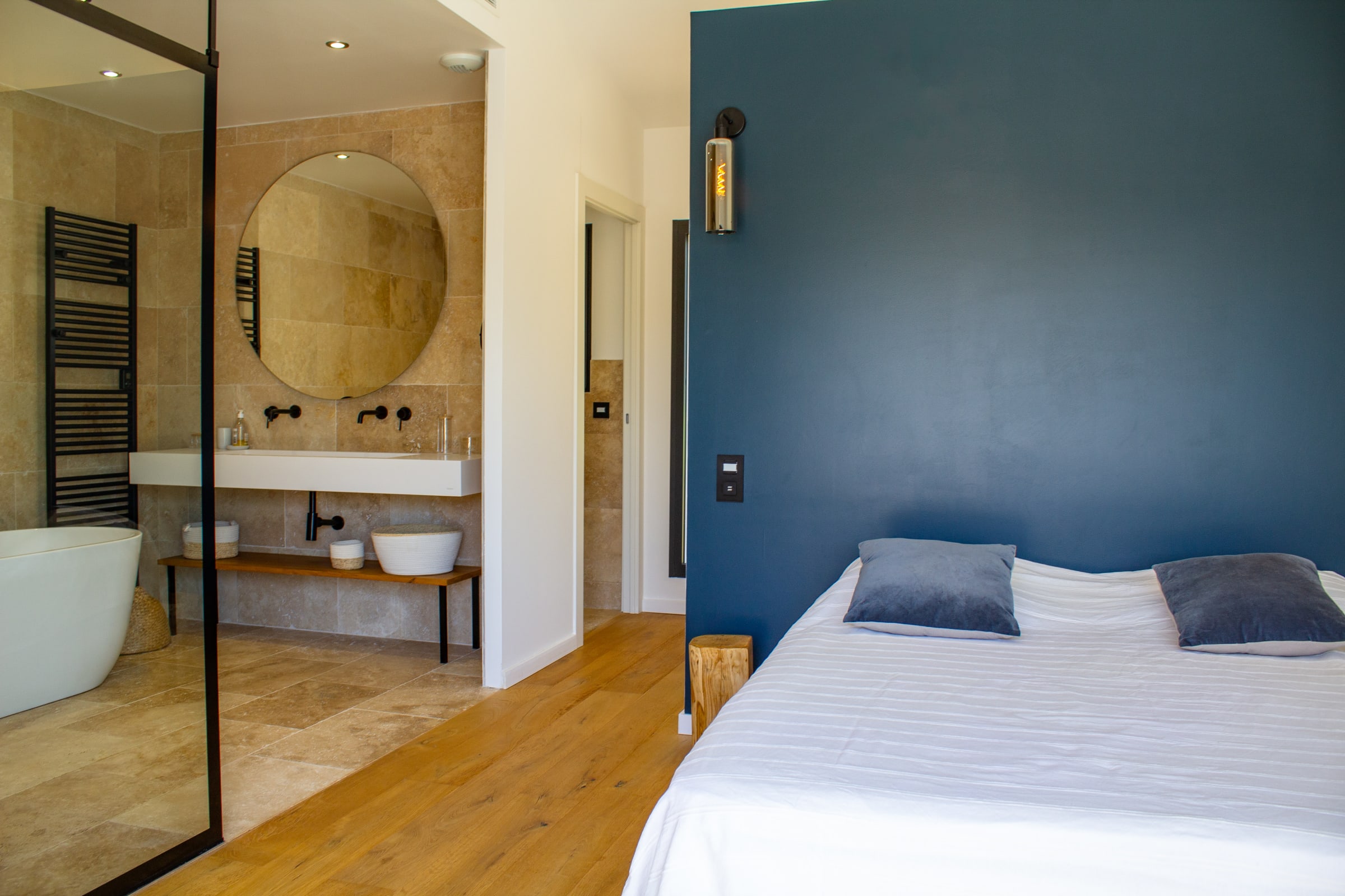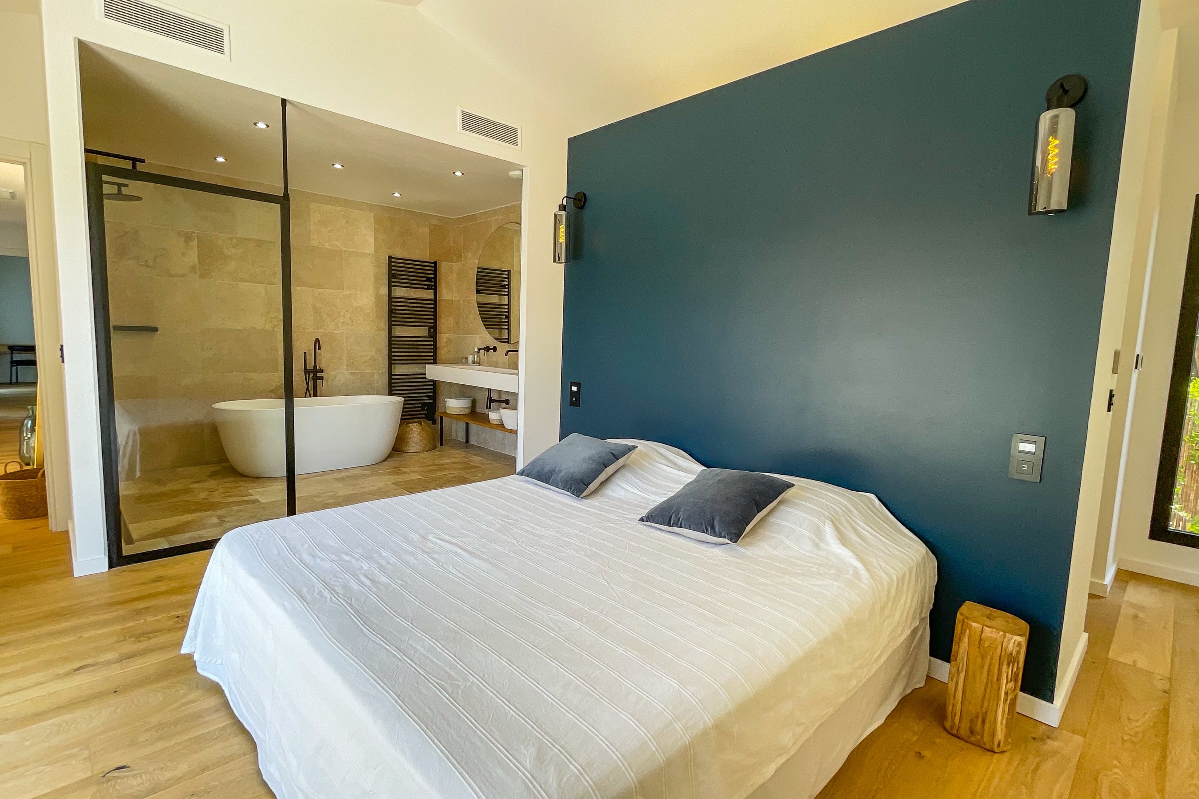 Bedroom 1: Master suite with King Size bed (180 * 200), private bathroom with bath, shower and toilet and direct access to the terrace overlooking the pool.