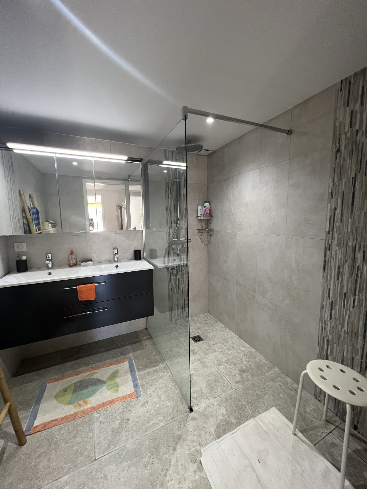 - A shower room with double sinks.