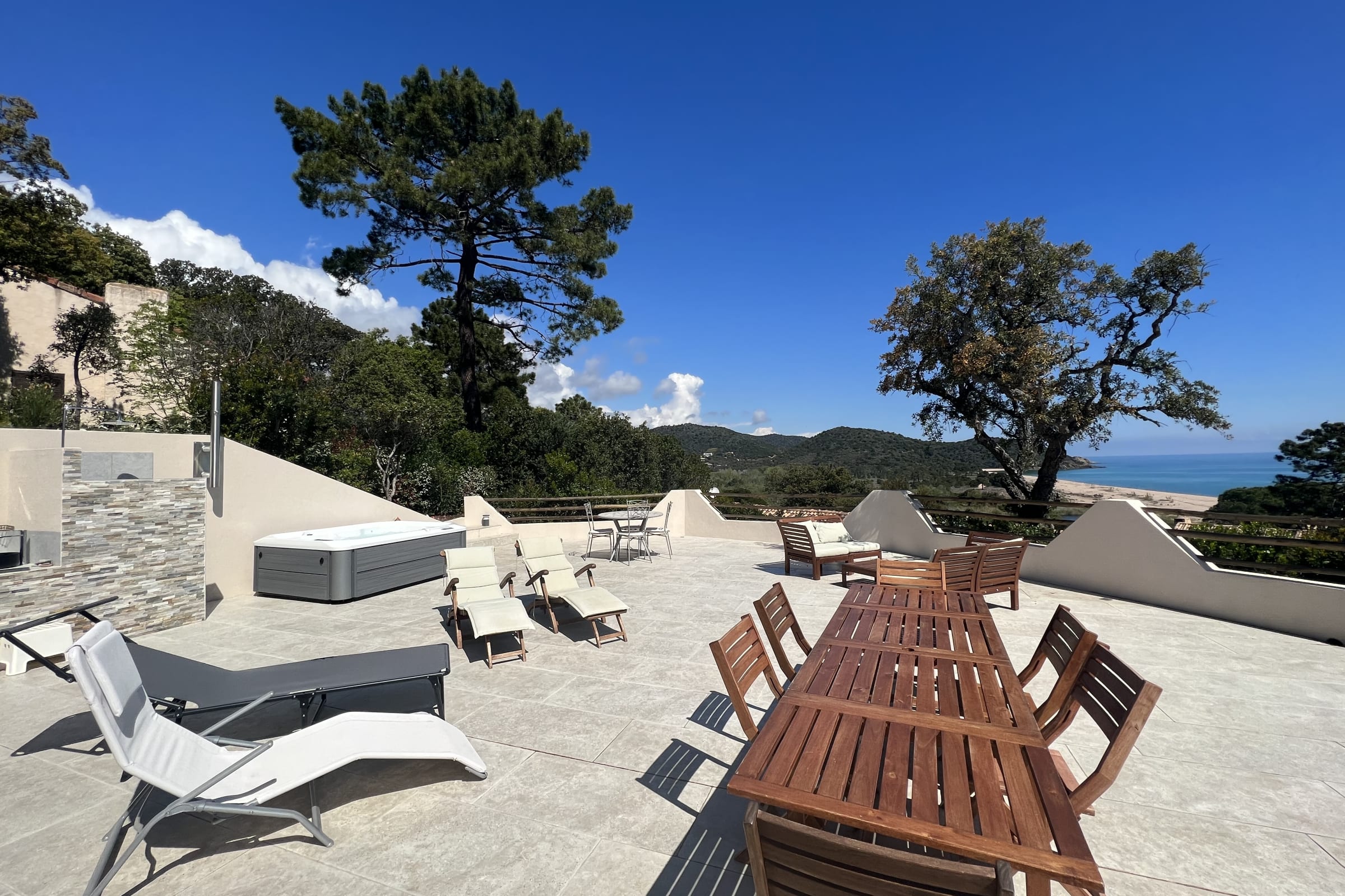 A large terrace with jacuzzi, dining table for 6, barbecue, sunbathing and large shade sail to protect from the sun.