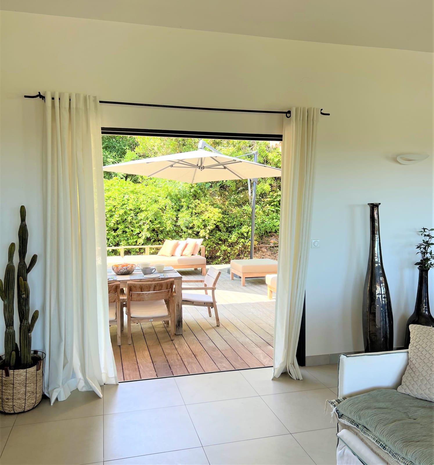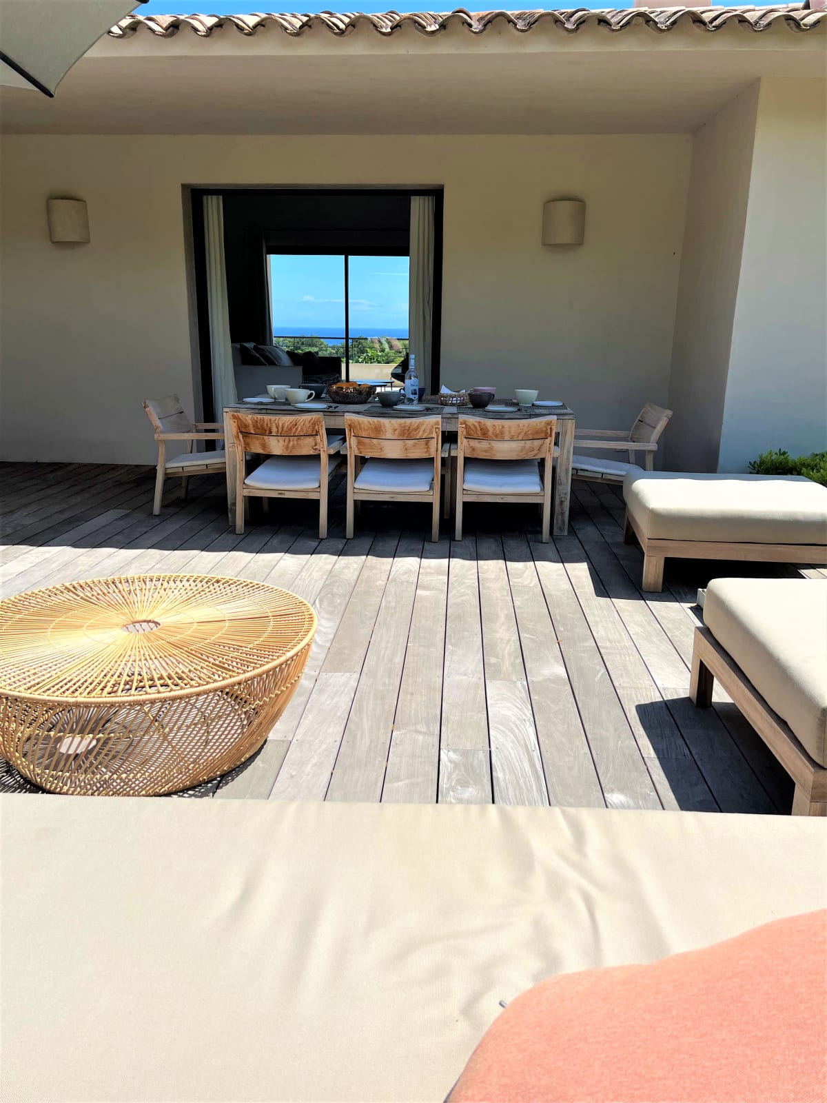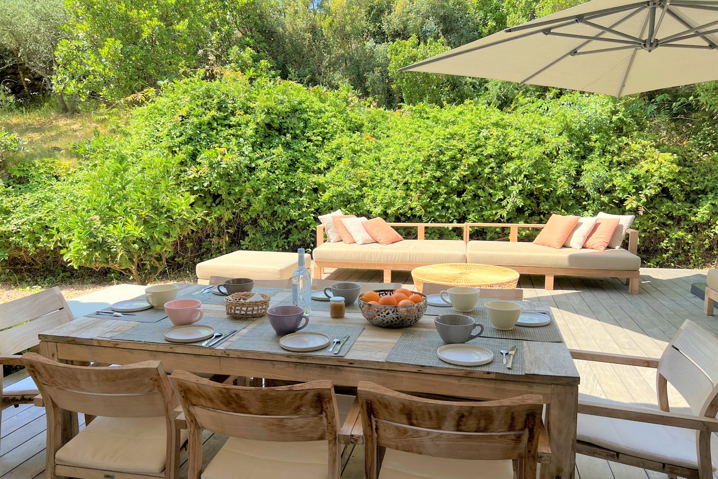 A back terrace: accessible via the kitchen or the living room, ideal place for relaxation with sofas and armchairs. Shaded place in the morning to have breakfast in the cool.