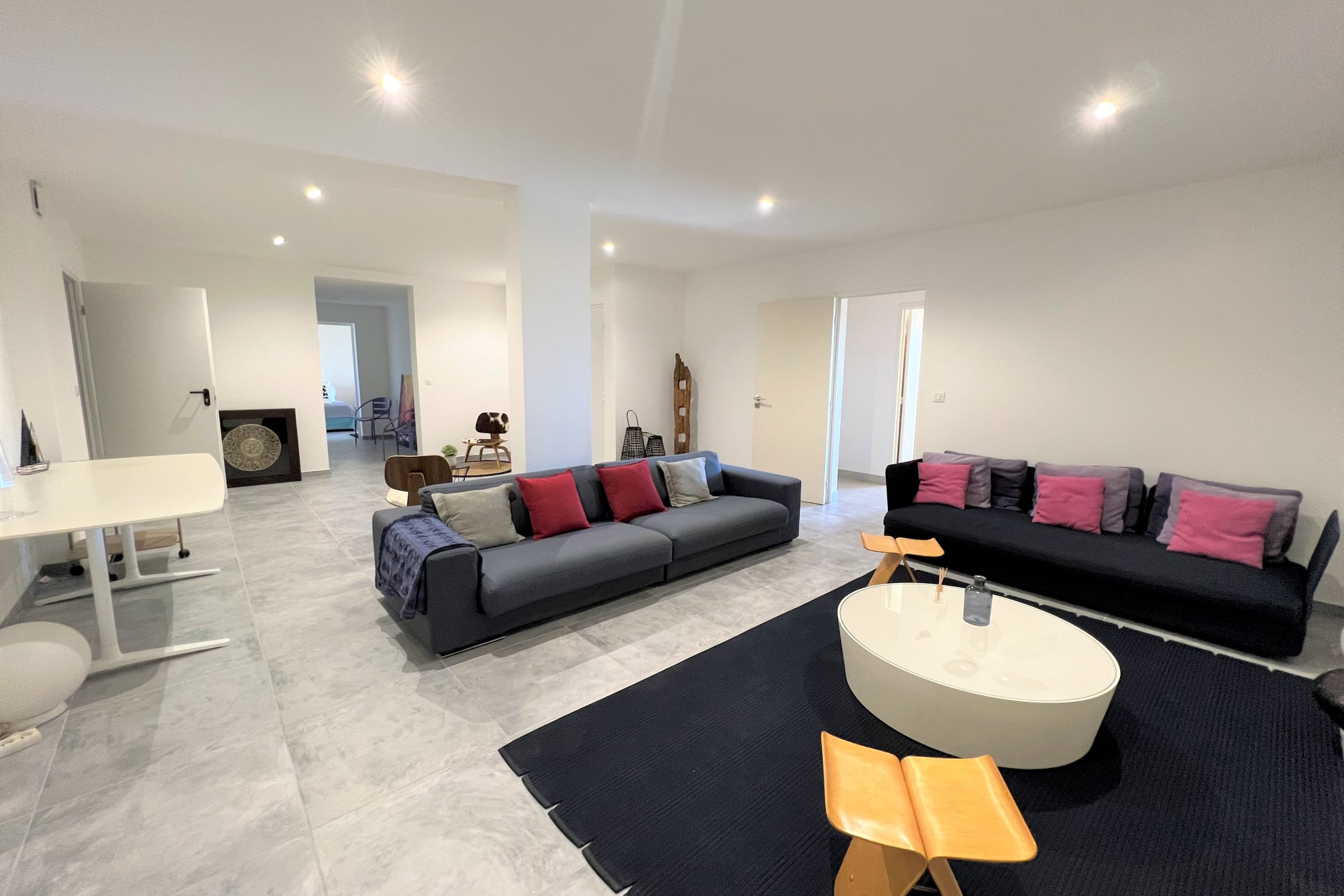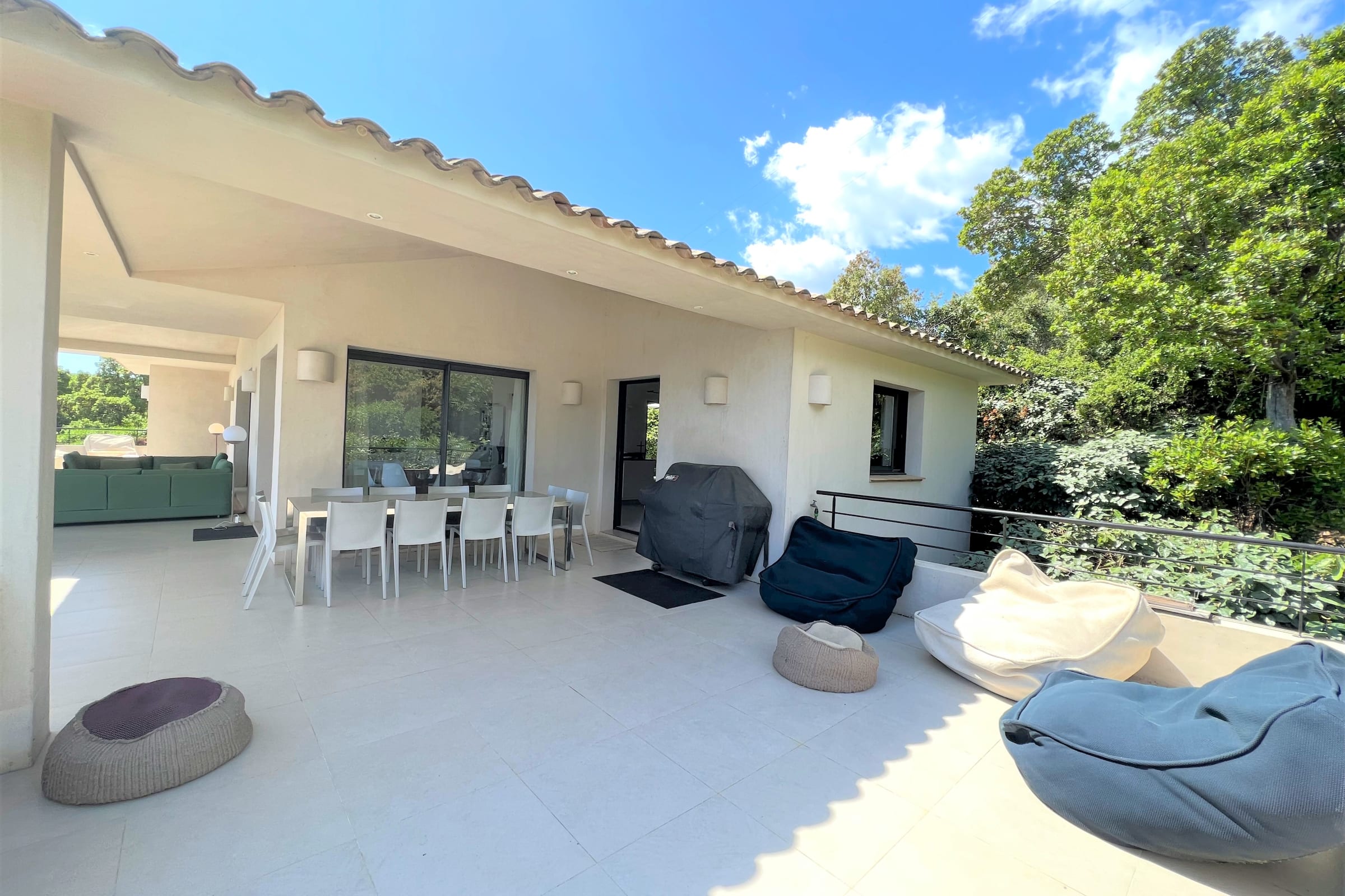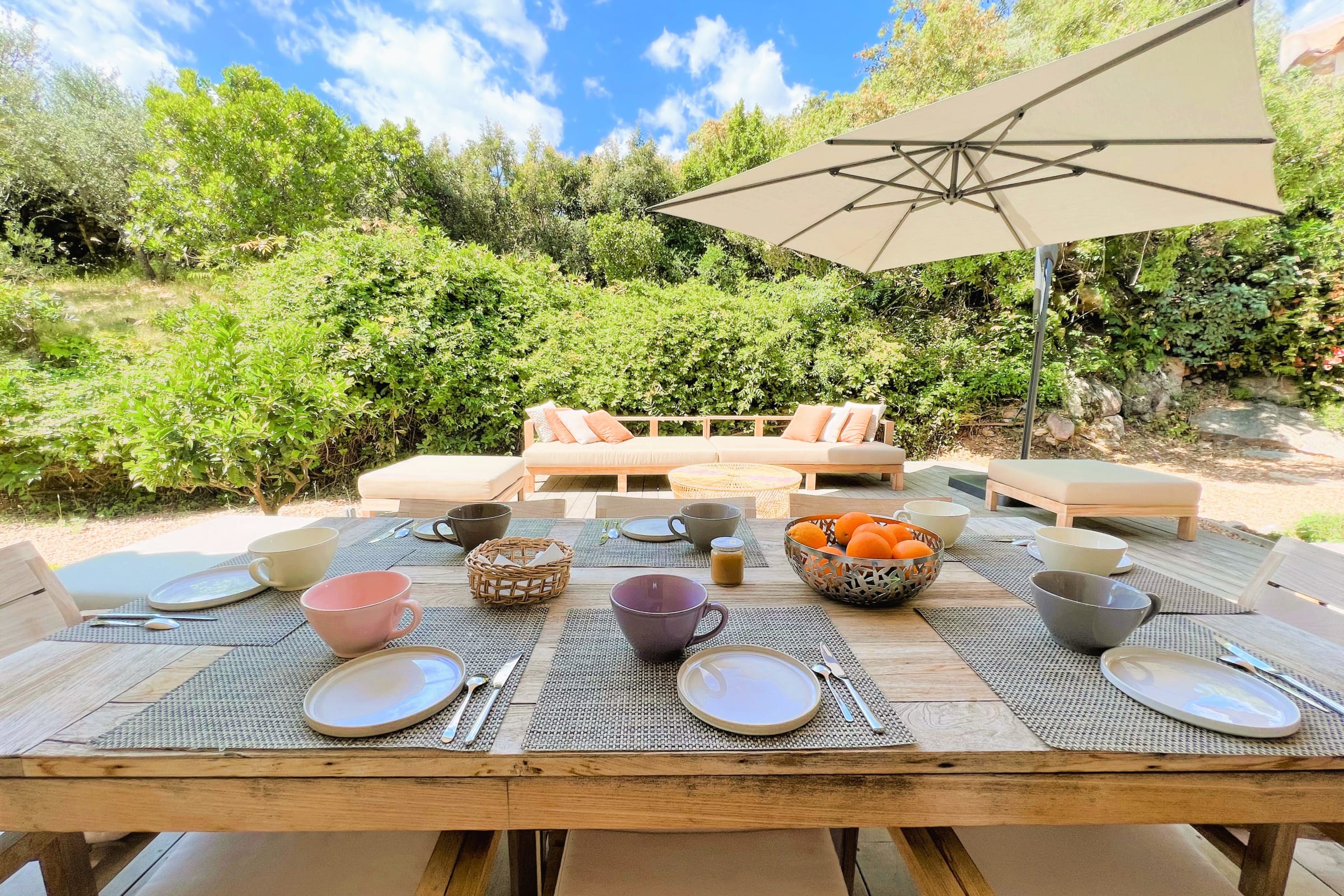 A back terrace: accessible via the kitchen or the living room, ideal place for relaxation with sofas and armchairs. Shaded place in the morning to have breakfast in the cool.