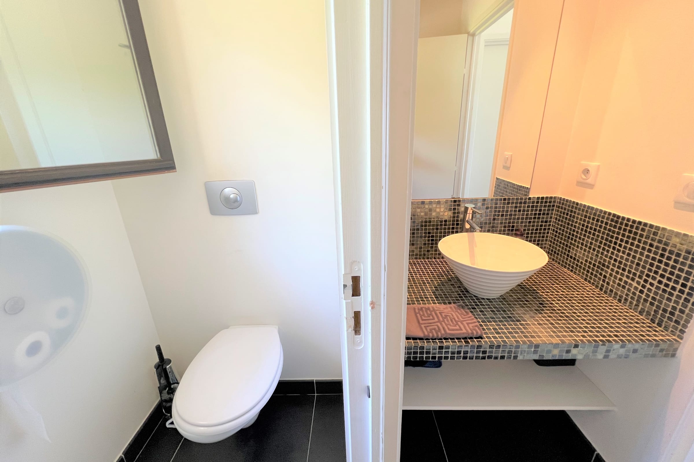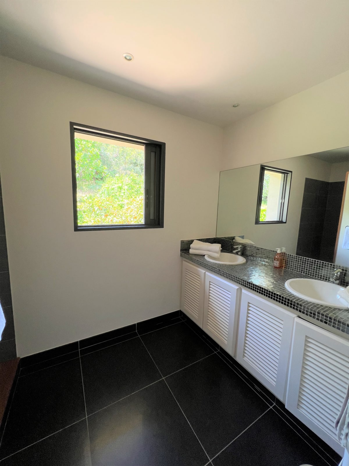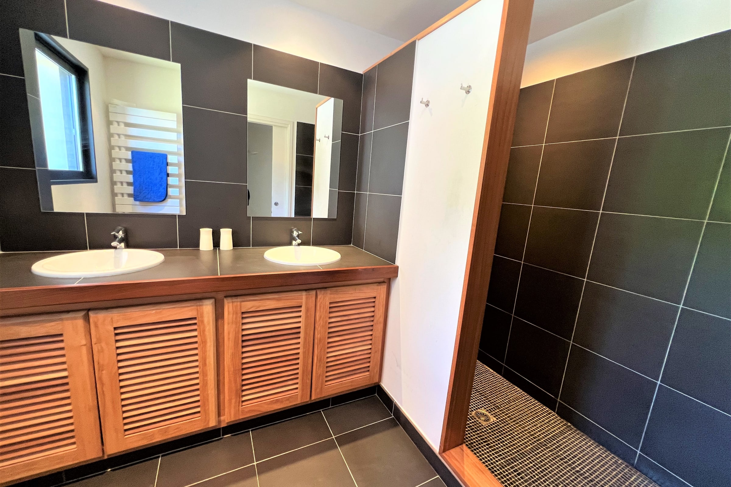 The villa is composed of a large living / dining room with adjoining kitchen. The living room has a large bay window with glazing giving access to a terrace facing the sea and a second bay window at the back giving access to a back terrace ideal for having lunch outside while staying out of the sun in summer. The living area enjoys a beautiful brightness with these two through openings.