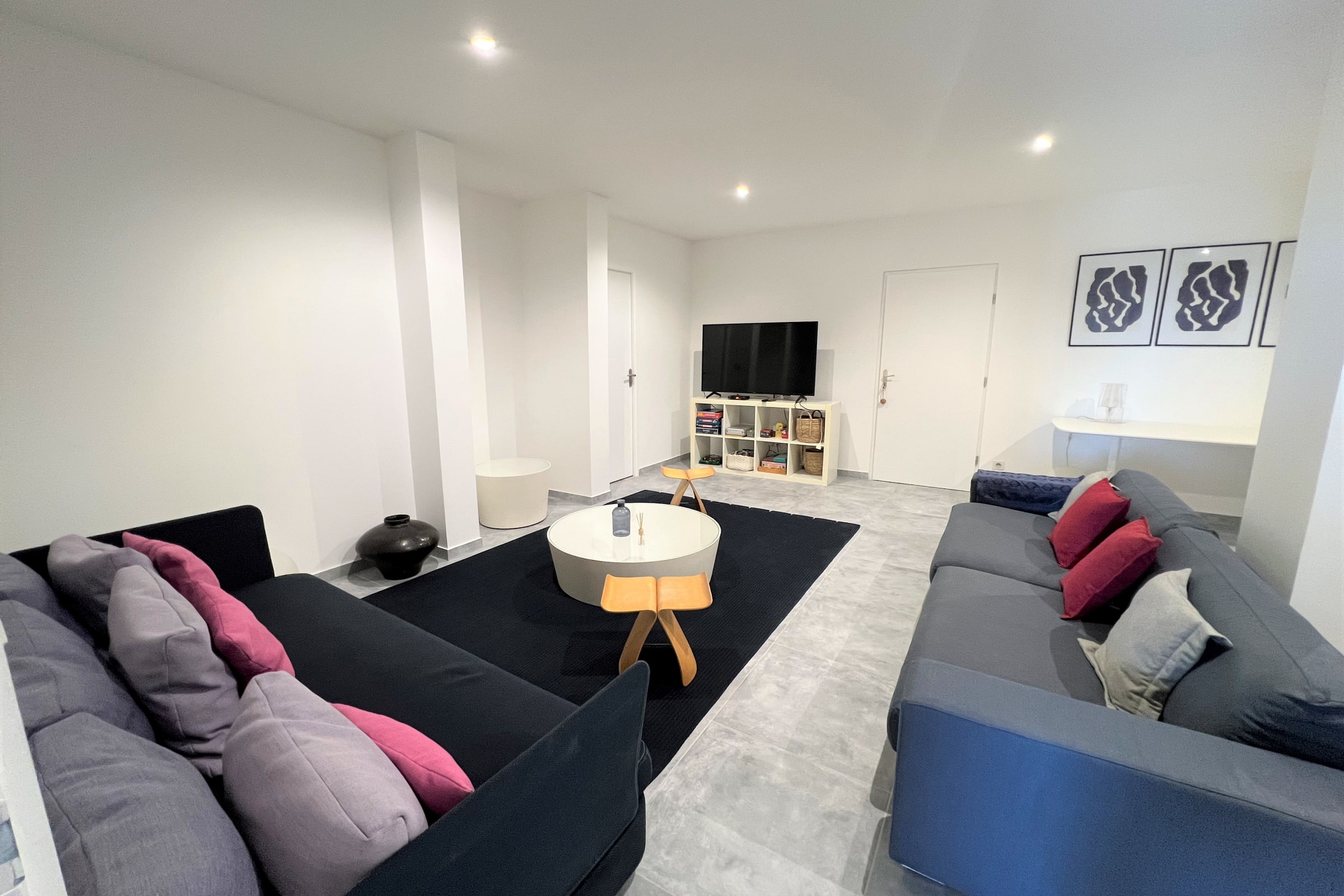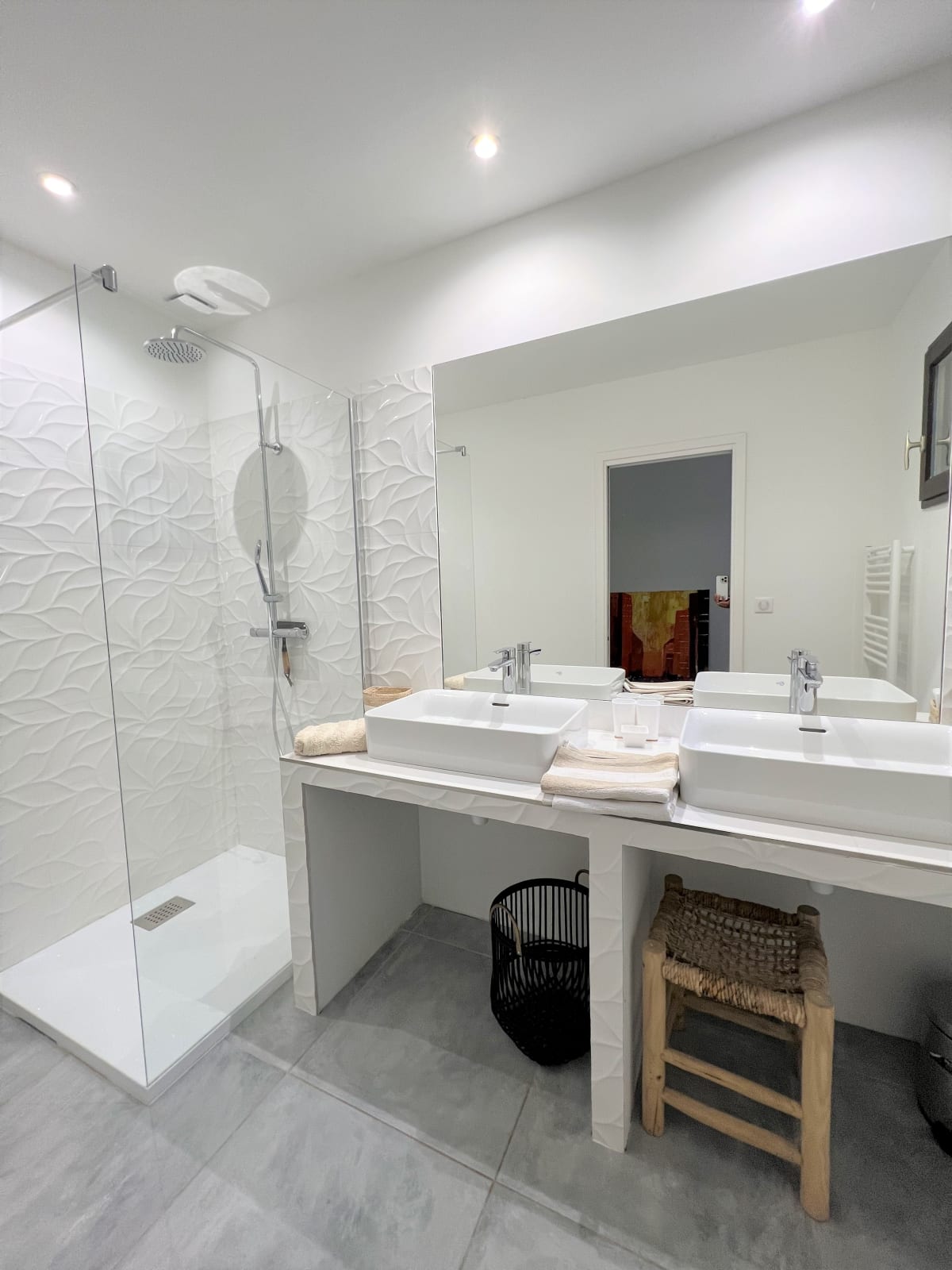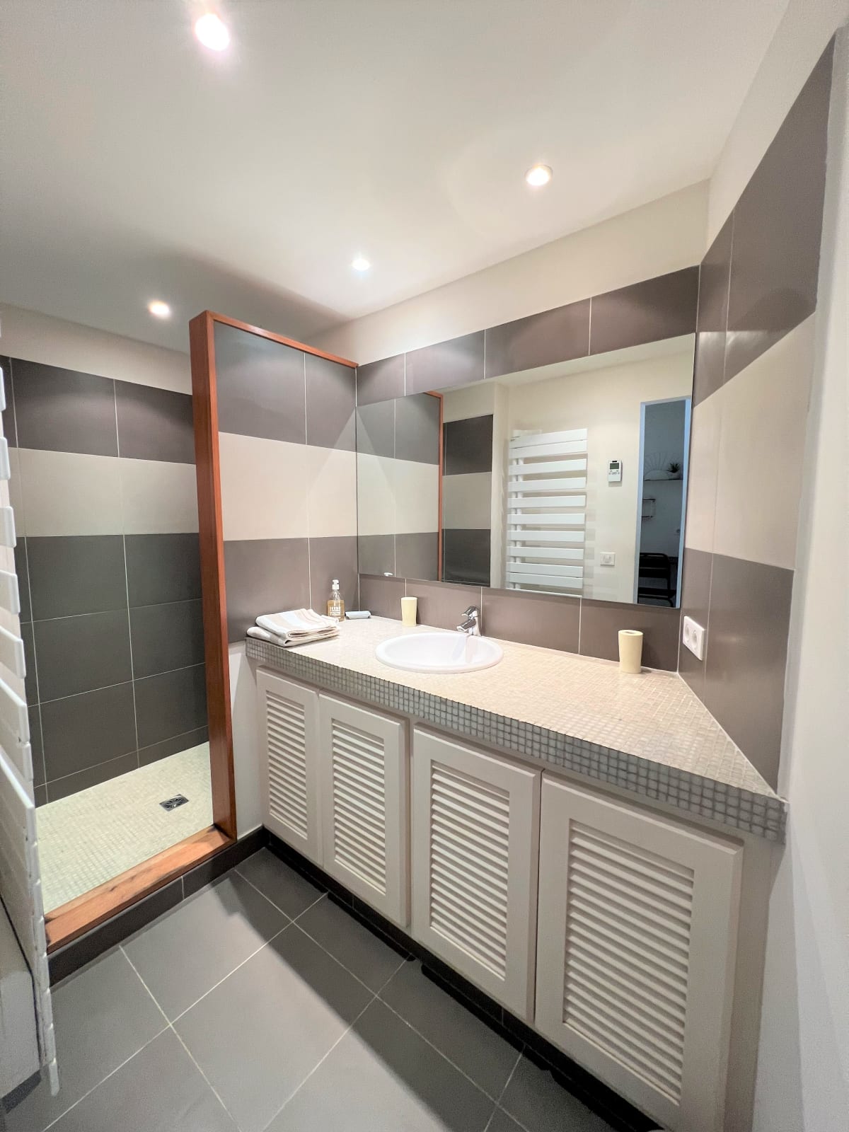 The villa is composed of a large living / dining room with adjoining kitchen. The living room has a large bay window with glazing giving access to a terrace facing the sea and a second bay window at the back giving access to a back terrace ideal for having lunch outside while staying out of the sun in summer. The living area enjoys a beautiful brightness with these two through openings.