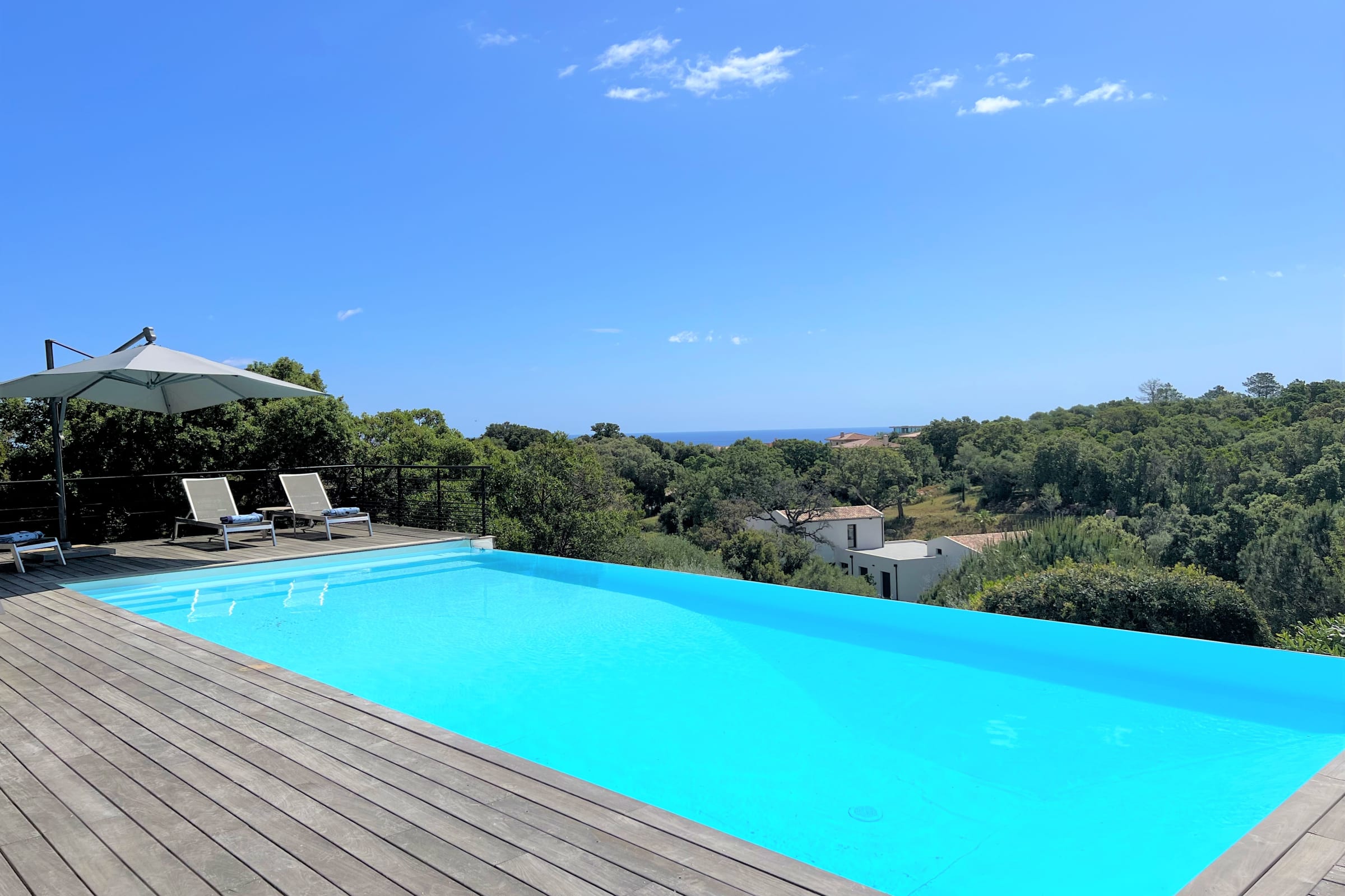 The swimming pool area: equipped with sun loungers and parasols. The infinity pool is 11*5m. An outdoor shower is also available.
