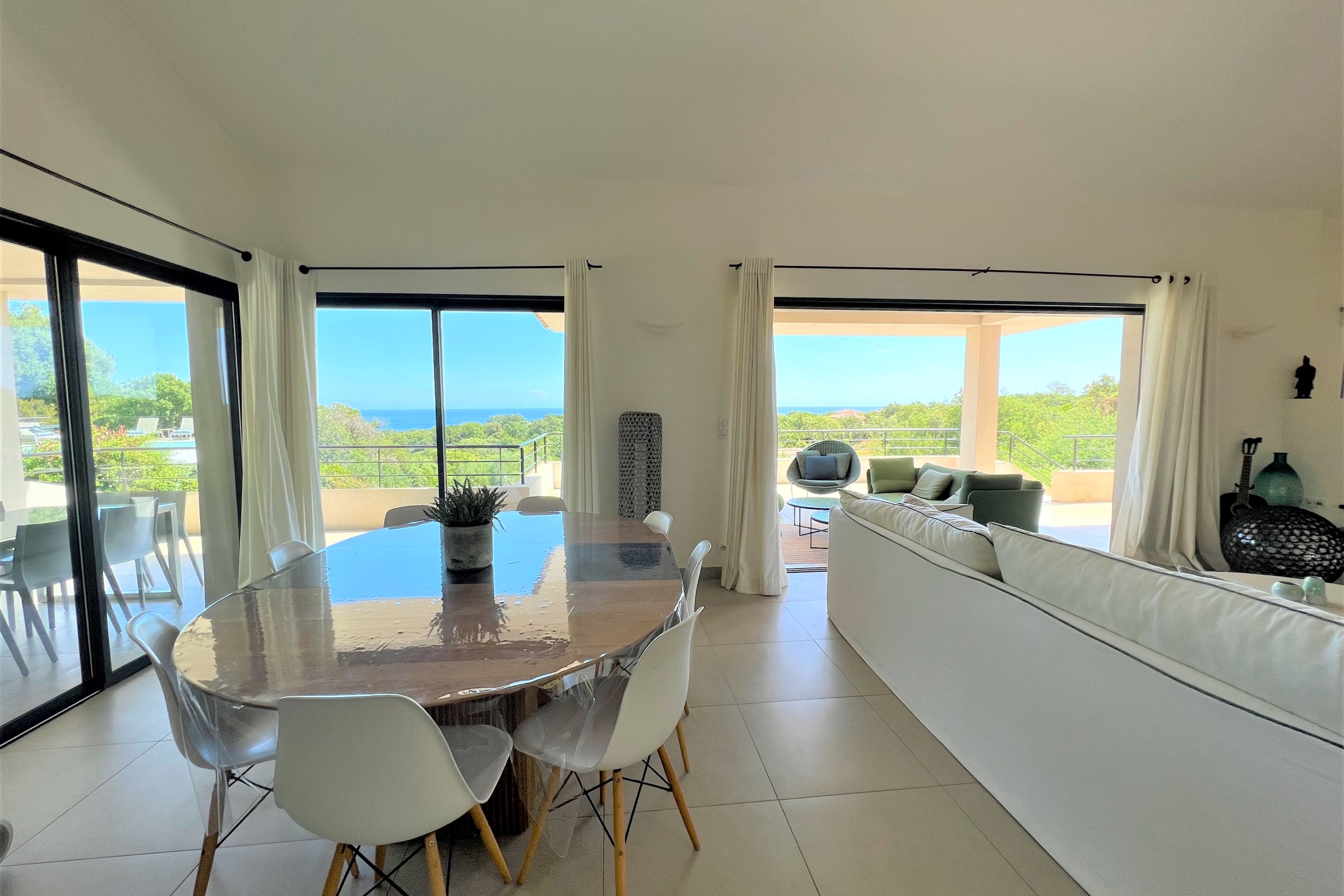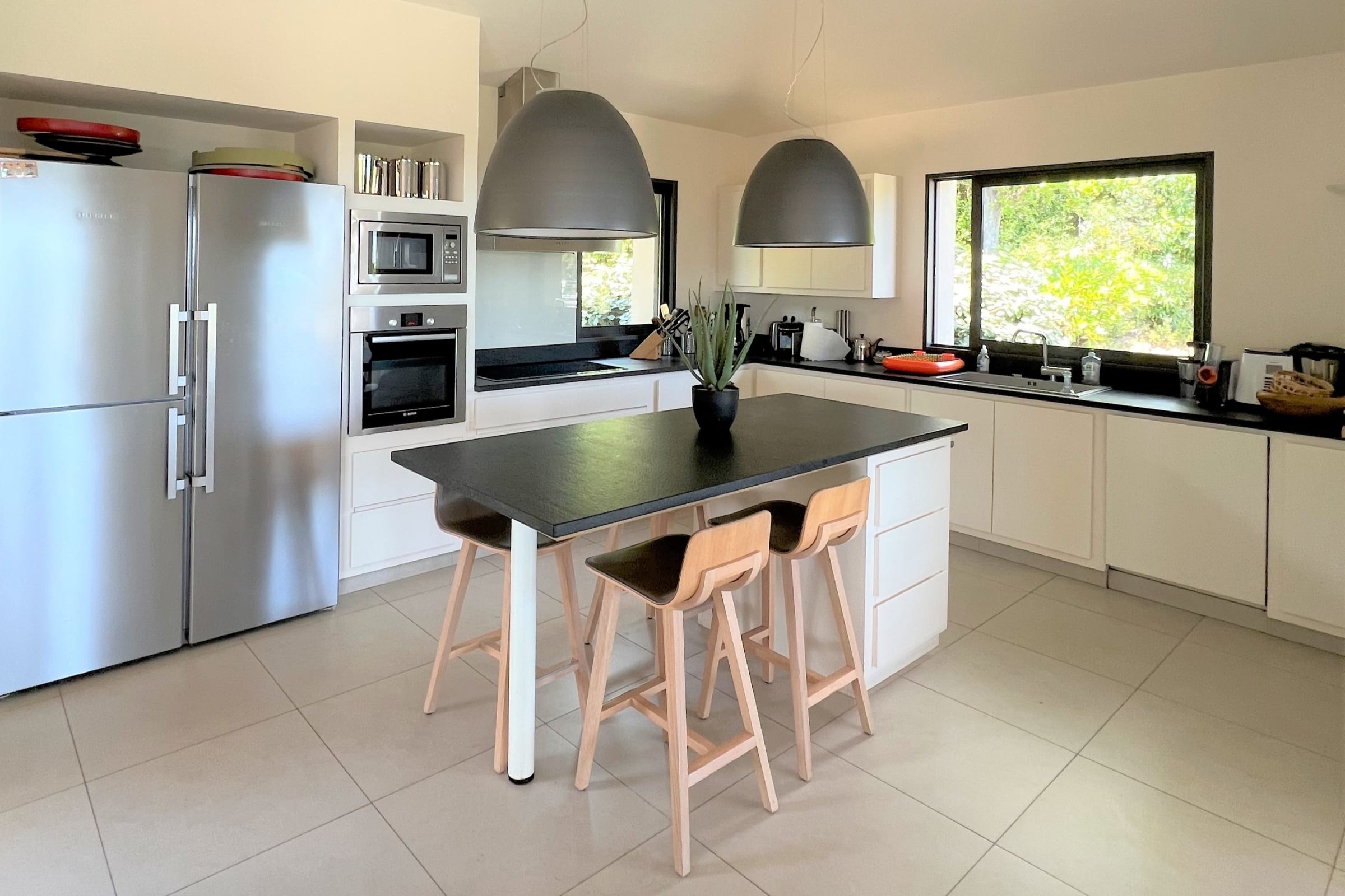 The kitchen is fully equipped with refrigerator, oven, microwave, kettle, Nespresso coffee maker, Magimix filter coffee maker, Magimix robot and food processor, etc.. It is possible to access the main terrace (sea and pool side) and the back terrace of the kitchen.