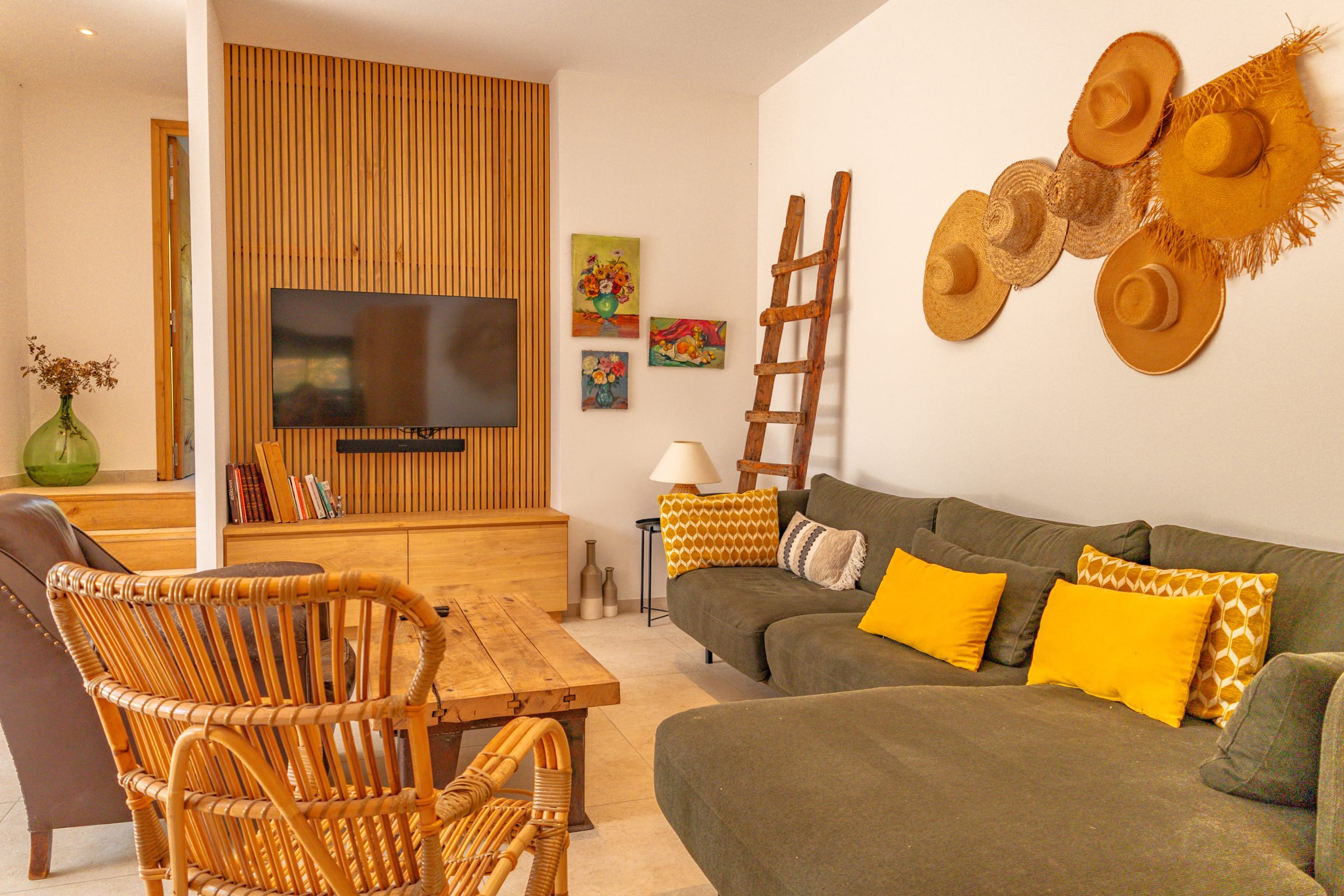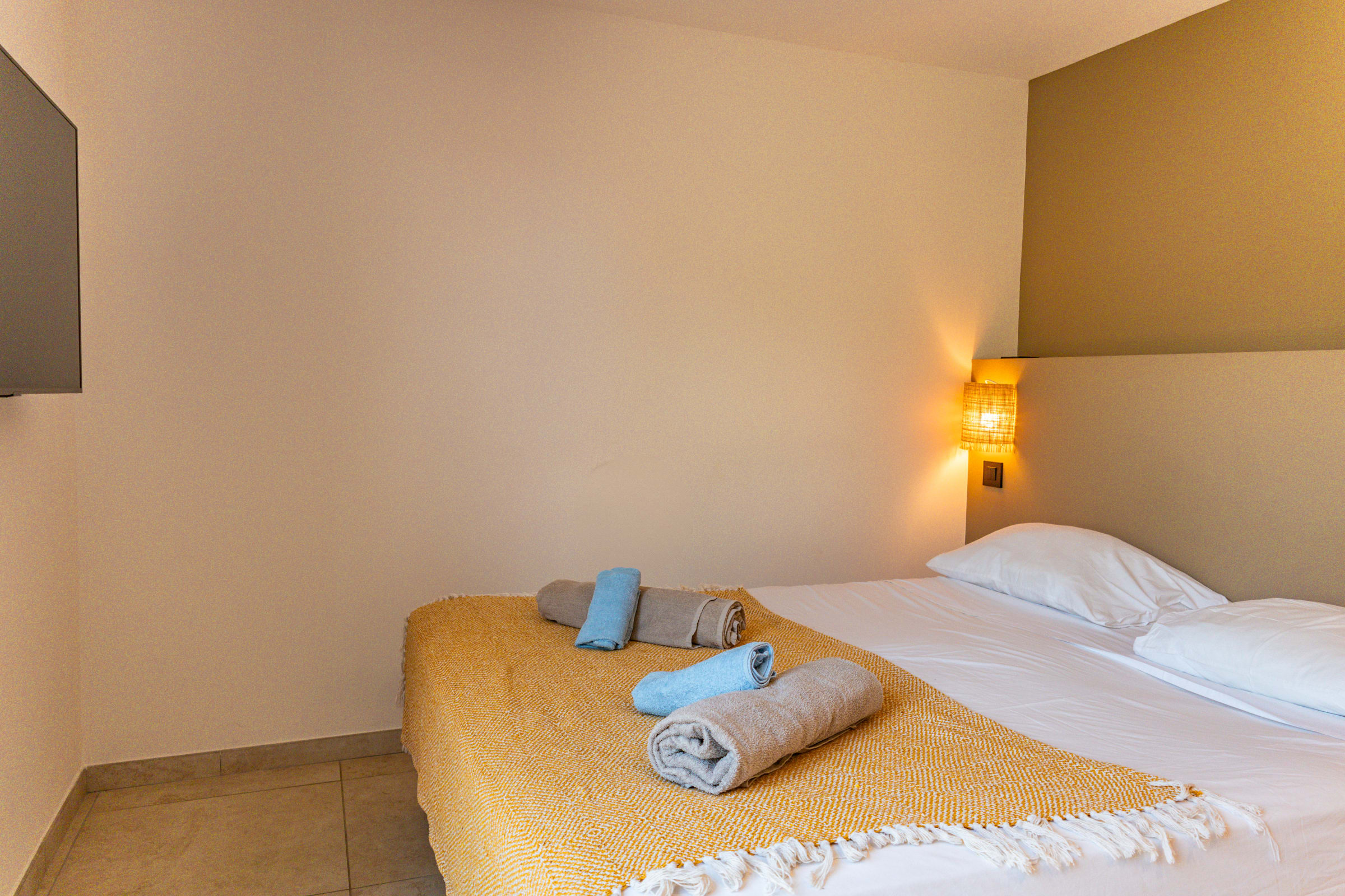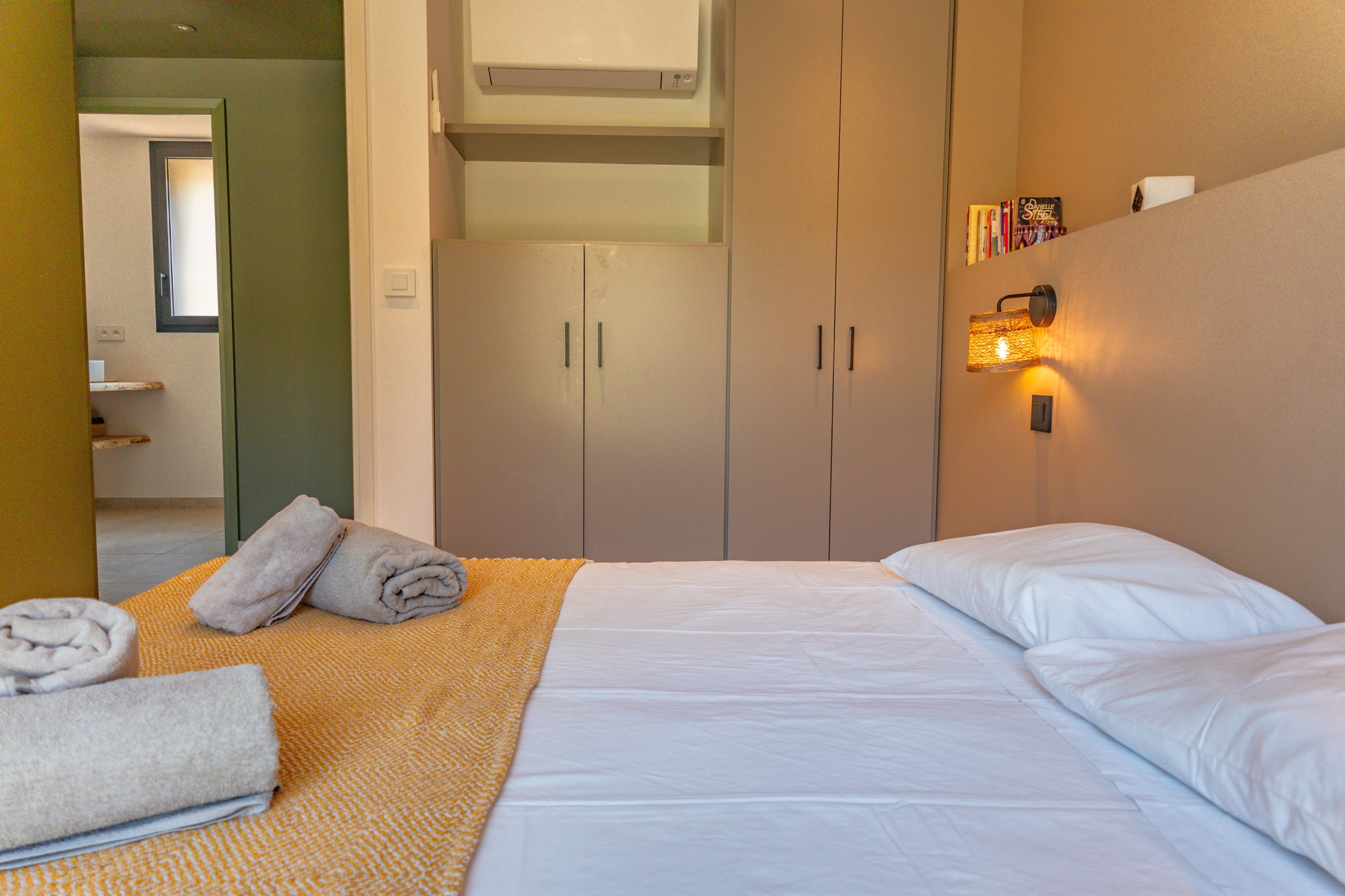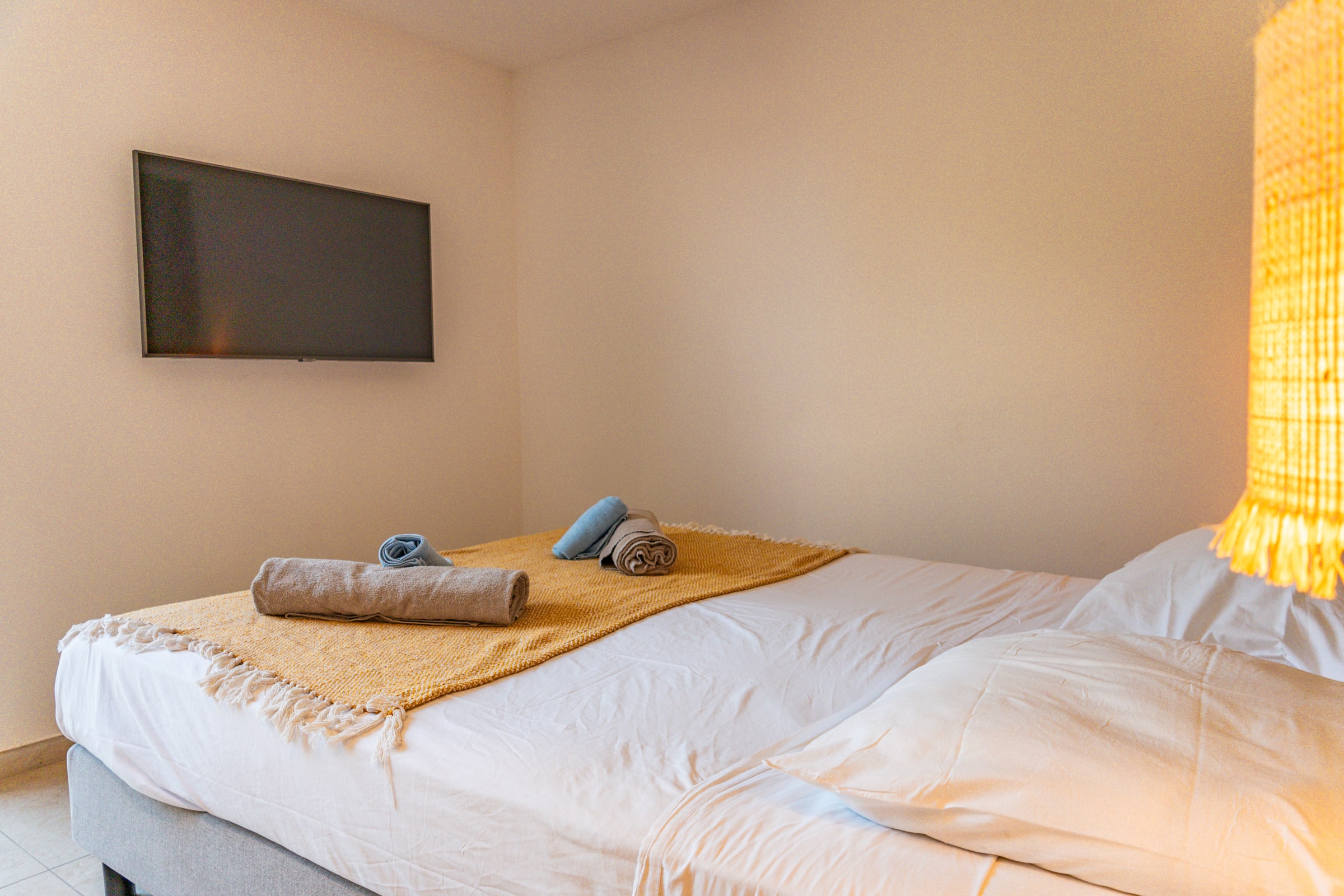 Bedroom 2: Queen Size bed (160 * 200) with TV, access to terrace and swimming pool.