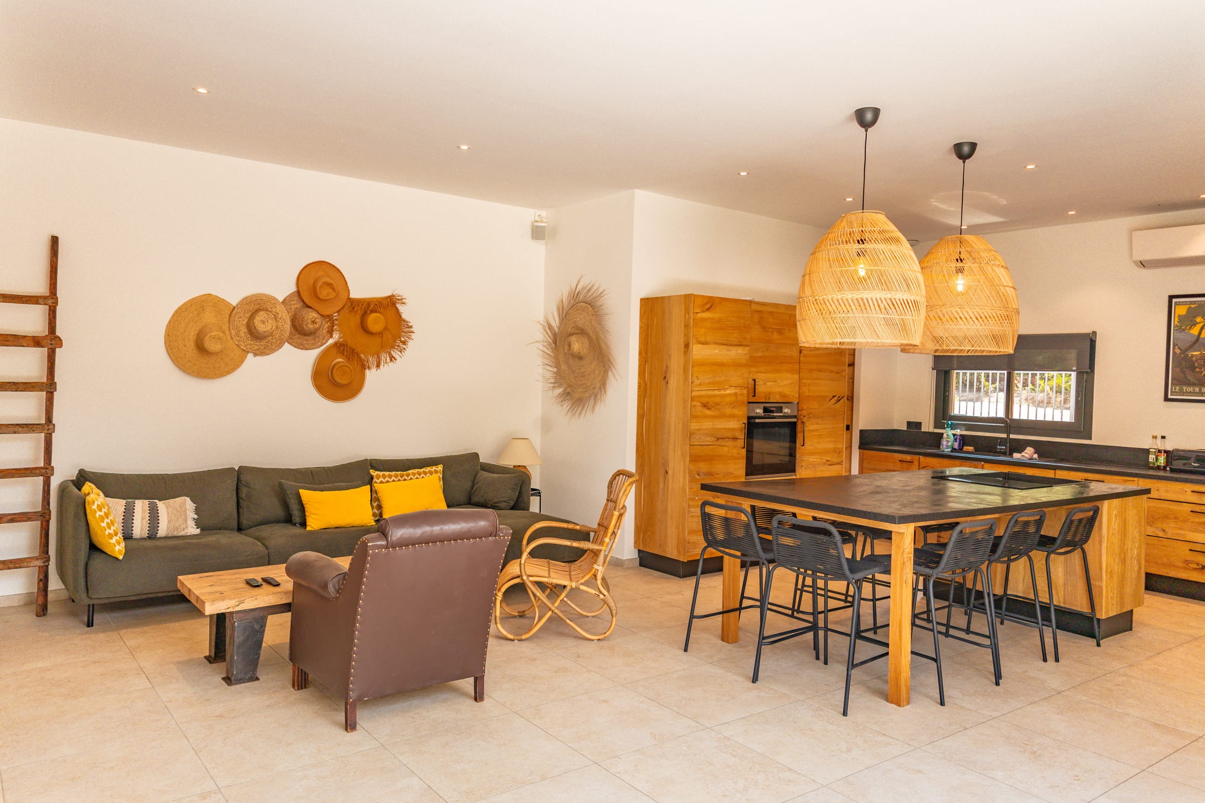 Living / dining room with fully equipped kitchen (fridge, freezer, Nespresso coffee machine and filter, toaster, kettle, orange press, microwave, oven)