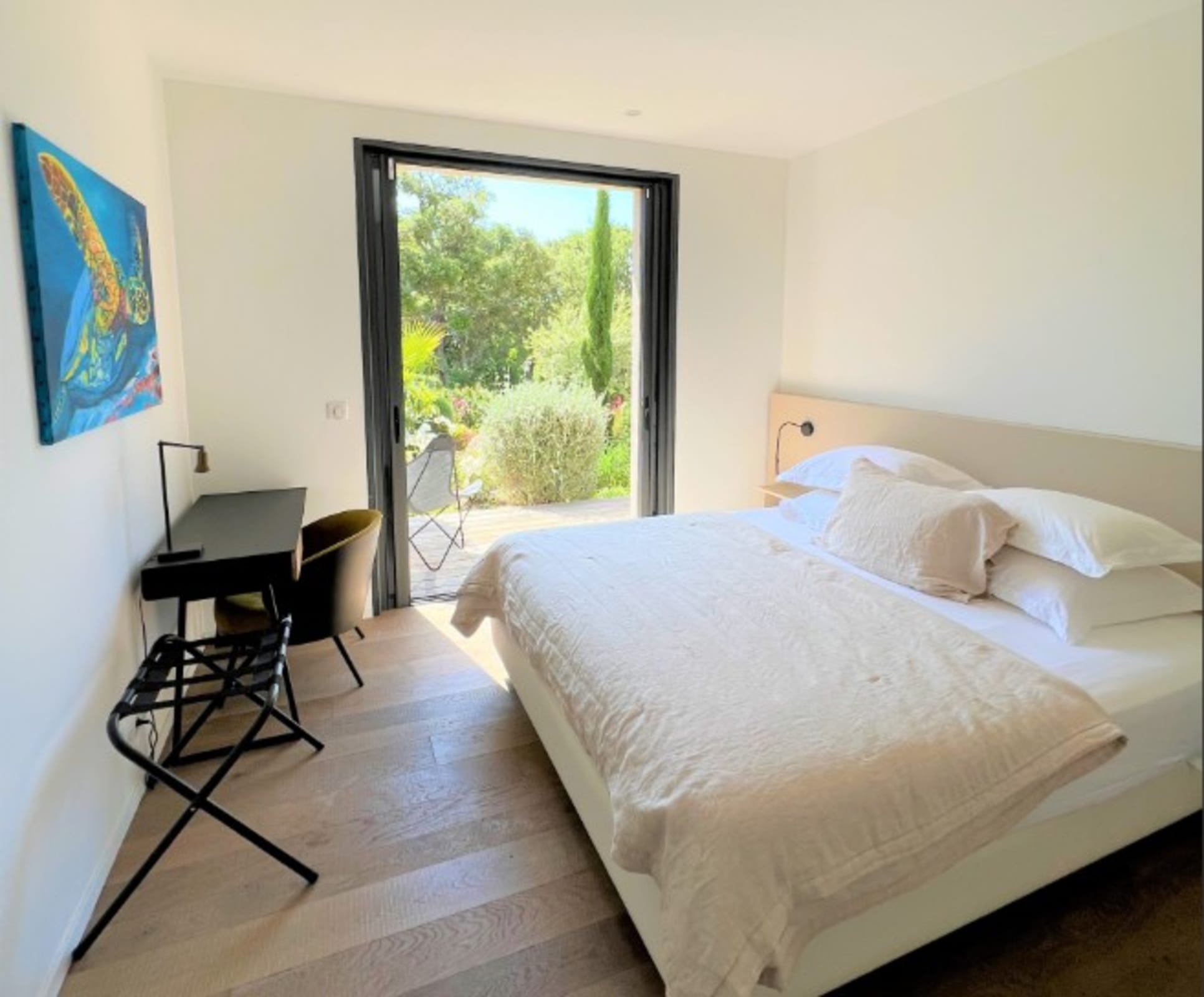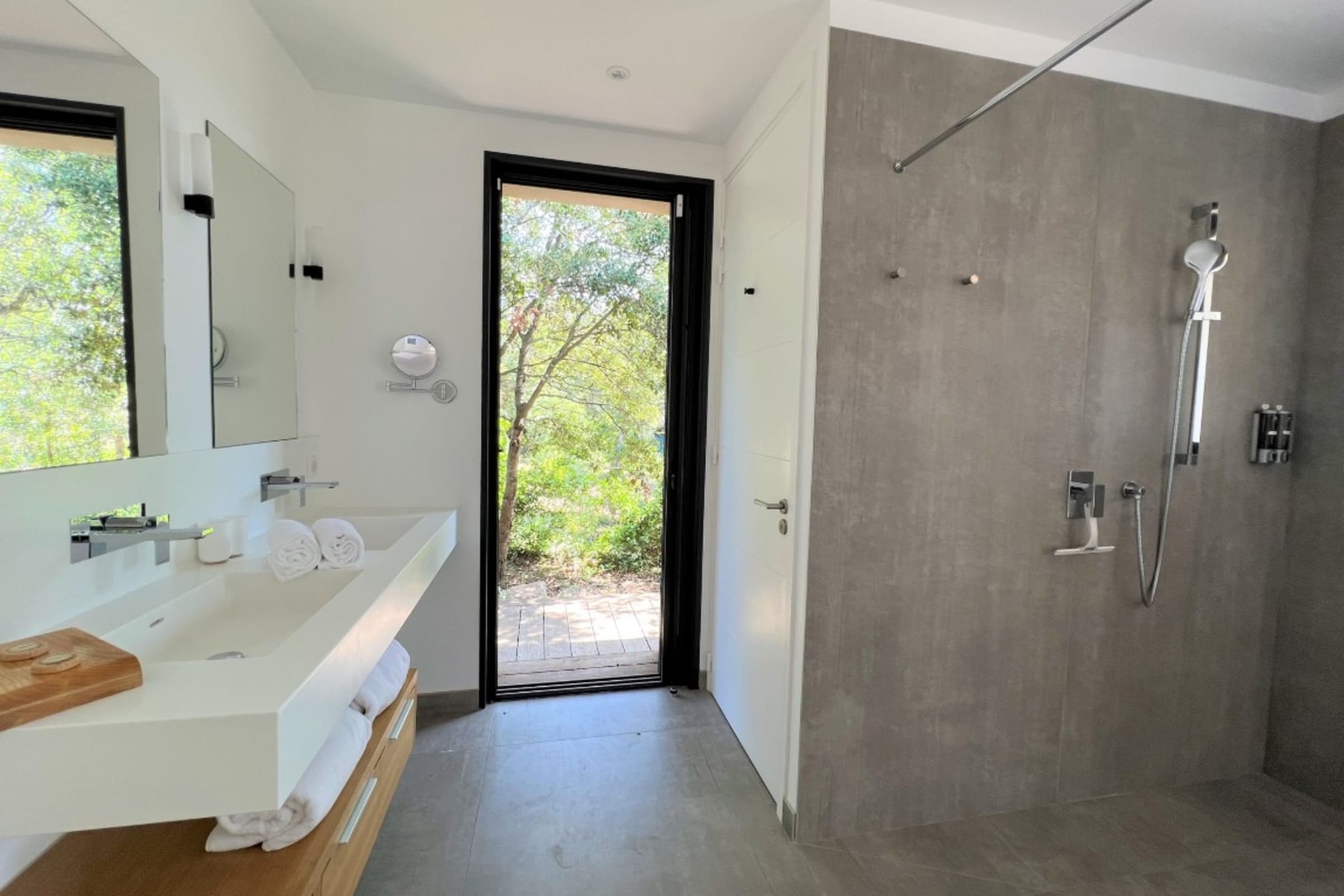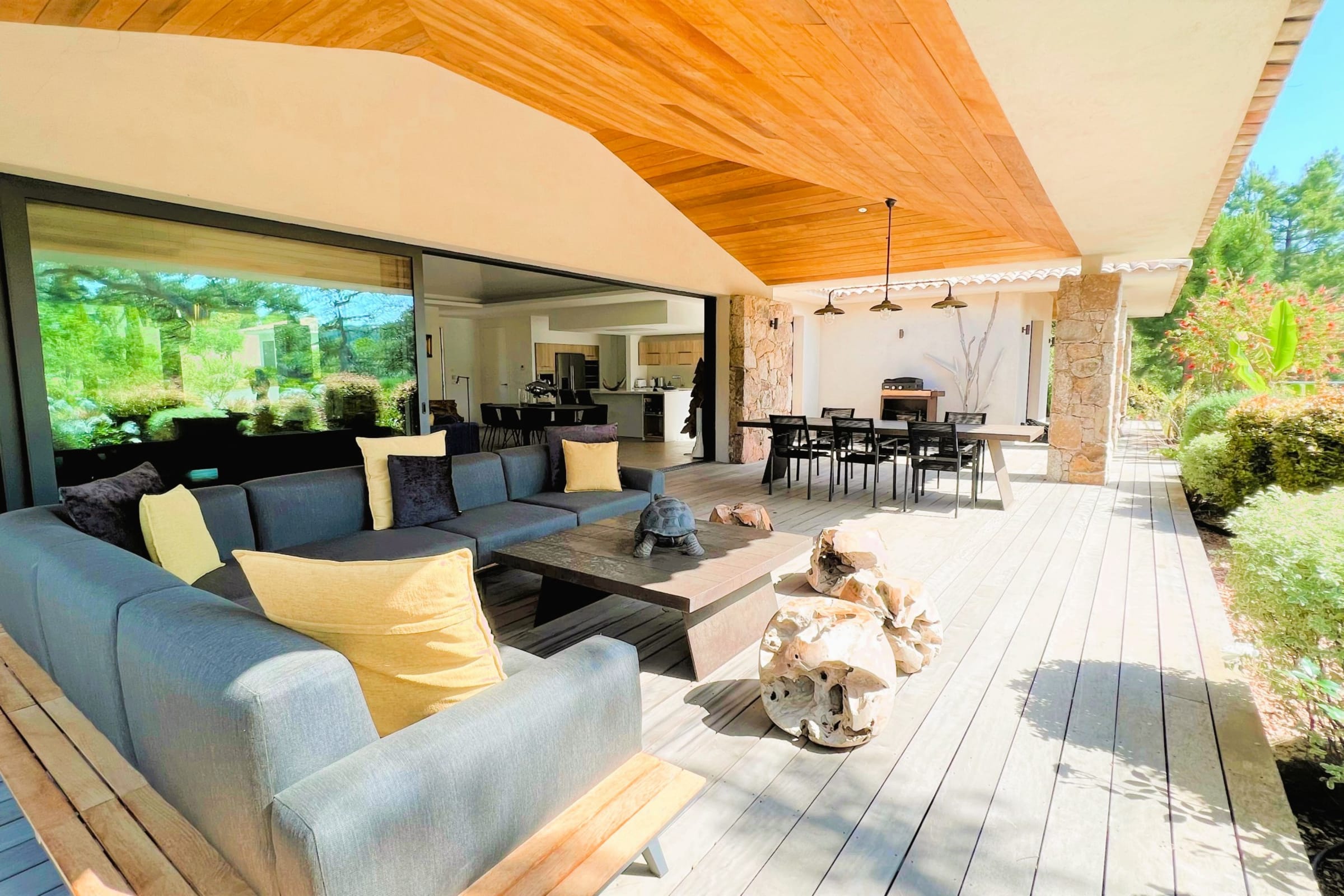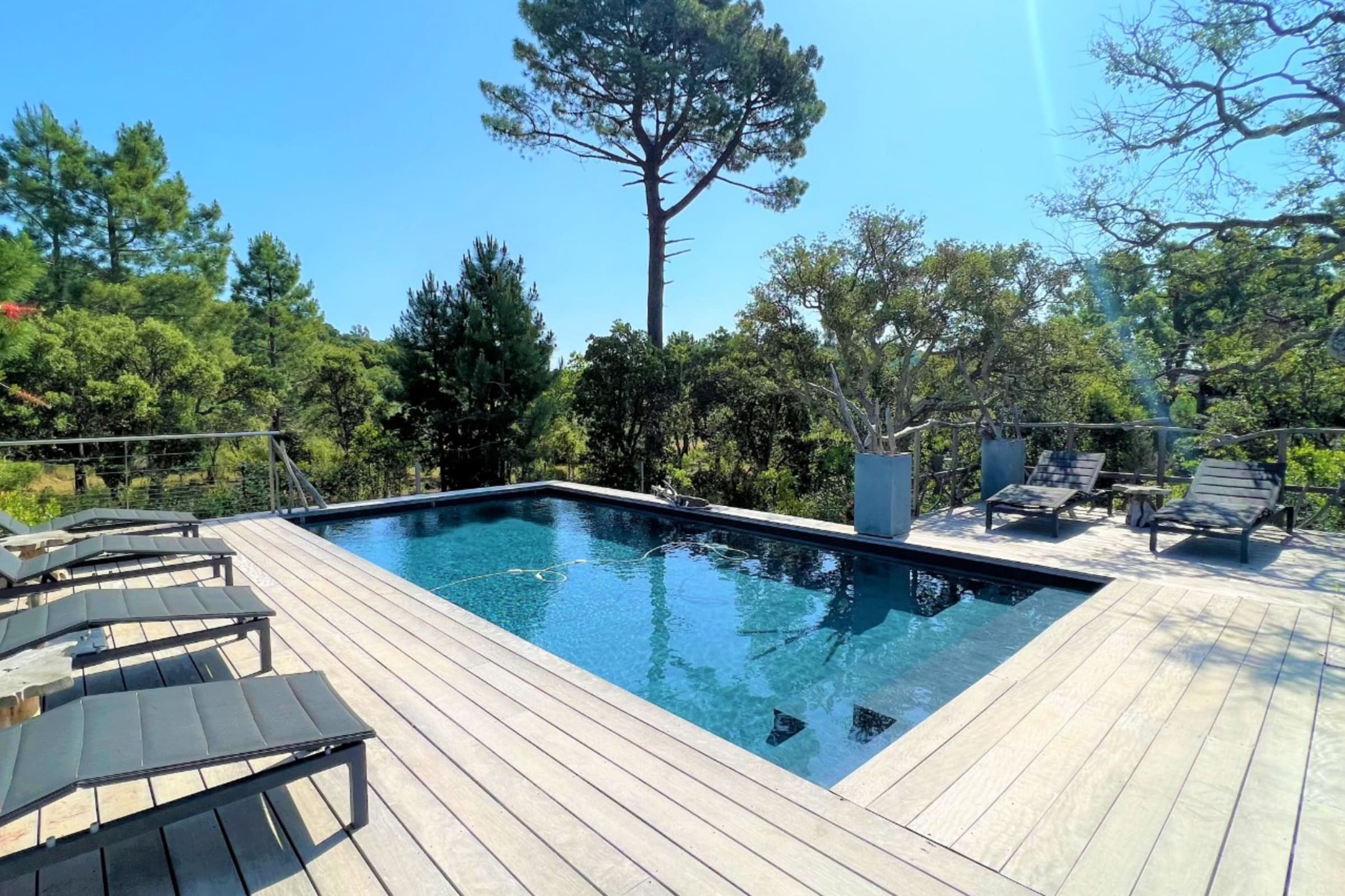 Set in a green setting, surrounded by cork oaks and pines, it is therefore perfectly integrated into the natural landscape with a south orientation, it is surrounded by wooden terraces.