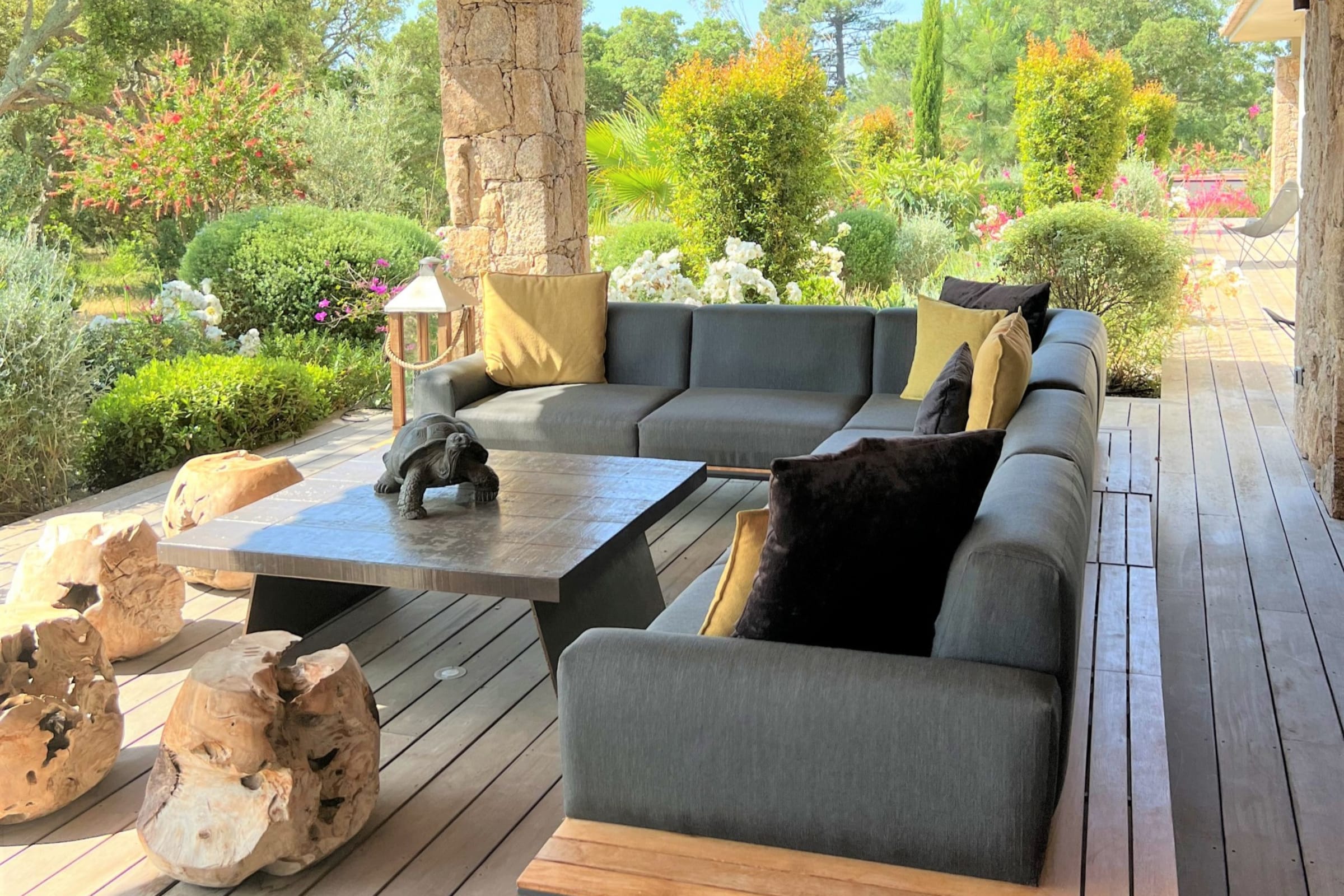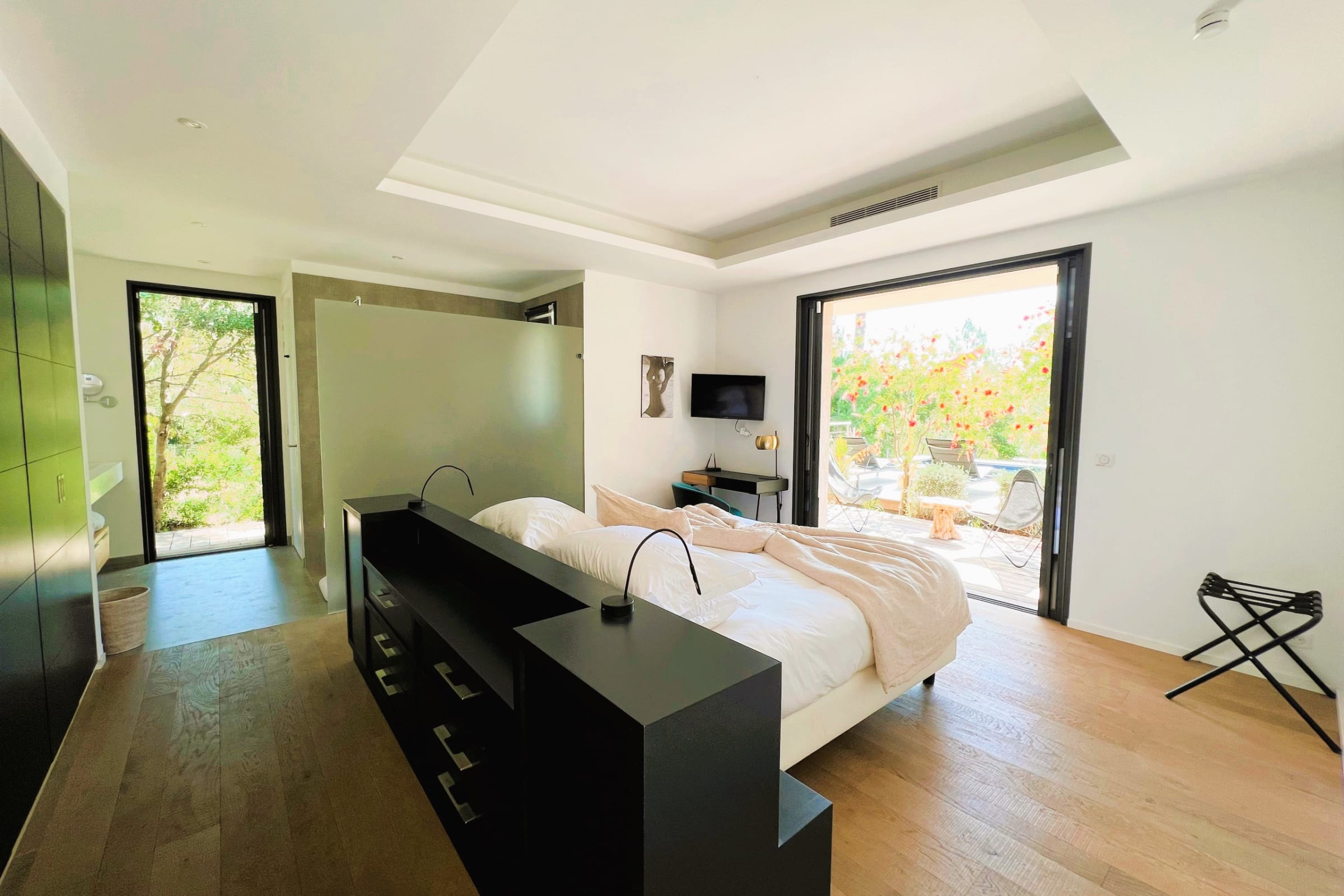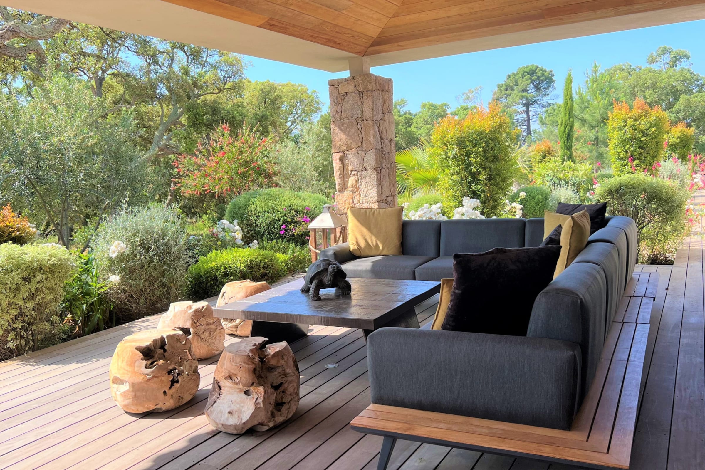 Set in a green setting, surrounded by cork oaks and pines, it is therefore perfectly integrated into the natural landscape with a south orientation, it is surrounded by wooden terraces.