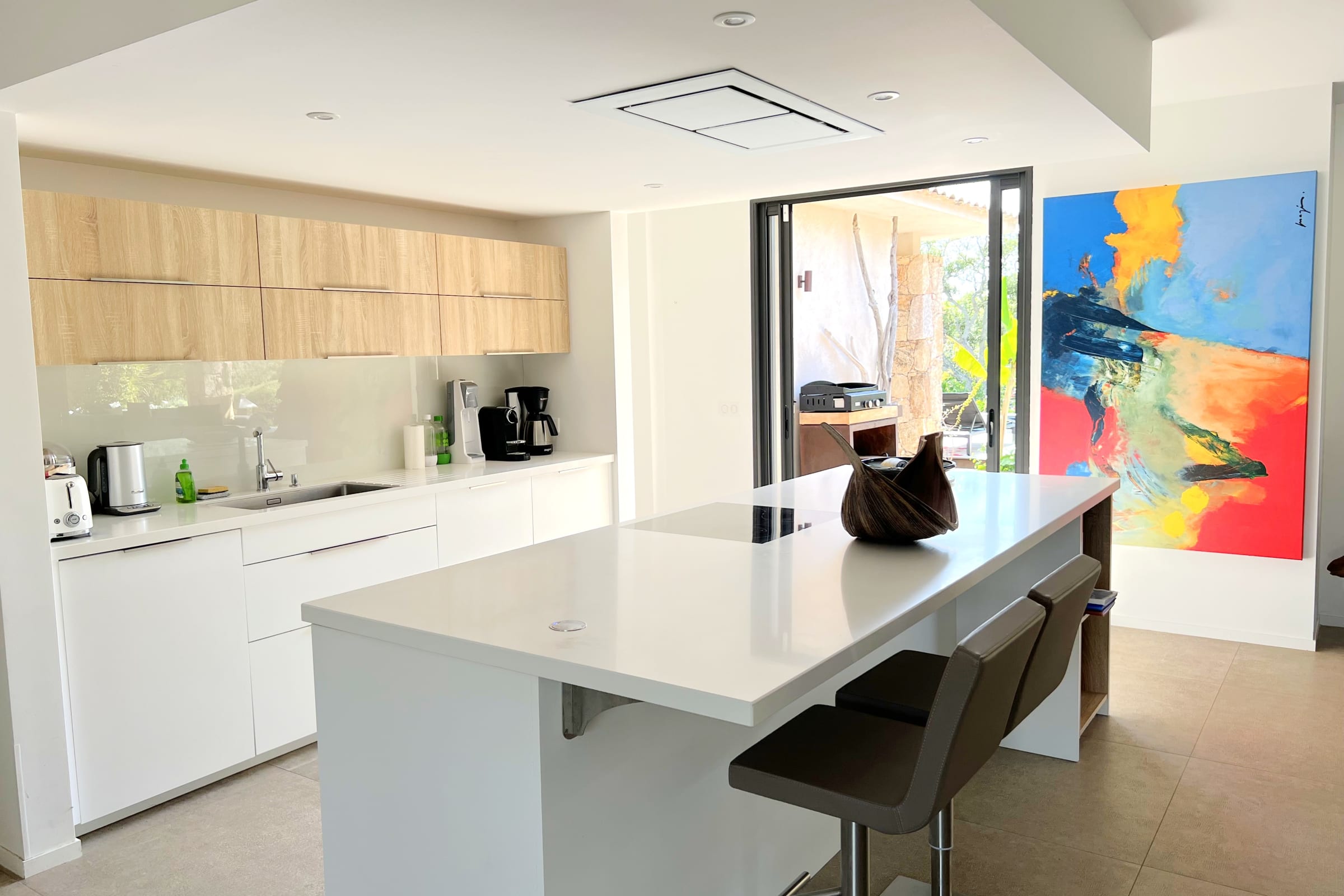 The kitchen is fully equipped (juicer, Nespresso coffee maker, Toaster, filter coffee maker, microwave, freezer, dishwasher, American fridge, oven, microwave, wine fridge, washing machine, dryer)