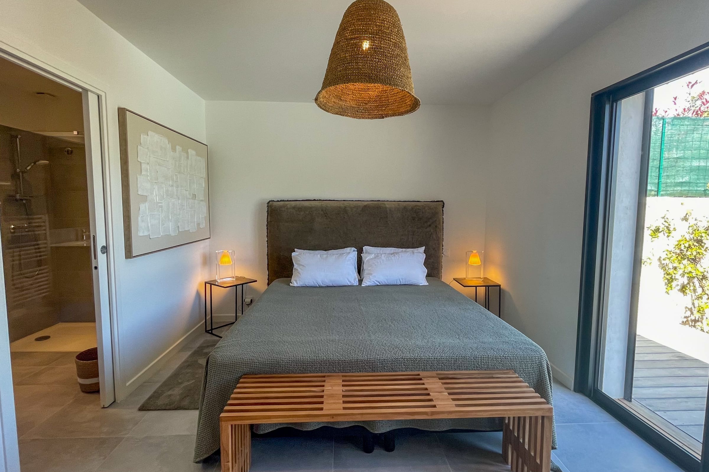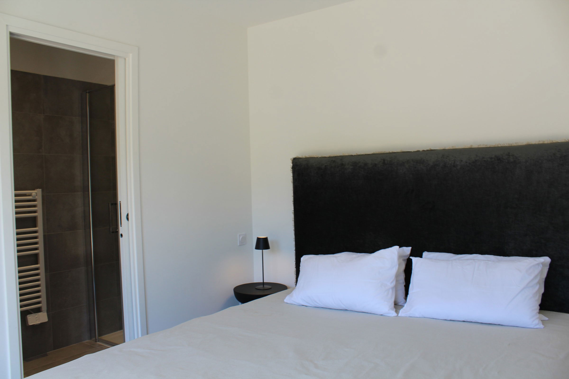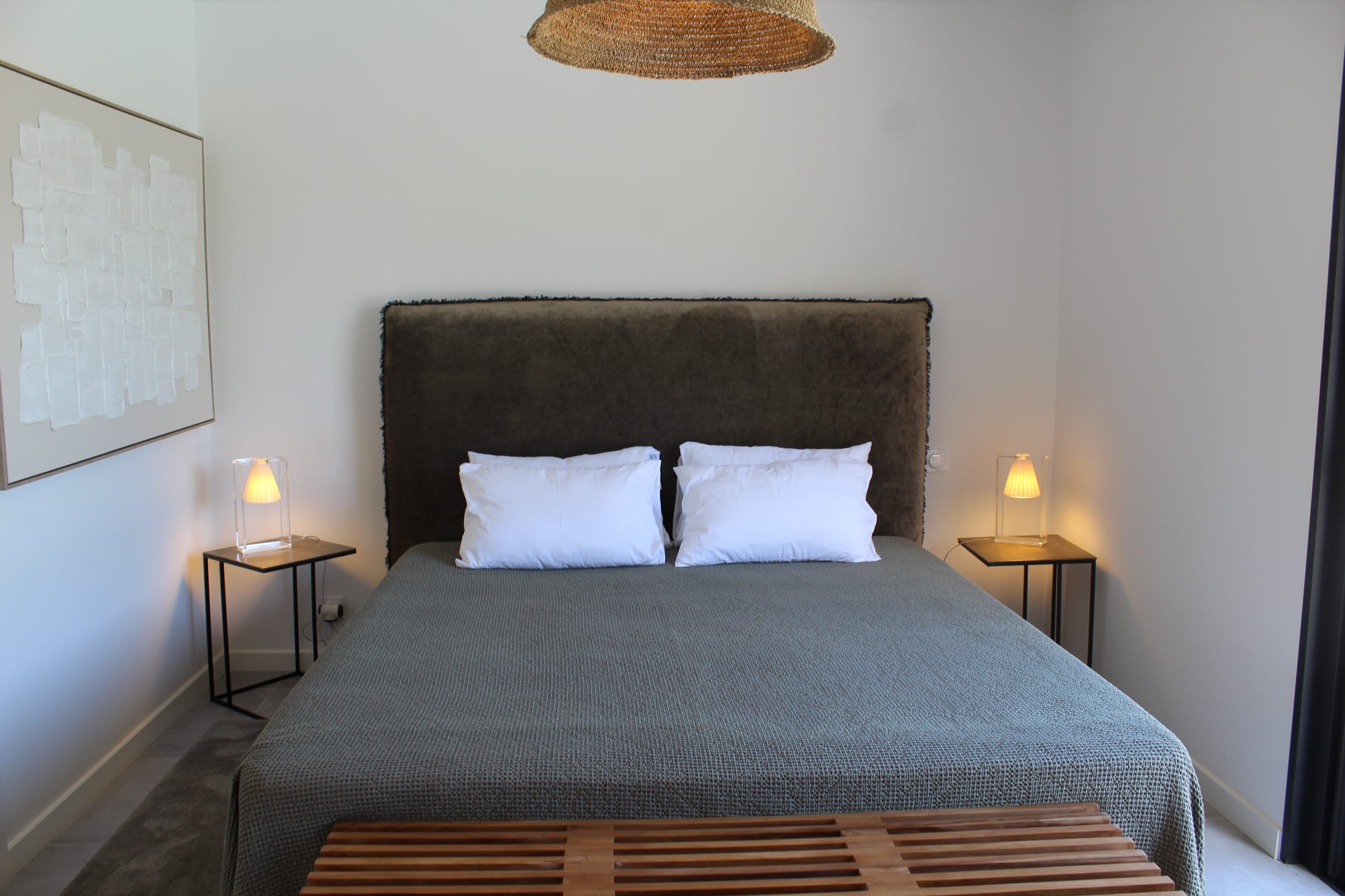 Bedroom 1: premium King size bedding 180x200 with 4K connected 43" TV, with shower room. Access to terrace-garden-swimming pool