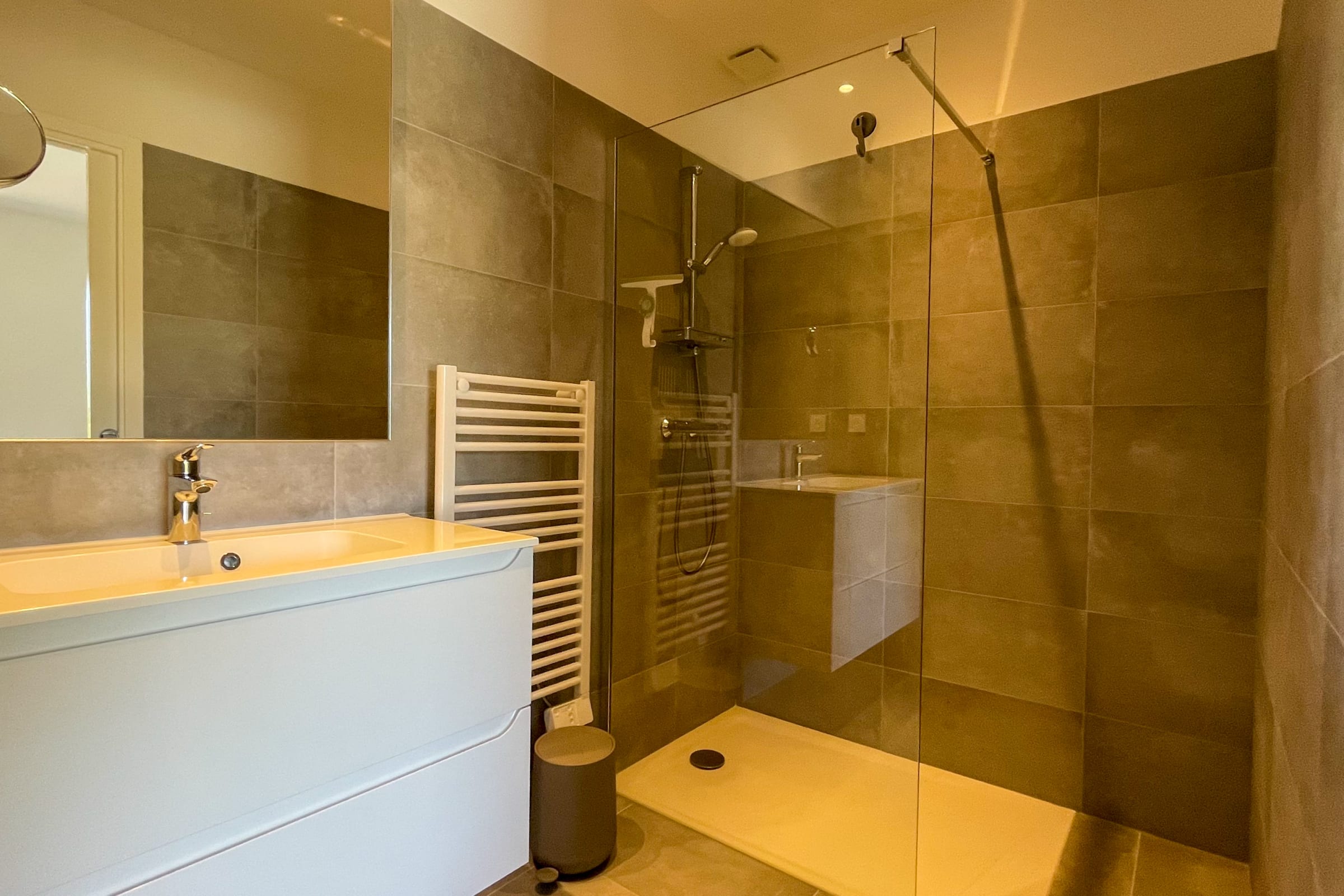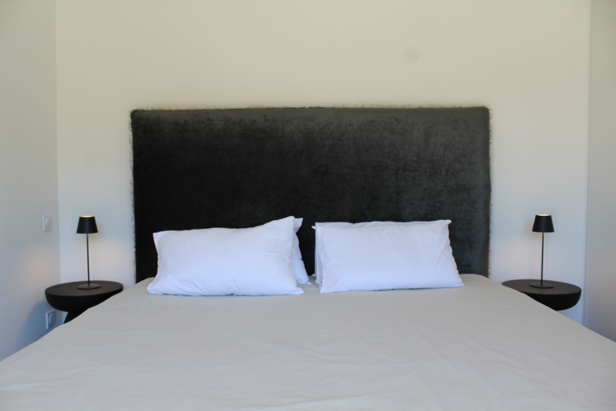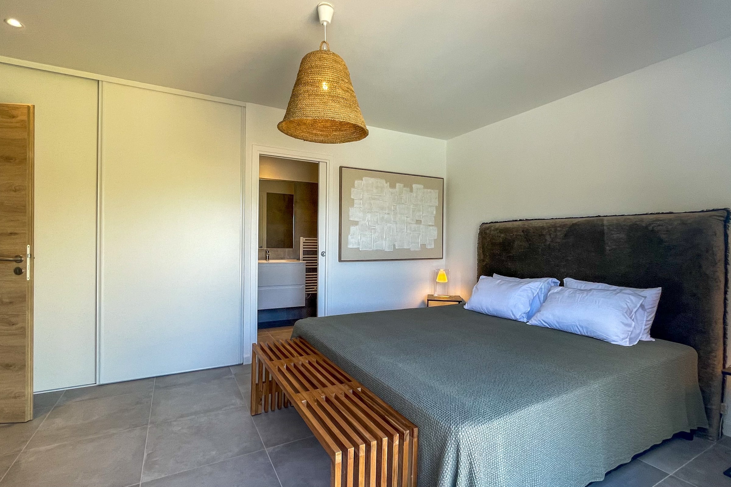 Bedroom 1: premium King size bedding 180x200 with 4K connected 43" TV, with shower room. Access to terrace-garden-swimming pool