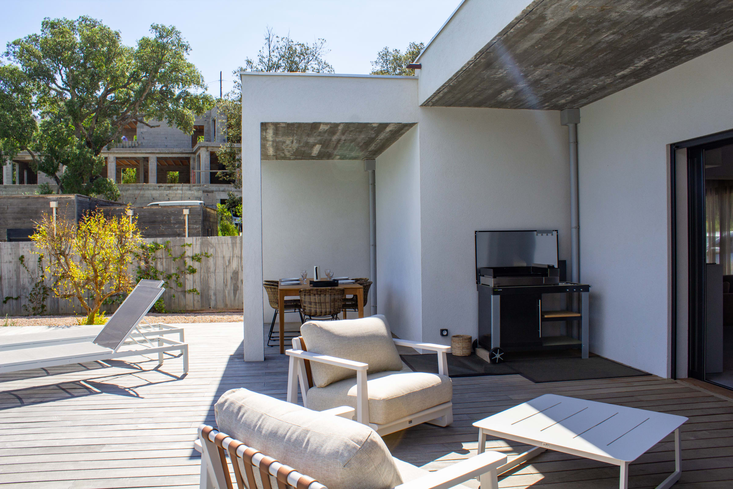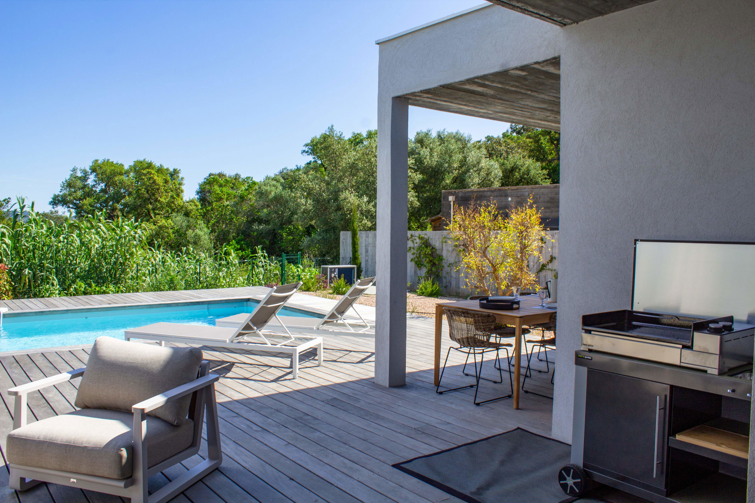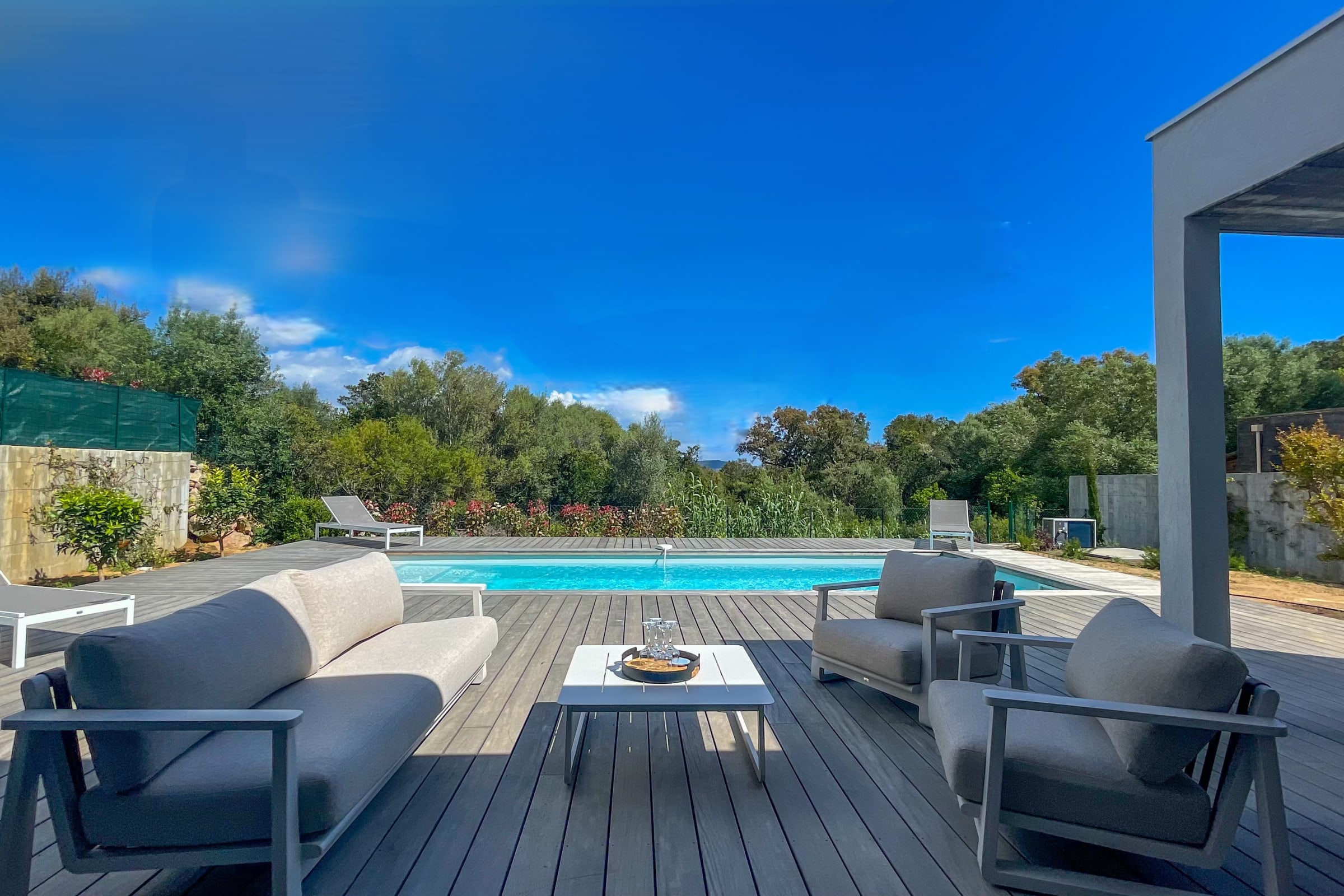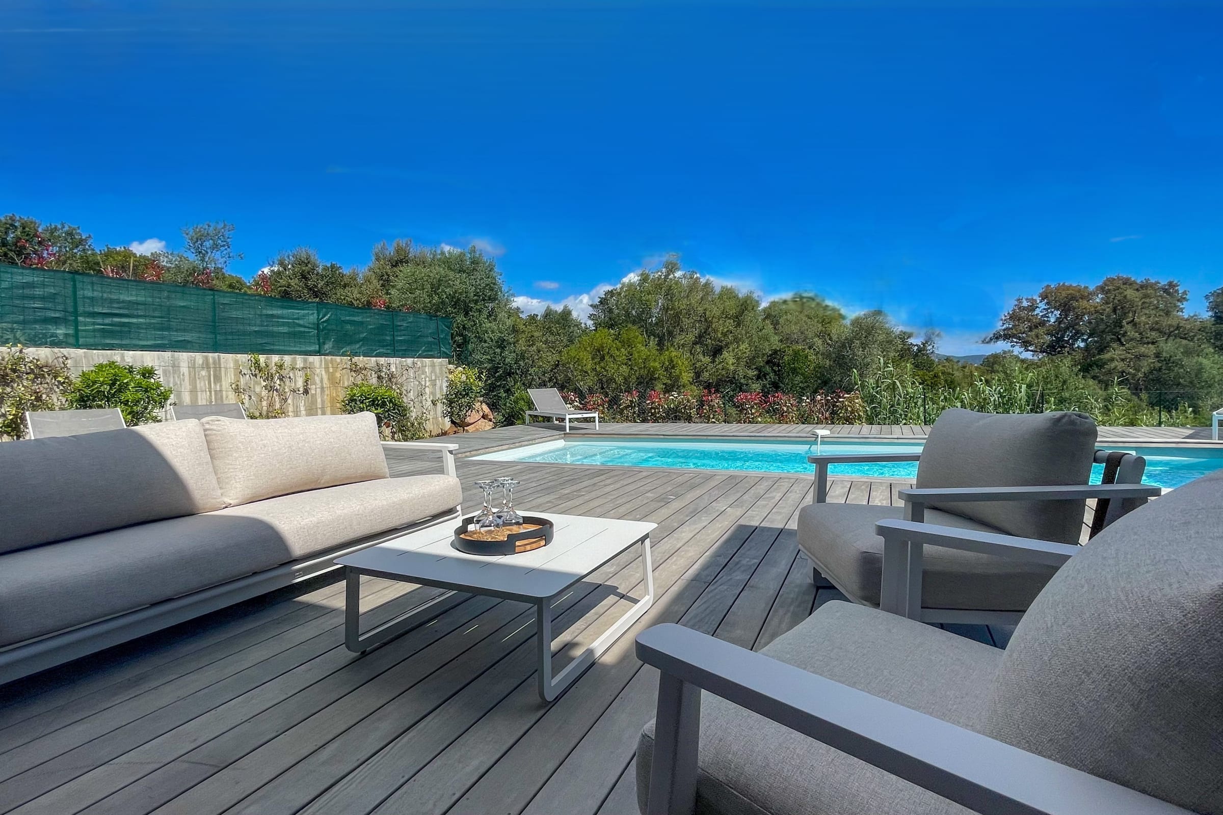The villa has a garden with trees and a terrace that directly overlooks the scrub and the hills. Wooden terrace in ipe of 150 m2 with heated and secure swimming pool of 4x9.